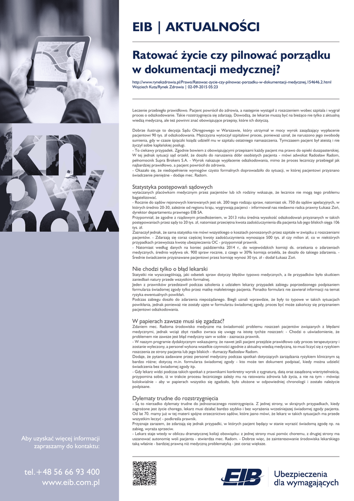 EIB | AKTUALNOŚCI Ratować życie czy pilnować porządku w dokumentacji medycznej? http://www.rynekzdrowia.pl/Prawo/Ratowac-zycie-czy-pilnowac-porzadku-w-dokumentacji-medycznej,154646,2.html Wojciech Kuta/Rynek Zdrowia | 02-09-2015 05:23 Leczenie przebiegło prawidłowo. Pacjent powrócił do zdrowia, a następnie wystąpił z roszczeniem wobec szpitala i wygrał proces o odszkodowanie. Takie rozstrzygnięcia się zdarzają. Dowodzą, że lekarze muszą być na bieżąco nie tylko z aktualną wiedzą medyczną, ale też powinni znać obowiązujące przepisy, które ich dotyczą. Dobrze ilustruje to decyzja Sądu Okręgowego w Warszawie, który utrzymał w mocy wyrok zasądzający wypłacenie pacjentowi 90 tys. zł odszkodowania. Mężczyzna wytoczył szpitalowi proces, ponieważ uznał, że naruszono jego swobodę sumienia, gdy w czasie śpiączki ksiądz udzielił mu w szpitalu ostatniego namaszczenia. Tymczasem pacjent był ateistą i nie życzył sobie kapłańskiej posługi. - To ciekawy przypadek. Zgodnie bowiem z obowiązującymi przepisami każdy pacjent ma prawo do opieki duszpasterskiej. W tej jednak sytuacji sąd orzekł, że doszło do naruszenia dóbr osobistych pacjenta - mówi adwokat Radosław Radom, pełnomocnik Supra Brokers S.A. - Wyrok nakazuje wypłacenie odszkodowania, mimo że proces leczniczy przebiegał jak najbardziej prawidłowo, a pacjent powrócił do zdrowia. - Okazało się, że niedopełnienie wymogów czysto formalnych doprowadziło do sytuacji, w której pacjentowi przyznano świadczenie pieniężne - dodaje mec. Radom. Statystyka postępowań sądowych wytaczanych placówkom medycznym przez pacjentów lub ich rodziny wskazuje, że lecznice nie mogą tego problemu bagatelizować. - Rocznie do sądów rejonowych kierowanych jest ok. 200 tego rodzaju spraw, natomiast ok. 750 do sądów apelacyjnych, w których średnio 20-30, zależnie od regionu kraju, wygrywają pacjenci - informował nas niedawno radca prawny Łukasz Zoń, dyrektor departamentu prawnego EIB SA. Przypomniał, że zgodne z rządowym przedłożeniem, w 2013 roku średnia wysokość odszkodowań przyznanych w takich postępowaniach przez sądy to 20 tys. zł, natomiast przeciętna kwota zadośćuczynienia dla pacjenta lub jego bliskich sięga 106 tys. zł. Zaznaczył jednak, że sama statystka nie mówi wszystkiego o kosztach ponoszonych przez szpitale w związku z roszczeniami pacjentów. - Zdarzają się coraz częściej kwoty zadośćuczynienia wynoszące 500 tys. zł czy milion zł, co w niektórych przypadkach przewyższa kwotę ubezpieczenia OC - przypomniał prawnik. - Natomiast według danych na koniec października 2014 r., do wojewódzkich komisji ds. orzekania o zdarzeniach medycznych, średnio wpływa ok. 900 spraw rocznie, z czego w 30% komisja orzekła, że doszło do takiego zdarzenia. Średnie świadczenie przyznawane pacjentowi przez komisję wynosi 30 tys. zł - dodał Łukasz Zoń. Nie chodzi tylko o błąd lekarski Statystki nie wyszczególniają, jaki odsetek spraw dotyczy błędów typowo medycznych, a ile przypadków było skutkiem zaniedbań natury przede wszystkim formalnej. Jeden z prawników przedstawił podczas szkolenia z udziałem lekarzy przypadek zabiegu poprzedzonego podpisaniem formularza świadomej zgody tylko przez matkę małoletniego pacjenta. Ponadto formularz nie zawierał informacji na temat ryzyka ewentualnych powikłań. Podczas zabiegu doszło do zdarzenia niepożądanego. Biegli uznali wprawdzie, że były to typowe w takich sytuacjach powikłania, jednak ponieważ nie zostały ujęte w formularzu świadomej zgody, proces być może zakończy się przyznaniem pacjentowi odszkodowania. W papierach zawsze musi się zgadzać? Zdaniem mec. Radoma środowisko medyczne ma świadomość problemu roszczeń pacjentów związanych z błędami medycznymi, jednak wciąż zbyt rzadko zwraca się uwagę na istotę tychże roszczeń: - Chodzi o uświadomienie, że problemem nie zawsze jest błąd medyczny sam w sobie - zaznacza prawnik. - W naszym programie dydaktycznym wskazujemy, że nawet jeśli pacjent przejdzie prawidłowo cały proces terapeutyczny i zostanie wyleczony, a personel wykona wszelkie czynności zgodnie z aktualną wiedzą medyczną, to musi liczyć się z ryzykiem roszczenia ze strony pacjenta lub jego bliskich - tłumaczy Radosław Radom. Dodaje, że pytania zadawane przez personel medyczny podczas spotkań dotyczących zarządzania ryzykiem klinicznym są bardzo różne; dotyczą m.in. formularza świadomej zgody - kto może ten dokument podpisać, kiedy można udzielić świadczenia bez świadomej zgody itp. - Gdy lekarz widzi podczas takich spotkań z prawnikami konkretny wyrok z sygnaturą, datą oraz zasądzoną wierzytelnością, przypomina sobie, iż w trakcie procesu leczniczego zależy mu na ratowaniu zdrowia lub życia, a nie na tym - mówiąc kolokwialnie - aby w papierach wszystko się zgadzało, było ułożone w odpowiedniej chronologii i zostało należycie podpisane. Dylematy trudne do rozstrzygnięcia Aby uzyskać więcej informacji zapraszamy do kontaktu: tel.+48 56 66 93 400 www.eib.com.pl - Są to nierzadko dylematy trudne do jednoznacznego rozstrzygnięcia. Z jednej strony, w skrajnych przypadkach, kiedy zagrożone jest życie chorego, lekarz musi działać bardzo szybko i bez wyrażenia wcześniejszej świadomej zgody pacjenta. Od lat 70. mamy już w tej materii spójne orzecznictwo sądów, które jasno mówi, że lekarz w takich sytuacjach ma przede wszystkim leczyć - podkreśla prawnik. Przyznaje zarazem, że zdarzają się jednak przypadki, w których pacjent będący w stanie wyrazić świadomą zgodę np. na zabieg, wyraża sprzeciw. - Lekarz staje wtedy w obliczu dramatycznej kolizji obowiązku: z jednej strony musi pomóc choremu, z drugiej strony ma uszanować autonomię woli pacjenta - stwierdza mec. Radom. - Dobrze więc, że zainteresowanie środowiska lekarskiego taką właśnie - bardziej prawną niż me