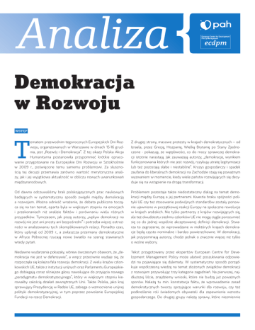Demokracja w Rozwoju Wstęp T ematem przewodnim tegorocznych Europejskich Dni Rozwoju, organizowanych w Warszawie w dniach 15-16 grudnia, jest „Rozwój i Demokracja”. Z tej okazji Polska Akcja Humanitarna postanowiła przypomnieć krótkie opracowanie przygotowane na Europejskie Dni Rozwoju w Sztokholmie w 2009 r., poświęcone temu samemu problemowi. Za słusznością tej decyzji przemawia zarówno wartość merytoryczna analizy, jak i jej wyjątkowa aktualność w obliczu nowych uwarunkowań międzynarodowych. Z drugiej strony, masowe protesty w krajach demokratycznych – od Izraela, przez Grecję, Hiszpanię, Wielką Brytanię po Stany Zjednoczone - pokazują, że wątpliwości, co do mocy sprawczej demokracji istotnie narastają. Jak zauważają autorzy, „demokracje, wynikiem funkcjonowania których nie jest rozwój, ryzykują utratę legitymizacji lub też pozostają słabe i niestabilne”. Kryzys gospodarczy i spadek zaufania do liberalnych demokracji na Zachodzie stają się poważnym wyzwaniem w momencie, kiedy wiele państw rozwijających się decyduje się na wstąpienie na drogę transformacji. Od dawna odczuwaliśmy brak polskojęzycznych prac naukowych badających w systematyczny sposób związki między demokracją a rozwojem. Można odnieść wrażenie, że debata publiczna tocząca się na ten temat, oparta była w większym stopniu na emocjach i przekonaniach niż analizie faktów i porównaniu wielu różnych przypadków. Tymczasem, jak piszą autorzy, „wpływ demokracji na rozwój nie jest ani prosty ani bezpośredni” i potrzeba więcej ostrożności w analizowaniu tych skomplikowanych relacji. Ponadto czas, który upłynął od 2009 r., a zwłaszcza przemiany demokratyczne w Afryce Północnej rzucają nowe światło na szereg stawianych wtedy pytań. Problemem pozostaje także niedostateczny dialog na temat demokracji między Europą a jej partnerami. Kwestia braku spójności polityki UE czy też stosowanie podwójnych standardów zostały ponownie ujawnione w początkowej reakcji Europy na społeczne rewolucje w krajach arabskich. Nie tylko partnerzy z krajów rozwijających się, ale też dwudziestu siedmiu członków UE nie mogą ciągle porozumieć się co do jednej wspólnie akceptowanej definicji demokracji. Stwarza to zagrożenie, że wprowadzane w niektórych krajach demokracje będą czysto nominalne i bardzo powierzchowne. W demokracji, jak przypominają autorzy, chodzi jednak o znacznie więcej niż tylko o wolne wybory. Niedawne wydarzenia pokazały, wbrew ówczesnym obawom, że „demokracja nie jest w defensywie”, a wręcz przeciwnie wydaje się, że rozpoczęła się kolejna fala rozwoju demokracji. Z wielu krajów członkowskich UE, także z instytucji unijnych oraz Parlamentu Europejskiego dobiegają coraz silniejsze głosy nawołujące do przyjęcia nowego „paradygmatu demokratyzacyjnego”, który w większym stopniu kierowałby całością działań zewnętrznych Unii. Także Polska, jako kraj sprawujący Prezydencję w Radzie UE, zabiega o wzmocnienie unijnej polityki demokratyzacyjnej, w tym poprzez powołanie Europejskiej Fundacji na rzecz Demokracji. Tekst przygotowany przez ekspertów European Centre for Development Management Policy może ułatwić poszukiwania odpowiedzi na pojawiające się dylematy. W systematyczny sposób porządkuje współczesną wiedzę na temat złożonych związków demokracji z rozwojem przywołując trzy kategorie zagadnień. Na pierwszej, najdłuższej liście, znajdziemy wnioski, które nie budzą już poważnych sporów. Należą tu min. konstatacja faktu, że wprowadzenie zasad demokratycznych tworzy sprzyjające warunki dla rozwoju, czy też podkreślenie roli świadomych obywateli dla zapewnienia wzrostu gospodarczego. Do drugiej grupy należą sprawy, które niezmiennie Analiza | 2 wywołują silne kontrowersje, jak nierozstrzygnięte pytanie o związek przyczynowo-skutkowy między demokracją a rozwojem. W końcu zwraca się uwagę na zagadnienia zaniedbane, którym niesłusznie nie poświęcano dotąd należytej uwagi. To przede wszystkim ważny postulat wzmocnienia krajowych systemów podatkowych, jako elementu niezbędnego zarówno dla demokracji, jak i rozwoju. Szczególnie interesujący dla czytelników będzie szczegółowy opis czterech metod, które mogą sprawiać, że demokracja doprowadzi do lepszych wyników rozwojowych: 1) przyjęcie realistycznego i długoterminowego podejścia, 2) pogłębianie demokracji, 3) wzmacnianie zdolności państwa oraz 4) dookreślenie roli aktorów zewnętrznych we wspieraniu przemian demokratycznych. Chociaż lista ta nie jest wyczerpująca, a ostatnie wydarzenia z pewnością dodały nowych obserwacji i rozwiązań, wzięcie ich pod uwagę może pozwolić czasem na uniknięcie wyważania otwartych drzwi. Demokracja w rozwoju jest warunkiem koniecznym rozwoju, ale może zdecydowanie pomóc w jego przyspieszeniu i równiejszym rozdystrybuowaniu korzyści. Rozwój, jak pokazuje przykład Indii, nie jest koniecznym warunkiem demokracji, ale ułatwia konsolidacje demokratycznych standardów i procedur. Czytając tekst nie możemy zapominać, że ostatecznym celem współpracy rozwojowej powinny być redukcja ubóstwa i realizacja Milenijnych Celów Rozwoju, a w dłuższej perspektywie także zmniejszanie dysproporcji rozwojowych między bogatą Północą i biednym Południem. Jeżeli jednak zarówno zbytnia koncentracja na demokracji (podejście normatywne), jak i na rozwoju nie są zbyt obiecujące, jak sugerują autorzy, potrzebujemy strategii, która „umożliwi jednoczesne pogłębienie demokracji i poprawę wyników rozwojowych”. Jeżeli uda się umiejętnie połączyć te dwa elementy może pozwolić to nie tylko na zwiększenie skuteczności pomocy rozwojowej, ale też przyczyni się do budowy bardziej sprawiedliwego i bezpieczniejszego świata. Arabska Wiosna i „zachodnia jesień” na nowo ożywiły rozważania na temat znaczenia demok