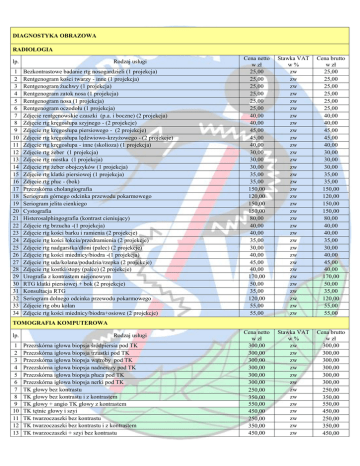 DIAGNOSTYKA OBRAZOWA RADIOLOGIA Rodzaj usługi lp. 1 2 3 4 5 6 7 8 9 10 11 12 13 14 15 16 17 18 19 20 21 22 23 24 25 26 27 28 29 30 31 32 33 34 Bezkontrastowe badanie rtg nosogardzieli (1 projekcja) Rentgenogram kości twarzy - inne (1 projekcja) Rentgenogram żuchwy (1 projekcja) Rentgenogram zatok nosa (1 projekcja) Rentgenogram nosa (1 projekcja) Rentgenogram oczodołu (1 projekcja) Zdjęcie rentgenowskie czaszki (p.a. i boczne) (2 projekcja) Zdjęcie rtg kręgosłupa szyjnego - (2 projekcje) Zdjęcie rtg kręgosłupa piersiowego - (2 projekcje) Zdjęcie rtg kręgosłupa lędźwiowo-krzyżowego - (2 projekcje) Zdjęcie rtg kręgosłupa - inne (skolioza) (1 projekcja) Zdjęcie rtg żeber (1 projekcja) Zdjęcie rtg mostka (1 projekcja) Zdjęcie rtg żeber obojczyków (1 projekcja) Zdjęcie rtg klatki piersiowej (1 projekcja) Zdjęcie rtg płuc - (bok) Przezskórna cholangiografia Seriogram górnego odcinka przewodu pokarmowego Seriogram jelita cienkiego Cystografia Histerosalphingografia (kontrast cieniujący) Zdjęcie rtg brzucha -(1 projekcja) Zdjęcie rtg kości barku i ramienia (2 projekcje) Zdjęcie rtg kości łokcia/przedramienia (2 projekcje) Zdjęcie rtg nadgarstka/dłoni (palec) (2 projekcje) Zdjęcie rtg kości miednicy/biodra -(1 projekcja) Zdjęcie rtg uda/kolana/podudzia/rzepka (2 projekcje) Zdjęcie rtg kostki/stopy (palce) (2 projekcje) Urografia z kontrastem niejonowym RTG klatki piersiowej + bok (2 projekcje) Konsultacja RTG Seriogram dolnego odcinka przewodu pokarmowego Zdjęcie rtg obu kolan Zdjęcie rtg kości miednicy/biodra+osiowe (2 projekcje) Cena netto w zł 25,00 25,00 25,00 25,00 25,00 25,00 40,00 40,00 45,00 45,00 40,00 30,00 30,00 30,00 35,00 35,00 150,00 120,00 150,00 150,00 80,00 40,00 40,00 35,00 30,00 40,00 45,00 40,00 170,00 50,00 35,00 120,00 55,00 55,00 Stawka VAT w% zw zw zw zw zw zw zw zw zw zw zw zw zw zw zw zw zw zw zw zw zw zw zw zw zw zw zw zw zw zw zw zw zw zw Cena brutto w zł 25,00 25,00 25,00 25,00 25,00 25,00 40,00 40,00 45,00 45,00 40,00 30,00 30,00 30,00 35,00 35,00 150,00 120,00 150,00 150,00 80,00 40,00 40,00 35,00 30,00 40,00 45,00 40,00 170,00 50,00 35,00 120,00 55,00 55,00 Cena netto w zł 300,00 300,00 300,00 300,00 300,00 300,00 250,00 350,00 550,00 450,00 250,00 350,00 450,00 Stawka VAT w% zw zw zw zw zw zw zw zw zw zw zw zw zw Cena brutto w zł 300,00 300,00 300,00 300,00 300,00 300,00 250,00 350,00 550,00 450,00 250,00 350,00 450,00 TOMOGRAFIA KOMPUTEROWA lp. 1 2 3 4 5 6 7 8 9 10 11 12 13 Rodzaj usługi Przezskórna igłowa biopsja śródpiersia pod TK Przezskórna igłowa biopsja trzustki pod TK Przezskórna igłowa biopsja wątroby pod TK Przezskórna igłowa biopsja nadnerczy pod TK Przezskórna igłowa biopsja płuca pod TK Przezskórna igłowa biopsja nerki pod TK TK głowy bez kontrastu TK głowy bez kontrastu i z kontrastem TK głowy + angio TK głowy z kontrastem TK tętnic głowy i szyi TK twarzoczaszki bez kontrastu TK twarzoczaszki bez kontrastu i z kontrastem TK twarzoczaszki + szyi bez kontrastu 14 15 16 17 18 19 20 21 22 TK twarzoczaszki + szyi z kontrastem TK szyi bez kontrastu TK szyi bez kontrastu i z kontrastem TK szyi bez kontrastu i co najmniej dwie fazy z kontrastem TK głowy z kontrastem TK klatki piersiowej bez kontrastu TK klatki piersiowej bez kontrastu i z kontrastem TK klatki piersiowej + TK jamy brzusznej bez kontrastu TK klatki piersiowej + TK jamy brzusznej z kontrastem TK klatki piersiowej + TK jamy brzusznej lub miednicy małej bez kontrastu i co 23 najmniej dwie fazy z kontrastem 650,00 250,00 350,00 350,00 300,00 320,00 420,00 650,00 750,00 zw zw zw zw zw zw zw zw zw 650,00 250,00 350,00 350,00 300,00 320,00 420,00 650,00 750,00 850,00 zw 850,00 24 TK klatki piersiowej + TK jamy brzusznej + miednicy bez kontrastu 750,00 zw 750,00 25 26 27 28 29 30 31 850,00 450,00 320,00 250,00 370,00 550,00 660,00 zw zw zw zw zw zw zw 850,00 450,00 320,00 250,00 370,00 550,00 660,00 370,00 zw 370,00 450,00 250,00 350,00 250,00 350,00 450,00 300,00 350,00 300,00 350,00 300,00 350,00 90,00 zw zw zw zw zw zw zw zw zw zw zw zw zw 450,00 250,00 350,00 250,00 350,00 450,00 300,00 350,00 300,00 350,00 300,00 350,00 90,00 Cena netto w zł 500,00 600,00 620,00 680,00 500,00 600,00 500,00 600,00 650,00 550,00 670,00 500,00 Stawka VAT w% zw zw zw zw zw zw zw zw zw zw zw zw Cena brutto w zł 500,00 600,00 620,00 680,00 500,00 600,00 500,00 600,00 650,00 550,00 670,00 500,00 650,00 zw 650,00 500,00 zw 500,00 500,00 zw 500,00 600,00 zw 600,00 32 33 34 35 36 37 38 39 40 41 42 43 44 45 TK klatki piersiowej + TK jamy brzusznej + miednicy z kontrastem TK tętnic klatki piersiowej (w tym aorta) Komputerowa tomografia nerek TK jamy brzusznej lub miednicy małej bez kontrastu TK jamy brzusznej lub miednicy małej bez kontrastu i z kontrastem TK jamy brzusznej + miednicy bez kontrastu TK jamy brzusznej + miednicy z kontrastem TK jamy brzusznej lub miednicy małej bez kontrastu i co najmniej dwie fazy z kontrastem TK tętnic jamy brzusznej (w tym aorta) TK kończyny górnej bez kontrastu TK kończyny górnej bez kontrastu i z kontrastem TK kończyny dolnej bez kontrastu TK kończyny dolnej bez kontrastu i z kontrastem TK tętnic kończyn TK kręgosłupa szyjnego bez kontrastu TK kręgosłupa szyjnego bez kontrastu i z kontrastem TK kręgosłupa piersiowego bez kontrastu TK kręgosłupa piersiowego bez kontrastu i z kontrastem TK kręgosłupa lędźwiowo-krzyżowego bez kontrastu TK kręgosłupa lędźwiowo-krzyżowego bez kontrastu i z kontrastem Konsultacja TK REZONANS MAGNETYCZNY lp. Rodzaj usługi 1 2 3 4 5 6 7 8 9 10 11 12 RM głowy bez kontrastu RM głowy + Angiografia bez kontrastu RM głowy bez kontrastu i z kontrastem RM głowy + Angiografia z kontrastem RM kończyny górnej bez kontrastu RM kończyny górnej bez kontrastu i z kontrastem RM kończyny dolnej bez kontrastu RM kończyny dolnej bez kontrastu i z kontrastem Badanie czynnościowe mózgu RM klatki piersiowej bez kontrastu RM klatki piersiowej bez kontrastu i z kont