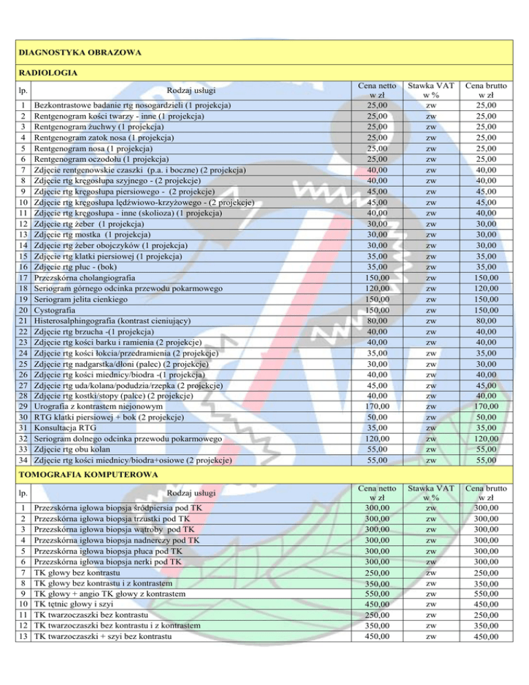 DIAGNOSTYKA OBRAZOWA RADIOLOGIA lp. Rodzaj usługi Cena
