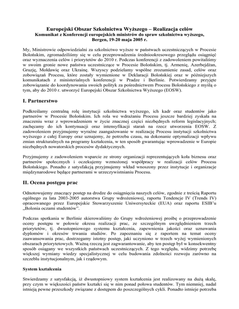 Europejski Obszar Szkolnictwa Wyższego – Realizacja celów Komunikat z Konferencji europejskich ministrów do spraw szkolnictwa wyższego, Bergen, 19-20 maja 2005 r. My, Ministrowie odpowiedzialni za szkolnictwo wyższe w państwach uczestniczących w Procesie Bolońskim, zgromadziliśmy się w celu przeprowadzenia średniookresowego przeglądu osiągnięć oraz wyznaczenia celów i priorytetów do 2010 r. Podczas konferencji z zadowoleniem powitaliśmy w swoim gronie nowe państwa uczestniczące w Procesie Bolońskim, tj. Armenię, Azerbejdżan, Gruzję, Mołdawię oraz Ukrainę. Wszyscy podzielamy wspólne zrozumienie zasad, celów oraz zobowiązań Procesu, które zostały wymienione w Deklaracji Bolońskiej oraz w późniejszych komunikatach z ministerialnych konferencji w Pradze i Berlinie. Potwierdzamy przyjęte zobowiązanie do koordynowania swoich polityk za pośrednictwem Procesu Bolońskiego z myślą o tym, aby do 2010 r. utworzyć Europejski Obszar Szkolnictwa Wyższego (EOSW). I. Partnerstwo Podkreślamy centralną rolę instytucji szkolnictwa wyższego, ich kadr oraz studentów jako partnerów w Procesie Bolońskim. Ich rola we wdrażaniu Procesu jeszcze bardziej zyskała na znaczeniu wraz z wprowadzeniem w życie znacznej części niezbędnych reform legislacyjnych; zachęcamy do ich kontynuacji oraz intensyfikacji starań na rzecz utworzenia EOSW. Z zadowoleniem przyjmujemy wyraźne zaangażowanie w realizację Procesu instytucji szkolnictwa wyższego z całej Europy oraz uznajemy, że potrzeba czasu, na dokonanie optymalizacji wpływu zmian strukturalnych na programy kształcenia, w ten sposób gwarantując wprowadzenie w Europie niezbędnych nowatorskich procesów dydaktycznych. Przyjmujemy z zadowoleniem wsparcie ze strony organizacji reprezentujących koła biznesu oraz partnerów społecznych i oczekujemy wzmożonej współpracy w realizacji celów Procesu Bolońskiego. Ponadto z satysfakcją przyjmujemy wkład wnoszony przez instytucje i organizacje międzynarodowe będące partnerami w urzeczywistnianiu Procesu. II. Ocena postępu prac Odnotowujemy znaczący postęp na drodze do osiągnięcia naszych celów, zgodnie z treścią Raportu ogólnego za lata 2003-2005 autorstwa Grupy wdrożeniowej, raportu Tendencje IV (Trends IV) opracowanego przez Europejskie Stowarzyszenie Uniwersyteckie (EUA) oraz raportu ESIB’u „Bolonia oczami studentów”. Podczas spotkania w Berlinie skierowaliśmy do Grupy wdrożeniowej prośbę o przeprowadzenie oceny postępu w połowie okresu realizacji prac, ze szczególnym uwzględnieniem trzech priorytetów, tj. dwustopniowego systemu kształcenia, zapewnienia jakości oraz uznawania dyplomów i okresów trwania studiów. Po zapoznaniu się z raportem na temat oceny zaawansowania prac, dostrzegamy istotny postęp, jaki uczyniono w trzech wyżej wymienionych obszarach priorytetowych. Ważną rzeczą jest zagwarantowanie, aby ten postęp był w konsekwentny sposób osiągany we wszystkich państwach uczestniczących. Z tego względu, widzimy potrzebę większej wymiany wiedzy specjalistycznej w celu budowania zdolności rozwoju zarówno na szczeblu instytucjonalnym, jak i rządowym. System kształcenia Stwierdzamy z satysfakcją, iż dwustopniowy system kształcenia jest realizowany na dużą skalę, przy czym w większości państw kształci się w nim ponad połowa studentów. Tym niemniej, nadal istnieją pewne przeszkody związane z dostępem do poszczególnych cykli. Ponadto istnieje potrzeba zwiększenia dialogu - z udziałem rządów, instytucji oraz partnerów społecznych - w celu zwiększenia zatrudnienia absolwentów posiadających kwalifikacje na poziomie licencjackim, w tym na odpowiednich stanowiskach w obszarze służby publicznej. Przyjmujemy kompleksową ramową strukturę kwalifikacji dla EOSW, obejmującą: trzy cykle kształcenia (w tym – biorąc pod uwagę kontekst narodowy – możliwość uzyskania pośrednich kwalifikacji), ogólne opisy każdego cyklu, oparte na efektach kształcenia i umiejętnościach absolwentów a także zakresy punktów kredytowych dla pierwszego i drugiego cyklu. Zobowiązujemy się do opracowania do 2010 r. narodowych ramowych struktur kwalifikacji zgodnych z kompleksową ramową strukturą kwalifikacji dla EOSW oraz rozpoczęcia prac w tym zakresie do 2007 r. Zwracamy się z prośbą do Grupy wdrożeniowej o przedstawienie raportu na temat wdrażania oraz dalszego rozwoju kompleksowej ramowej struktury kwalifikacji. Podkreślamy znaczenie zapewnienia komplementarności pomiędzy kompleksową ramową strukturą dla EOSW oraz proponowanymi szerszymi ramowymi strukturami kwalifikacji dla kształcenia przez całe życie obejmującymi szkolnictwo ogólne, jak również szkolnictwo i doskonalenie zawodowe w formie, jaka jest obecnie opracowywana zarówno w Unii Europejskiej jak i w krajach uczestniczących. Zwracamy się do Komisji Europejskiej, aby w miarę postępu prac w pełni konsultowała się ze wszystkimi stronami Procesu Bolońskiego. Zapewnienie jakości Niemal wszystkie państwa zagwarantowały system zapewnienia jakości według kryteriów wyszczególnionych w Komunikacie berlińskim oraz w oparciu o wysoki poziom współpracy i wykorzystania sieci kontaktów. Wciąż jednak pozostaje wiele do zrobienia, zwłaszcza w kwestii zaangażowania studentów i wzmocnienia współpracy międzynarodowej. Ponadto zachęcamy instytucje szkolnictwa wyższego do kontynuowania starań na rzecz podniesienia poziomu jakości prowadzonych działań poprzez systematyczne wprowadzanie wewnętrznych mechanizmów i ich bezpośrednią współzależność z zewnętrznym zapewnieniem jakości. Przyjmujemy proponowane przez ENQA standardy oraz wskazówki zapewnienia jakości w Europejskim Obszarze Szkolnictwa Wyższego. Zobowiązujemy się do wprowadzenia w skali kraju proponowanego modelu przewidującego objęcie agencji zapewnienia jakości przeglądem typu „peer review”, respektując jednocześn