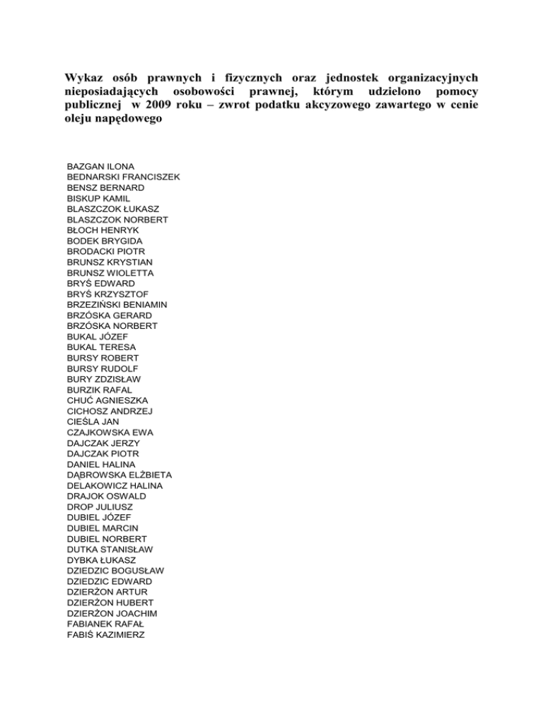 Wykaz osób prawnych i fizycznych oraz jednostek organizacyjnych nieposiadających osobowości prawnej, którym udzielono pomocy publicznej w 2009 roku – zwrot podatku akcyzowego zawartego w cenie oleju napędowego BAZGAN ILONA BEDNARSKI FRANCISZEK BENSZ BERNARD BISKUP KAMIL BLASZCZOK ŁUKASZ BLASZCZOK NORBERT BŁOCH HENRYK BODEK BRYGIDA BRODACKI PIOTR BRUNSZ KRYSTIAN BRUNSZ WIOLETTA BRYŚ EDWARD BRYŚ KRZYSZTOF BRZEZIŃSKI BENIAMIN BRZÓSKA GERARD BRZÓSKA NORBERT BUKAL JÓZEF BUKAL TERESA BURSY ROBERT BURSY RUDOLF BURY ZDZISŁAW BURZIK RAFAL CHUĆ AGNIESZKA CICHOSZ ANDRZEJ CIEŚLA JAN CZAJKOWSKA EWA DAJCZAK JERZY DAJCZAK PIOTR DANIEL HALINA DĄBROWSKA ELśBIETA DELAKOWICZ HALINA DRAJOK OSWALD DROP JULIUSZ DUBIEL JÓZEF DUBIEL MARCIN DUBIEL NORBERT DUTKA STANISŁAW DYBKA ŁUKASZ DZIEDZIC BOGUSŁAW DZIEDZIC EDWARD DZIERśON ARTUR DZIERśON HUBERT DZIERśON JOACHIM FABIANEK RAFAŁ FABIŚ KAZIMIERZ FAMULA JAN FELIS BRYGIDA FELIS JOACHIM FELIS JOLANTA FELIS PIOTR FELS ALFONS FORYTA ANDRZEJ FORYTA WALDEMAR FRĄCZEK ARNOLD GAJDECKI PAWEŁ GALLUS BERNARD GALLUS ERNEST GALLUS ERWIN GALUS HUBERT GALUS MONIKA GARBACIOK BARBARA GARNCAREK ELśBIETA GAWEŁ ROMAN GAWLIK ANDRZEJ GIERAK ANDRZEJ GIERAK JÓZEF GIERAK WŁADYSŁAWA GIZA PIOTR GLIWA WIKTOR GŁOWACKI SYLWERIUSZ GMYREK BARTŁOMIEJ GMYREK ELEONORA GNACY DARIUSZ GNACY JAN GRABAS BOGUSŁAWA GRYSKA JERZY GRZEBIELA BOGDAN GRZEMBA PAWEŁ GRZEMBA RAFAŁ GRZESIAK MAREK GRZESIK DARIUSZ GRZESIK RAFAŁ HADAM HENRYK HAŁADYN JÓZEF HAŁADYN KRYSTIAN HAŁUPKA BERNARD HEIK FERDYNAND HELIOS EWALD HELIOS NORBERT HOFFMAN LEON HOFFMANN ROBERT HOFMAN PIOTR IMIOLCZYK BRYGIDA JABŁONKA HUBERT JABŁONKA RAFAŁ JABŁONKA ROMAN JANICKI NORBERT JANSEN DAMIAN JANTOS JOACHIM JANUSIAK JAN JASTRZĘBSKI EDWARD JENDROK JERZY JEZIOROWSKI EMIL JUNG BOGUSŁAW JURCZOK GERARD JURCZYK SŁAWOMIR KACZKOWSKI JANUSZ KACZOR MIECZYSŁAW KALEMBA BARBARA KALEMBA RYSZARD KANAS JACEK KANDZIA IRENA KANDZIA NORBERT KANIA GERARD KANIA JERZY KANIA KRZYSZTOF KANIA WITOLD KANSY ADAM KANSY ADRIAN KANSY BERNARD KANSY NORBERT KAPICA BERNADETA KAPICA BERNARD KAPICA GERARD KAPICA NORBERT KAPICA WALDEMAR KARAŚ KRYSTIAN KASPRZYK KRZYSZTOF KASSNER MARCIN KERSTEN RENATA KĘS STANISŁAW KIERZEK WOJCIECH KINACH JOACHIM KINACH KRZYSZTOF KIRSCH ERYK KLOS JOACHIM KLOS MAGDALENA KOS KRYSTYNA KOS RENATA KOSMALA RYSZARD KOSTAŚ DOROTA KOSTYRA NORBERT KOTOWICZ ANDRZEJ KOWALCZYK ANDRZEJ KOWALCZYK NORBERT KOWALCZYK RUDOLF KOWALSKI JERZY KOWALSKI JOACHIM KOWOL EWELINA KROMP ANDRZEJ KRZYMIŃSKI JOACHIM KSIĄśEK GABRIELA KUBACKI JERZY KUBIK JAN KUBIK KRYSTIAN KULESA JÓZEF KULIK GRZEGORZ KULIK MAŁGORZATA KUPIEC WALDEMAR KURDYŚ WALDEMAR KUS ANDRZEJ KUS RÓśA KWAŚNY JÓZEF LACHOWSKA KRYSTYNA LACHOWSKI LESZEK LEMPA TERESA LEPSZA ELśBIETA LIBERA GERARD LIBERA HERBERT LIPCZAK ANNA LIPSKI ZYGMUNT LISTOWSKI WIESŁAW ŁAGISZ ANNA ŁAKOMSKI ZDZISŁAW MACIEJOK ROLAND MACIOŁ BERNARD MADEJA ALOZJY MAGLEWICZ ZYGMUNT MAJ RYSZARD MALECHA ALFRED MALECHA HELMUT MALECHA JAN MALECHA PIOTR MALINOWSKI ZDZISŁAW MAŁOLEPSZY WALDEMAR MAŁOPOLSKA HODOWLA ROŚLIN - HBP SP. Z O.O. MANN ADELA MANN HUBERT MANN JÓZEF MARCINOWSKI PIOTR MARCINÓW WŁODZIMIERZ MARCZAK WIESŁAW MAŚLANKA GRZEGORZ MATUSEK DAMIAN MATUSEK NORBERT MERYK PIOTR MERYK RUDOLF MIGDAŁ JUSTYNA MOKRZYCKI JACEK MOŚCIPAN HENRYK MROZEK MARCIN MRUCZEK JERZY MRUGAŁA TOMASZ MUCHA JANUSZ MUCHA STEFAN MUNDRY KAMIL MUNZER JÓZEF MUSIAŁ JACEK MYCKA DAMIAN MYCKA GERARD MYCKA RAJMUND NEUMAN ARTUR NIKEL ZYGFRYD NIKODEM EGON NIWA ALOJZY NOSEK JAN NOWAK FLORIAN NOWAK JÓZEF NOWAK ROMAN NOWAK URSZULA OBŁĄK PAWEŁ OCHMAN PIOTR ODOJ SEBASTIAN OLEJNIK JÓZEF ORZEŁ JÓZEF PAŁASZ PAWEŁ PANEK JÓZEF PAPROTNY BERNARD PAPROTNY NORBERT PAŚMIONKA KORDIAN PAWELEC JANUSZ PAWEŁCZYK TEODOR PAWLAK BOGDAN PENCZOK GERARD PEZDEK DOROTA PIELOK ALFRED PIELOK JERZY PIELOK PIOTR PIELOK RAJNARD PIETRAS RAFAŁ PIETRUCZEK STANISŁAW PIGŁO PIOTR PIGŁO SEBASTIAN PILARSKI JAN PILOT JERZY PILOT KRYSTYNA PISULA ANDRZEJ PISULSKI WALDEMAR PŁATEK ALFRED PŁONKA EDWARD POCZĄTEK ARTUR PODZIELNY RAJMUND PROTAŚ EWA PRZYBYŁA MARCELI PRZYWARA GERARD PTAK GRZEGORZ PTAK NORBERT RADACZYŃSKI PIOTR RAMBAU RUDOLF RAŚ JÓZEF RESPONDEK KRZYSZTOF ROJ DAMIAN ROLNICZA SPOŁDZIELNIA PRODUKCYJNA Zdziechowice ROLNICZA SPÓŁDZIELNIA PRODUKCYJNA W NOWEJ WSI RUSSEK RAJMUND RUTKOWSKI JAN RYBOT GERARD RYBOT KONRAD RYBOT TERESA RYBOT WALDEMAR RZĄDCA FRANCISZEK RZEPKA JAN RZEPKA LESZEK SACHTA RYSZARD SCHOENFELD GABRIELA SCHOENFELD JÓZEF SCHREIBER AGATA SCHUDY ERYK SEKIENDA MAREK SIKORA ANDRZEJ SKOCZYLAS ZBIGNIEW SKOWRONEK ANDRZEJ SŁABIK ALFONS SŁABIK GERARD SŁABIK NORBERT SMYREK WALDEMAR SOBAŁA MARCIN SOBAŃSKI KAROL SOLA ERNEST SOPA JAN SORGATZ SEBASTIAN SÓWKA ZDZISŁAW SPOIDA JOACHIM STANOSSEK RAFAŁ STEFAN ELśBIETA STIENE ARTUR STRZELECKI WITOLD SUMISŁAWSKA MAŁGORZATA SUSLIK RYSZARD SWAKOŃ KRZYSZTOF SYMA JOACHIM SYMA ROMAN SZAT EWA SZCZĘSNY LESZEK SZEWCZYK JANUSZ SZIRCH DAMIAN SZIRCH WALDEMAR SZUDY ARTUR SZUDY BERNARD SZYMIK URSZULA ŚWIERCZOK ALINA ŚWITAŁA JOACHIM TENERLE JAROSŁAW TĘCZA WOJCIECH TOMALA BERNARD TOMALA JAN TOMALA JAN TOMALA TERESA TOMALA ZYGFRYD TOMALA ZYGMUNT TOPOROWSKI ANTONI TREMBULAK SZCZEPAN TROCHA KRZYSZTOF TYŁA RENATA URBANIAK ZDZISŁAW WALESA AGNIESZKA WAWRZYŃSKI JÓZEF WAZNER BERNARD WIDERA PAULINA WIECHA GIZELA WIECHA IWONA WIECHA JERZY WIECZOREK ALOJZY WIECZOREK ANITA WIECZOREK ARKADIUSZ WIECZOREK JAN WIECZOREK MAREK WIECZOREK PIOTR WIENER PIOTR WILHELM DANIEL WILHELM NORBERT WILHELM WALDEMAR WŁOCH DAMIAN WŁÓCZYK HUBERT WOJCZYK JÓZEF WOJCZYSZYN JADWIGA WOLNY MARCIN WONCHAŁA RYSZARD WOŹNA BRYGIDA WOŹNY JOACHIM WOŹNY KRZYSZTOF WOŹNY WIKTOR WÓJCIK ELśBIETA WÓJCIK HALINA WÓJCIK HENRYK WÓJCIK WIKTOR WRÓBEL ANDRZEJ WYPYCH STANISŁAW WYRWA ANDRZEJ WYRWA JOACHIM ZAKLIŃSKI ANDRZEJ ZAREMBA GRZEGORZ ZARÓD ANDRZEJ ZAWADA JÓZEF ZAWADZKI RYSZARD ZIEGFELD PIOTR ZOK MAREK ZOK TERESA ZOLISZ JÓZEF ZOREMBA PIOTR ZOREMBA SYLWIA ZOREMBA WIKTOR ZOWADA JAN ZUZLIK PAWEŁ ZUŹLIK 