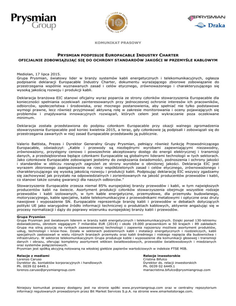 KOMUNIKAT PRASOWY PRYSMIAN PODPISUJE EUROPACABLE INDUSTRY CHARTER OFICJALNIE ZOBOWIĄZUJĄC SIĘ DO OCHRONY STANDARDÓW JAKOŚCI W PRZEMYŚLE KABLOWYM Mediolan, 17 lipca 2015. Grupa Prysmian, światowy lider w branży systemów kabli energetycznych i telekomunikacyjnych, ogłasza podpisanie deklaracji Europacable Industry Charter, dokumentu wyrażającego zbiorowe zobowiązanie do przestrzegania wspólnie wyznawanych zasad i celów etycznego, zrównoważonego i charakteryzującego się wysoką jakością rozwoju i produkcji kabli. Deklaracja branżowa EIC stanowi oficjalny wyraz poparcia ze strony członków stowarzyszenia Europacable dla konieczności spełniania oczekiwań zainteresowanych przy jednoczesnej ochronie interesów ich pracowników, odbiorców, społeczeństwa i środowiska, oraz mocnego postanowienia, aby spełniać nie tylko podstawowe wymogi prawne, lecz również przyjmować aktywną rolę w zakresie monitorowania i oceny pojawiających się problemów i znajdywania innowacyjnych rozwiązań, których celem jest wykraczanie poza oczekiwane minimum. Deklaracja została przedstawiona do podpisu członkom Europacable przy okazji walnego zgromadzenia stowarzyszenia Europacable pod koniec kwietnia 2015, a teraz, gdy członkowie ją podpisali i zobowiązali się do przestrzegania zawartych w niej zasad Europacable przedstawiło ją publicznie. Valerio Battista, Prezes i Dyrektor Generalny Grupy Prysmian, pełniący również funkcję Przewodniczącego Europacable, oświadczył: „Kable i przewody są niezbędnymi wyrobami zapewniającymi niezawodny, zrównoważony, przystępny cenowo i powszechnie akceptowany dostęp do energii elektrycznej i transmisji danych, a przedsiębiorstwa będące członkami Europacable są globalnymi liderami technologii w tych sektorach. Jako członkowie Europacable zobowiązani jesteśmy do zwiększania świadomości, podnoszenia i ochrony jakości i standardów w obliczu rosnących zagrożeń ze strony wyrobów o obniżonej jakości. Deklaracja EIC jest wyrazem zbiorowego zaangażowania na rzecz współdzielonych zasad i celów etycznego, zrównoważonego i charakteryzującego się wysoką jakością rozwoju i produkcji kabli. Podpisując deklarację EIC wszyscy zgadzamy się zachowywać jak przystało na odpowiedzialnych i zorientowanych na jakość producentów przewodów i kabli, co stanowi także oznakę gwarancji dla naszych odbiorców.” Stowarzyszenie Europacable zrzesza niemal 85% europejskiej branży przewodów i kabli, w tym największych producentów kabli na świecie. Asortyment produkcji członków stowarzyszenia obejmuje wszystkie rodzaje przewodów i kabli izolowanych, w tym kable energetyczne, przemysłowe, dla przemysłu budowlanego, motoryzacyjnego, kable specjalne, kable telekomunikacyjne z przewodnikami metalowymi i optyczne oraz druty nawojowe i wyposażenie SN. Europacable reprezentuje branżę kabli i przewodów w debatach dotyczących polityki UE jako wiarygodne źródło informacji technicznej o produktach kablowych, aktywnie angażując się w procesy normalizacji i dąży do poprawy wizerunku europejskiej branży kabli i przewodów. ________________________________________________________ Grupa Prysmian Grupa Prysmian jest światowym liderem w branży kabli energetycznych i telekomunikacyjnych. Dzięki ponad 130-letniemu doświadczeniu, obrotom sięgającym 7 miliardów EUR (2014) i około 19.000 pracownikom w 50 krajach i 89 zakładach Grupa ma silną pozycję na rynkach zaawansowanej technologii i zapewnia najszerszy możliwie asortyment produktów, usług, technologii i know-how. Działa w sektorach podziemnych kabli i instalacji energetycznych i rozdzielczych, kabli specjalnych zastosowań w wielu różnych branżach przemysłu oraz kabli średniego i niskiego napięcia dla budownictwa i infrastruktury. W sektorze telekomunikacyjnym Grupa produkuje kable i wyposażenie dla komunikacji głosowej i transmisji danych i obrazu, oferując kompletny asortyment włókien światłowodowych, przewodów światłowodowych i miedzianych oraz systemów połączeniowych. Prysmian jest spółką akcyjną notowaną na włoskiej giełdzie papierów wartościowych w indeksie FTSE MIB. Relacje z mediami Lorenzo Caruso Dyrektor ds. kontaktów korporacyjnych i handlowych Ph. 0039 02 6449.1 [email protected] Relacje inwestorskie Cristina Bifulco Dyrektor ds. relacji inwestorskich Ph. 0039 02 6449.1 [email protected] Niniejszy komunikat prasowy dostępny jest na stronie spółki www.prysmiangroup.com oraz w centralny repozytorium informacji regulowanych prowadzonym przez Bit Market Services S.p.A. na stronie www.emarketstorage.com.