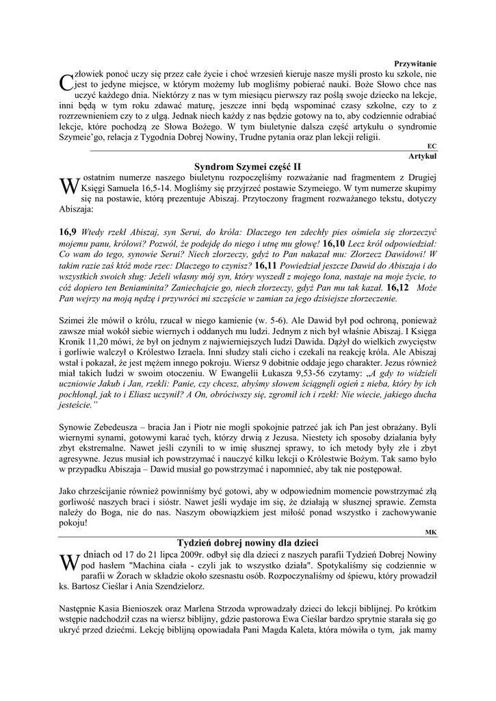 Przywitanie złowiek ponoć uczy się przez całe życie i choć wrzesień kieruje nasze myśli prosto ku szkole, nie jest to jedyne miejsce, w którym możemy lub mogliśmy pobierać nauki. Boże Słowo chce nas uczyć każdego dnia. Niektórzy z nas w tym miesiącu pierwszy raz poślą swoje dziecko na lekcje, inni będą w tym roku zdawać maturę, jeszcze inni będą wspominać czasy szkolne, czy to z rozrzewnieniem czy to z ulgą. Jednak niech każdy z nas będzie gotowy na to, aby codziennie odrabiać lekcje, które pochodzą ze Słowa Bożego. W tym biuletynie dalsza część artykułu o syndromie Szymeie’go, relacja z Tygodnia Dobrej Nowiny, Trudne pytania oraz plan lekcji religii. C EC Artykuł Syndrom Szymei część II ostatnim numerze naszego biuletynu rozpoczęliśmy rozważanie nad fragmentem z Drugiej Księgi Samuela 16,5-14. Mogliśmy się przyjrzeć postawie Szymeiego. W tym numerze skupimy się na postawie, którą prezentuje Abiszaj. Przytoczony fragment rozważanego tekstu, dotyczy Abiszaja: W 16,9 Wtedy rzekł Abiszaj, syn Serui, do króla: Dlaczego ten zdechły pies ośmiela się złorzeczyć mojemu panu, królowi? Pozwól, że podejdę do niego i utnę mu głowę! 16,10 Lecz król odpowiedział: Co wam do tego, synowie Serui? Niech złorzeczy, gdyż to Pan nakazał mu: Złorzecz Dawidowi! W takim razie zaś któż może rzec: Dlaczego to czynisz? 16,11 Powiedział jeszcze Dawid do Abiszaja i do wszystkich swoich sług: Jeżeli własny mój syn, który wyszedł z mojego łona, nastaje na moje życie, to cóż dopiero ten Beniaminita? Zaniechajcie go, niech złorzeczy, gdyż Pan mu tak kazał. 16,12 Może Pan wejrzy na moją nędzę i przywróci mi szczęście w zamian za jego dzisiejsze złorzeczenie. Szimei źle mówił o królu, rzucał w niego kamienie (w. 5-6). Ale Dawid był pod ochroną, ponieważ zawsze miał wokół siebie wiernych i oddanych mu ludzi. Jednym z nich był właśnie Abiszaj. I Księga Kronik 11,20 mówi, że był on jednym z najwierniejszych ludzi Dawida. Dążył do wielkich zwycięstw i gorliwie walczył o Królestwo Izraela. Inni słudzy stali cicho i czekali na reakcję króla. Ale Abiszaj wstał i pokazał, że jest mężem innego pokroju. Wiersz 9 dobitnie oddaje jego charakter. Jezus również miał takich ludzi w swoim otoczeniu. W Ewangelii Łukasza 9,53-56 czytamy: „A gdy to widzieli uczniowie Jakub i Jan, rzekli: Panie, czy chcesz, abyśmy słowem ściągnęli ogień z nieba, który by ich pochłonął, jak to i Eliasz uczynił? A On, obróciwszy się, zgromił ich i rzekł: Nie wiecie, jakiego ducha jesteście.” Synowie Zebedeusza – bracia Jan i Piotr nie mogli spokojnie patrzeć jak ich Pan jest obrażany. Byli wiernymi synami, gotowymi karać tych, którzy drwią z Jezusa. Niestety ich sposoby działania były zbyt ekstremalne. Nawet jeśli czynili to w imię słusznej sprawy, to ich metody były złe i zbyt agresywne. Jezus musiał ich powstrzymać i nauczyć kilku lekcji o Królestwie Bożym. Tak samo było w przypadku Abiszaja – Dawid musiał go powstrzymać i napomnieć, aby tak nie postępował. Jako chrześcijanie również powinniśmy być gotowi, aby w odpowiednim momencie powstrzymać złą gorliwość naszych braci i sióstr. Nawet jeśli wydaje im się, że działają w słusznej sprawie. Zemsta należy do Boga, nie do nas. Naszym obowiązkiem jest miłość ponad wszystko i zachowywanie pokoju! MK W Tydzień dobrej nowiny dla dzieci dniach od 17 do 21 lipca 2009r. odbył się dla dzieci z naszych parafii Tydzień Dobrej Nowiny pod hasłem "Machina ciała - czyli jak to wszystko działa". Spotykaliśmy się codziennie w parafii w Żorach w składzie około szesnastu osób. Rozpoczynaliśmy od śpiewu, który prowadził ks. Bartosz Cieślar i Ania Szendzielorz. Następnie Kasia Bienioszek oraz Marlena Strzoda wprowadzały dzieci do lekcji biblijnej. Po krótkim wstępie nadchodził czas na wiersz biblijny, gdzie pastorowa Ewa Cieślar bardzo sprytnie starała się go ukryć przed dziećmi. Lekcję biblijną opowiadała Pani Magda Kaleta, która mówiła o tym, jak mamy kierować swoje uszy, oczy, język i nogi tak, by podobać się Bogu. Następnie wykorzystywaliśmy wszystkie części naszego ciała przy zabawach sportowych oraz pracach plastycznych. Później był czas na słodki poczęstunek i złapanie oddechu! Po bardzo intensywnym dniu zostało jeszcze tylko sprawdzić, co kto zapamiętał?! Można było się wykazać wiedzą z danego dnia w konkursie. Już na sam koniec pastorowa Ewa opowiadała bardzo ciekawe historie misyjne, w czasie których nikt nie mógł oderwać się od słuchania. Nasze spotkania kończyliśmy krótkim śpiewem oraz modlitwą. Pod koniec tygodnia wszystkie dzieci otrzymały dyplomy uczestnictwa oraz nagrody. Dziękujemy wszystkim, którzy wnieśli wkład w to, aby ten tydzień mógł się odbyć! MS Trudne pytania cz.2 C hyba nikt na świecie nie zaprzeczy istnienia zła. Jest ono powszechne na całej kuli ziemskiej. W każdym narodzie i w każdej kulturze. Każdego dnia ktoś komuś czyni krzywdę, kogoś spotyka nieszczęście. A Bóg? Dlaczego nie działa? Czy zło tego świata go przerasta? Z jaką łatwością i prostotą przychodzi nam poszukiwać winy za zło w drugim człowieku. Jeszcze łatwiej przychodzi nam oskarżać Boga i przed nim rozkładać pretensjonalnie swoje ręce. Ktoś w końcu musi być temu winien a na pewno nie ja! Zastanawiam się tylko, kto pierwszy popełnił zło? Bóg, czy człowiek? Czy wina leży po stronie Adama, który mówi: Kobieta, którą mi dałeś, aby była ze mną, dała mi z tego drzewa i jadłem. Czy zatem kobieta jest winna? Wąż mnie zwiódł i jadłam – wyznaje Ewa. Zatem wąż? Diabeł? Władzę za stworzenie i cały świat Bóg przekazał człowiekowi, pozostawiając mu prawo wolności. Z tego prawa człowiek skorzystał czyniąc zło. Tym samym Szatanowi udało się odebrać człowiekowi władzę nad światem, bezlitośnie p