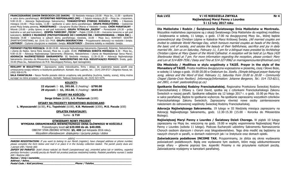FRANCISZKAŃSKI ZAKON ŚWIECKICH (III ZAKON) - III Niedziela miesiąca (10.00 - Msza św., 11.00 – spotkanie w salce domu parafialnego). RYCERSTWO NIEPOKALANEJ (MI) – I Sobota miesiąca (8.30 – Msza św. z kazaniem, 9.00-10.30 – Adoracja Najświętszego Sakramentu). TOWARZYSTWO ŻYWEGO RÓŻAŃCA (TŻR) – I Niedziela miesiąca (10.00 – Msza święta, 11.00 – spotkanie w salce domu parafialnego). GRUPA MODLITEWNA – Codziennie przed Mszą świętą poranną. MINISTRANCI – Liturgiczna Służba Ołtarza w niedziele i święta. CHÓR PARAFIALNY – Wtorek (19.00 – próby śpiewu w sali pod kościołem). GRUPA TETRALNA „RAZEM” – Poniedziałek (19.30 – próby teatralne w sali pod kościołem). ZESPÓŁ TANECZNY „TĘCZA” – Piątek (19.00-22.00 – ćwiczenia taneczne w sali pod kościołem). DZIECI I MŁODZIEŻ (PRZYGOTOWANIE DO I KOMUNII ŚW. i BIERZMOWANIA – MSZA ŚW.) – Niedziela (9.00 – katecheza w salkach domu parafialnego; niedziela, 10.00 – Msza św.). KONTAKT: SIOSTRY ZMARTWYCHWSTANKI, tel. (514) 521-7419. GRUPA DEKORACYJNA – Przygotowanie dekoracji na niedziele i święta. LEKTORZY - Czytania Liturgiczne w niedziele i święta. KOLEKTORZY – Zbieranie kolekty w niedziele i święta. PIERWSZY PIĄTEK MIESIĄCA: 18.00-19.00 - Adoracja Najświętszego Sakramentu (Spowiedź, Różaniec, Nabożeństwo i Litania do Najśw. Serca Pana Jezusa), Msza św. o godz. 19.00. PIERWSZA SOBOTA MIESIĄCA: 8.30 - Msza św., 9.00-10.30 – Adoracja Najświętszego Sakramentu (Różaniec, Nabożeństwo i Litania do Niepokalanego Serca Maryi). ADORACJA NAJŚWIĘTSZEGO SAKRAMENTU: III Niedziela miesiąca, 12.30-15.30 – Adoracja Najświętszego Sakramentu (Koronka do Miłosierdzia Bożego). NABOŻEŃSTWO DO M.B. NIEUSTAJĄCEJ POMOCY: Środa, godz. 19.00 (Msza św., Nabożeństwo do M.B. Nieustającej Pomocy, Apel Jasnogórski). REKLAMY W BIULETYNIE - Zapraszamy osoby indywidualne, firmy i sklepy do wspierania naszej parafii oraz umieszczenia swojej reklamy w biuletynie parafialnym. Kontakt: Alex Lupinski, tel.: (514) 254 8727 i Zbigniew Kowal, tel. (450) 928-0179. SALA PARAFIALNA - Nasza Parafia posiada dobrze urządzoną salę parafialną (kuchnia, toalety, scena), którą można wynająć na różne przyjęcia i uroczystości. Kontakt: Tadeusz Kosiorowski, tel. (514) 523 4279. KOLEKTY: 22 styczeń: I - $1, 395.00, II /heating/ - $790.00 29 styczeń: I - $1, 352.00, II /heating/ - $645.00 OFIARY NA KOŚCIÓŁ: Serge Urban ($100), Ł.V. Pasternak ($100) OFIARY NA PROJEKTY REMONTOWO-BUDOWLANE: L. Wysoczanski ($150), P.L. Topolniski ($100), K.B. Matowski ($300), M.S. Pacula ($50) OPŁATEK PARAFIALNY: Suma - $ 710 Rok LVII V i VI NIEDZIELA ZWYKŁA Najświętszej Maryi Panny z Lourdes 5 i 12 luty 2017 roku Nr 4 Dla Małżeństw i Rodzin / Świętowanie Światowego Dnia Małżeństw w Montrealu. Wszystkie małżeństwa zaproszone są z okazji Światowego Dnia Małżeństw do wspólnej modlitwy i świętowania w sobotę, 11 lutego, o godz. 17.00 na dwujęzycznej Mszy św., której będzie przewodniczył abp Christian Lépine w Katedrze Maryi Królowej Świata. (All married couples are invited to celebrate World Marriage Day, which honours married couples as heads of the family, the basic unit of society, and salutes the beauty of their faithfulness, sacrifice and joy in daily married life. Join us on Saturday, February 11, 5 pm for a bilingual mass presided by Archbishop Christian Lépine at Mary Queen of the World Cathedral. A reception will be held at La Plaza (420 Sherbrooke West) at 7 pm. For more information regarding the reception, please contact: Mary and Len at 514-809-7556 / Daisy and Tino at 514-327-9962 or [email protected]) Dla Młodzieży / Modlitwa w stylu wspólnoty z TAIZÉ. Prayer in the style of the Monastery of TAIZÉ. Prosta modlitwa dwujęzyczna wyposażona w piosenkę, ciszę i Słowo Boże, w sobotę 11 lutego o godz. 19.00-20.00 w Oratorium św. Józefa. (Simple bilingual prayer featuring song, silence and the Word of God. February 11, Saturday from 19.00 to 20.00 – Community Chapel (Sainte-Croix Pavillon). Informacja/Information: Johanne Bergeron, Tel.: 514 733-8211, ext 2801, e-mail: [email protected]) Spotkanie Świeckiej Rodziny Franciszkańskiej. Regionalna Przełożona Świeckiej Rodziny Franciszkańskiej z Ottawy s. Carol David, spotka się z członkami Franciszkańskiego Zakonu Świeckich w naszej parafii. Spotkanie odbędzie się 12 lutego 2017 r. o godz. 10.00 po Mszy św. w salce parafialnej. Będzie to spotkanie wyborcze. Na spotkanie zapraszamy wszystkich członków Franciszkańskiego Zakonu Świeckich. Zapraszamy również nowe osoby zainteresowane należeniem do odnowionej wspólnoty Świeckiej Rodziny Franciszkańskiej. Adoracja Najświętszego Sakramentu. 19 lutego w III Niedzielę miesiąca zapraszamy na Adorację Najświętszego Sakramentu, godz. 12.30-15.30 (15.00 - Koronka do Miłosierdzia Bożego). OTWIERAMY NOWY PROJEKT WYMIANA OBRAMOWANIA WEWNĘTRZNEGO OKNA GŁÓWNEGO W KOŚCIELE Przewidywany koszt od $20.000 do ok. $40.000. OBECNY STAN ZBIÓRKI WYNOSI: $5, 400 (od listopada 2016 roku). Najświętszej Maryi Panny z Lourdes / Światowy Dzień Chorego. W piątek 10 lutego zapraszamy na Mszę św. wieczorną na godz. 19.00 w wigilię wspomnienia Najświętszej Maryi Panny z Lourdes (sobota 11 lutego). Podczas Eucharystii udzielimy Sakramentu Namaszczenia Chorych osobom starszym i chorym oraz błogosławieństwo. Tego dnia modlić się będziemy za naszych chorych w parafii, w domach rodzinnych jak i w Instytucie oraz domach opieki. --------------------------------------------------------- odetnij ---------------------------------------------------------- Zaświadczenia podatkowe INCOME TAX. Przypominamy, że zbliża się okres wydawania poświadczeń podatkowych. Będą one wydawane tym osobom, które mają udokumentowane swoje ofiary – głównie poprzez tzw. kopertki. Prosimy o nie przysyłanie rozliczeń pocztą. Zaświ
