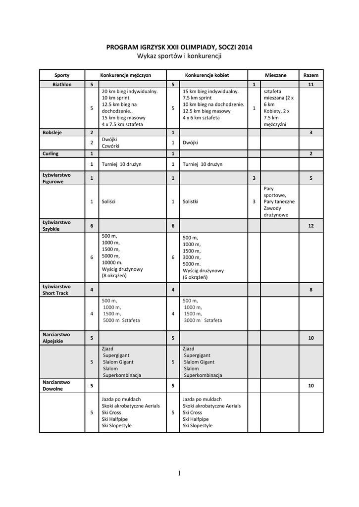 PROGRAM IGRZYSK XXII OLIMPIADY, SOCZI 2014 Wykaz sportów i konkurencji Sporty Biathlon Konkurencje mężczyzn 5 5 Bobsleje Curling Łyżwiarstwo Szybkie Łyżwiarstwo Short Track Narciarstwo Dowolne Soliści 500 m, 1000 m, 1500 m, 5000 m, 10000 m. Wyścig drużynowy (8 okrążeń) 1 11 sztafeta mieszana (2 x 6 km Kobiety, 2 x 7.5 km mężczyźni Dwójki 2 1 Turniej 10 drużyn 3 1 Solistki 500 m, 1000 m, 1500 m, 5000 m Sztafeta 6 8 500 m, 1000 m, 1500 m, 3000 m Sztafeta 4 10 Zjazd Supergigant Slalom Gigant Slalom Superkombinacja 5 5 Jazda po muldach Skoki akrobatyczne Aerials Ski Cross Ski Halfpipe Ski Slopestyle Pary sportowe, Pary taneczne Zawody drużynowe 500 m, 1000 m, 1500 m, 3000 m, 5000 m. Wyścig drużynowy (6 okrążeń) 5 Zjazd Supergigant Slalom Gigant Slalom Superkombinacja 3 5 12 4 5 5 1 Razem 3 6 5 5 5 1 4 4 Narciarstwo Alpejskie Turniej 10 drużyn 6 6 1 15 km bieg indywidualny. 7.5 km sprint 10 km bieg na dochodzenie. 12.5 km bieg masowy 4 x 6 km sztafeta 1 1 1 Mieszane 1 Dwójki Czwórki 1 1 Łyżwiarstwo Figurowe 5 20 km bieg indywidualny. 10 km sprint 12.5 km bieg na dochodzenie.. 15 km bieg masowy 4 x 7.5 km sztafeta 2 2 Konkurencje kobiet 10 Jazda po muldach Skoki akrobatyczne Aerials Ski Cross Ski Halfpipe Ski Slopestyle 5 1 Sporty Narciarstwo Biegowe Konkurencje mężczyzn 6 6 Narciarstwo Kombinacja Norweska Bieg na dochodzenie (15 km Tech. Klasyczną/15 km Tech. Dowolną) 15 km Techniką Klasyczną 50 km Techniką Dowolną Wspólny Start Sztafeta Sprint Techniką Klasyczną Sztafeta 4 x 10 km (2 Klasyczną / 2 Dowolną) Sprint Techniką Dowolną 12 Bieg na dochodzenie (7,5 km Tech. Klasyczną/7,5 km Tech. Dowolną) 10 km Techniką Klasyczną 30 km Techniką Dowolną Wspólny Start Sztafeta Sprint Techniką Klasyczną Sztafeta 4 x 5 km (2 Klasyczną / 2 Dowolną) Sprint Techniką Dowolną 6 Konkurs indywidualny Normalna skocznia Bieg narciarski 10 km Konkurs indywidualny Duża skocznia Bieg narciarski 10 km Konkurs drużynowy (4 zawodników) Skoki duża skocznia Bieg sztafeta 4 x 5 km 1 Konkurs indywidualny skocznia normalna Konkurs indywidualny skocznia duża Konkurs drużynowy (4 zawodników) duża skocznia 4 Konkurs indywidualny skocznia normalna 1 1 1 Jedynka męska 4 ślizgi konkursowe Dwójka 2 ślizgi konkursowe 1 Jedynka kobiet konkursowe 1 1 Hokej na Lodzie RAZEM 50 1 2 Jedynka kobiet 5 Slalom Gigant Równoległy Slalom Równoległy Snowboard Cross Snowboard Halfpipe Snowboard Slopestyle 1 1 4 Sztafeta 1 5 5 4 ślizgi 1 Jedynka męska Snowboard Razem 3 2 2 Skeleton 6 3 3 Saneczkarstwo Mieszane/otwarte 3 3 Narciarstwo Skoki Konkurencje kobiet 10 Slalom Gigant Równoległy Slalom Równoległy Snowboard Cross Snowboard Halfpipe Snowboard Slopestyle 5 2 1 Turniej – 12 drużyn 0 Turniej – 8 drużyn 1 43 0 2 5 0 98
