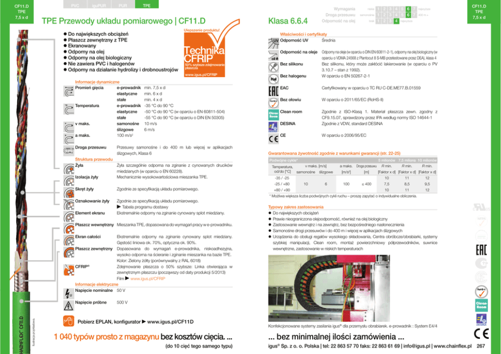 PVC CF11.D TPE 7,5 x d iguPUR PUR TPE TPE Przewody układu pomiarowego | CF11.D z Do największych obciążeń z Płaszcz zewnętrzny z TPE z Ekranowany z Odporny na olej z Odporny na olej biologiczny z Nie zawiera PVC i halogenów z Odporny na działanie hydrolizy i drobnoustrojów Informacje dynamiczne Promień gięcia e-prowadnik elastyczne stałe Temperatura e-prowadnik elastyczne stałe v maks. samonośne ślizgowe a maks. 100 m/s2 Droga przesuwu Struktura przewodu Żyła Izolacja żyły Klasa 6.6.4 Ulepszenie produktu! Technika CFRIP ® 50% szybsze zdejmowanie płaszcza www.igus.pl/CFRIP min. 7,5 x d min. 6 x d min. 4 x d -35 °C do 90 °C -50 °C do 90 °C (w oparciu o EN 60811-504) -55 °C do 90 °C (w oparciu o DIN EN 50305) 10 m/s 6 m/s Przesuwy samonośne i do 400 m lub więcej w aplikacjach ślizgowych, Klasa 6 niskie samonośnie brak Zgodnie ze specyfikacją układu pomiarowego. najwyższe 400 m + Bez halogenu Odporny na oleje (w oparciu o DIN EN 60811-2-1), odporny na olej biologiczny (w oparciu o VDMA 24568 z Plantocut 8 S-MB przetestowane przez DEA), klasa 4 Bez silikonu, który może zakłócić lakierowanie (w oparciu o PV 3.10.7 – stan z 1992). W oparciu o EN 50267-2-1 EAC Certyfikowany w oparciu o TC RU C-DE.ME77.B.01559 Bez ołowiu W oparciu o 2011/65/EC (RoHS-II) Clean room DESINA Zgodnie z ISO-Klasą 1. Materiał płaszcza zewn. zgodny z CF9.15.07, sprawdzony przez IPA według normy ISO 14644-1 Zgodnie z VDW, standard DESINA CE W oparciu o 2006/95/EC Odporność na oleje Bez silikonu CF11.D TPE 7,5 x d Gwarantowana żywotność zgodnie z warunkami gwarancji (str. 22-25) Podwójne cykle* Żyła szczególnie odporna na zginanie z cynowanych drucików miedzianych (w oparciu o EN 60228). Mechanicznie wysokowartościowa mieszanka TPE. 1 2 3 4 5 6 7 1 2 3 4 5 6 7 1 2 3 4 najwyższe Właściwości i certyfikaty Odporność UV Średnia 5 milionów 7,5 miliona 10 milionów v maks. [m/s] Temperatura, od/do [°C] samonośne ślizgowe a maks. Droga przesuwu [m/s2] [m] 100 ≤ 400 -35 / -25 -25 / +80 Skręt żyły Wymagania Droga przesuwu Odporność na olej +80 / +90 10 6 R min. R min. R min. [Faktor x d] [Faktor x d] [Faktor x d] 10 11 12 7,5 8,5 9,5 10 11 12 * Możliwa większa liczba podwójnych cykli ruchu – proszę zapytać o indywidualne obliczenia. Oznakowanie żyły Element ekranu Zgodnie ze specyfikacją układu pomiarowego. Tabela programu dostawy Ekstremalnie odporny na zginanie cynowany splot miedziany. Płaszcz wewnętrzny Mieszanka TPE, dopasowana do wymagań pracy w e-prowadniku. Ekstremalnie odporny na zginanie cynowany splot miedziany. Gęstość liniowa ok. 70%, optyczna ok. 90%. Płaszcz zewnętrzny Dopasowana do wymagań e-prowadnika, niskoadhezyjna, wysoko odporna na ścieranie i zginanie mieszanka na bazie TPE. Kolor: Zielony żółty (porównywalny z RAL 6018) CFRIP® Zdejmowanie płaszcza o 50% szybsze: Linka otwierająca w zewnętrznym płaszczu (począwszy od daty produkcji 5/2013) Film www.igus.pl/CFRIP Informacje elektryczne Napięcie nominalne 50 V Ekran całości Ilustracja przykładowa. Napięcie próbne Typowy zakres zastosowania z Do największych obciążeń z Prawie nieograniczona olejoodporność, również na olej biologiczny z Zastosowanie wewnątrz i na zewnątrz, bez bezpośredniego nasłonecznienia z Samonośne drogi przesuwów i do 400 m i więcej w aplikacjach ślizgowych z Urządzenia do obsługi regałów wysokiego składowania, Centra obróbcze/obrabiarki, systemy szybkiej manipulacji, Clean room, montaż powierzchniowy półprzewodników, suwnice wewnętrzne, zastosowanie w niskich temperaturach 500 V Pobierz EPLAN, konfigurator www.igus.pl/CF11D 1 040 typów prosto z magazynu bez kosztów cięcia. ... (do 10 cięć tego samego typu) Konfekcjonowane systemy zasilania igus® dla przemysłu obrabiarek. e-prowadnik : System E4/4 ... bez minimalnej ilości zamówienia ... igus® Sp. z o. o. Polska | tel: 22 863 57 70 faks: 22 863 61 69 | [email protected] | www.chainflex.pl 267 PVC CF11.D TPE 7,5 x d iguPUR PUR TPE TPE Przewody układu pomiarowego | CF11.D Klasa 6.6.4 Wymagania Droga przesuwu Odporność na olej niskie samonośnie brak 1 2 3 4 5 6 7 1 2 3 4 5 6 7 1 2 3 4 najwyższe najwyższe 400 m + CF11.D TPE 7,5 x d Zdejmowanie płaszcza o 50 % szybciej Ilustracja przykładowa. Program dostaw Nr art. Ilość żył i przekrój nominalny żył [mm²] CF11.001.D (3x(2x0,14)C+(4x0,14)+(2x0,5))C 10,5 CF11.002.D (3x(2x0,14)C+2x(0,5)C)C CF11.003.D Średnica zewnętrzna maks. [mm] Indeks miedziowy [kg/km] Ciężar [kg/km] PLN/m 80 176 43,85 CF11.001.D 10,0 82 188 42,75 CF11.002.D (3x(2x0,14)+2x1,0)C 8,5 61 124 31,50 CF11.003.D CF11.004.D (2x(2x(2x0,14))+(4x0,14)C+(4x0,5))C 11,5 91 197 49,45 CF11.004.D CF11.005.D (4x(2x0,14)+4x0,5)C 9,0 68 144 31,15 CF11.005.D CF11.006.D (3x(2x0,14) C+(4x0,14)+(4x0,25)+(2x0,5))C 11,0 93 202 50,40 CF11.006.D CF11.007.D 2) CF11.008.D CF11.009.D (4x0,34)C (3x(2x0,25))C (4x(2x0,25)+2x0,5)C 6,0 7,5 9,5 32 37 66 65 81 137 20,95 25,20 27,20 CF11.007.D 2) CF11.008.D CF11.009.D CF11.010.D 1.8) (4x(2x0,25)+2x1,0)C 9,5 80 161 35,55 CF11.010.D 1) CF11.011.D 1.8) (4x(2x0,34)+4x0,5)C 10,5 96 201 35,15 CF11.011.D 1) CF11.012.D 1.8) (3x(2x0,14)C+(3x0,14) C+(4x0,14)+(2x0,14+2x0,5))C 11,5 99 222 55,40 CF11.012.D 1) CF11.013.D (3x(2x0,14)C+2x0,5)C 9,5 70 152 35,90 CF11.013.D CF11.014.D (4x(2x0,25)C+(2x0,5))C 11,5 95 212 42,10 CF11.014.D (4x(2x0,14)+4x0,5)C 9,0 68 140 31,15 CF11.015.D CF11.016.D CF11.017.D 4) (3x(2x0,25)C)C (4x(2x0,14)+(4x0,14)C+4x1,0)C 9,5 11,0 65 116 144 245 36,15 46,70 CF11.016.D 1) CF11.017.D 4) CF11.018.D 4) (2x(2x0,25)+2x0,5)C 6,5 40 76 19,90 CF11.018.D 4) CF11.019.D 4) (3x(2x0,25)C+(3x0,25)+2x1,0)C 10,5 106 228 40,20 CF11.019.D 4) CF11.015.D 1.8) Nr art. Grupa żył 3x(2x0,14)C (4x0,14) (2x0.5) 3x(2x0,14)C 2x(0,5)C 3x(2x0,14) 2x1,0 2x(2x(2x0,14)) (4x0,14)C (4x0.5) 4x(2x0,14) 4x0,5 3x(2x0,14)C (4x0,14) (4x0.25) (2x0.5) 4x0,34 3x(2x0,25) 4x(2x0,25) 2x0,5 4x(2x0,25) 2x1,0 4x(2x0,34) 4x0,5 3x(2x0,14)C (