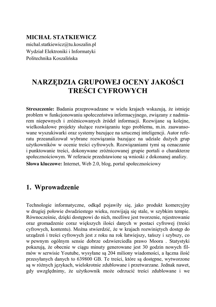 MICHAŁ STATKIEWICZ [email protected] Wydział Elektroniki i Informatyki Politechnika Koszalińska NARZĘDZIA GRUPOWEJ OCENY JAKOŚCI TREŚCI CYFROWYCH Streszczenie: Badania przeprowadzane w wielu krajach wskazują, że istnieje problem w funkcjonowaniu społeczeństwa informacyjnego, związany z nadmiarem niepewnych i zróżnicowanych źródeł informacji. Rozwijane są kolejne, wielkoskalowe projekty służące rozwiązaniu tego problemu, m.in. zaawansowane wyszukiwarki oraz systemy bazujące na sztucznej inteligencji. Autor referatu przeanalizował wybrane rozwiązania bazujące na udziale dużych grup użytkowników w ocenie treści cyfrowych. Rozwiązaniami tymi są oznaczanie i punktowanie treści, dokonywane zróżnicowanej grupie portali o charakterze społecznościowym. W referacie przedstawione są wnioski z dokonanej analizy. Słowa kluczowe: Internet, Web 2.0, blog, portal społecznościowy 1. Wprowadzenie Technologie informatyczne, odkąd pojawiły się, jako produkt komercyjny w drugiej połowie dwudziestego wieku, rozwijają się stale, w szybkim tempie. Równocześnie, dzięki dostępowi do nich, możliwe jest tworzenie, rejestrowanie oraz gromadzenie coraz większych ilości danych w postaci cyfrowej (treści cyfrowych, kontentu). Można stwierdzić, że w krajach rozwiniętych dostęp do urządzeń i treści cyfrowych jest z roku na rok łatwiejszy, tańszy i szybszy, co w pewnym ogólnym sensie dobrze odzwierciedla prawo Moora . Statystyki pokazują, że obecnie w ciągu minuty generowane jest 30 godzin nowych filmów w serwisie Youtube, wysyłane są 204 miliony wiadomości, a łączna ilość przesyłanych danych to 639800 GB. Te treści, które są dostępne, wytworzone są w różnych językach, wielokrotnie zdublowane i przetwarzane. Jednak nawet, gdy uwzględnimy, że użytkownik może odrzucić treści zdublowane i we 116 Michał Statkiewicz wszystkich językach poza natywnym, pozostaje mu olbrzymia ilość informacji do przeszukania, aby znalazł to, czego potrzebuje. Problem wyszukiwania pożądanych treści w sieci jest, więc istotny, co potwierdzone jest po pierwsze ciągłym rozwojem algorytmów wyszukiwarek, po drugie próbami ręcznego (dokonywanego przez wybranych użytkowników) segregowania treści, pod względem, jakości oraz tematyki. Rozwiązanie pierwsze często nie daje zadowalających rezultatów, głównie z następujących przyczyn: skuteczne wyszukiwanie informacji za pomocą wyszukiwarek wymaga umiejętności formułowania odpowiednio precyzyjnych zapytań, przy jednoczesnej znajomości logiki działania danej wyszukiwarki, większość użytkowników, jak pokazują statystyki , korzysta z wyszukiwarek w sposób bardzo podstawowy, mimo dostępnych na ogół informacji o sposobie działania tych wyszukiwarek, zauważalny jest „wyścig” między dokładnością algorytmów sortujących wyniki wyszukiwania, a użytkownikami zajmującymi się pozycjonowaniem stron (wypychaniem ich w górę listy wyników wyszukiwania), najczęściej w celach marketingowych, co zmniejsza trafność wyświetlanych wyników, ostatnią przyczyną jest brak możliwości (na chwilę obecną) rozróżniania przez wyszukiwarki, nawet przy odpowiednio szczegółowo sformułowanym zapytaniu, treści dobrej jakości od treści jakości gorszej (przygotowanej niestarannie, zmodyfikowanej, nieaktualnej bądź po prostu fałszywej), a przez to nie spełniającej wymagań użytkownika. Powyższe przyczyny sprawiają, że skuteczny dostęp do pożądanych treści w internecie za pomocą wyszukiwarek, mimo bycia najpopularniejszym sposobem, wymaga rozwinięcia odpowiednich umiejętności oraz nierzadko poświęcenia zauważalnego czasu na znalezienie tych treści – wymaga bycia "użytkownikiem zaawansowanym”. Rozwiązanie drugie, czyli świadome katalogowanie treści przez wybraną grupę doświadczonych użytkowników, przestaje być popularne oraz efektywne wraz ze wzrostem ilości dostępnych treści. Treści, których użytkownicy szukają, mają różne zastosowania. Jeśli są to treści rozrywkowe (typu film, muzyka czy opowiadanie), to trafienie na egzemplarz gorszej (pod różnymi względami) jakości oznacza najczęściej „tylko” mniejszą satysfakcję użytkownika, co z komercyjnego punktu widzenia może prowadzić do strat. Jednak wiele treści, umieszczanych np. na forach internetowych albo blogach, ma zastosowanie praktyczne (dotyczy np. przepisu kulinarnego, rozliczania podatków czy naprawy samochodu). W tej drugiej sytuacji, Narzedzia grupowej oceny jakości treści cyfrowych 117 trafienie na treść gorszej jakości oznaczać może (jeśli nie uda się informacji zweryfikować w innych źródłach) niemożność rozwiązania problemu, różnego rodzaju szkody lub nawet zagrożenie dla użytkownika. Ponieważ, jak wspomniano wcześniej, algorytmy wyszukiwarek nie radzą sobie jeszcze z rozróżnianiem treści różnej jakości, a ograniczona grupa użytkowników (nawet doświadczonych specjalistów) nie radzi sobie z dużą ilością treści, potrzebne jest inne rozwiązanie. 2. Mechanizmy grupowej oceny treści W procesie segregowania treści wymagana jest obecność użytkowników – jako świadomych odbiorców treści zainteresowanych daną tematyką, najlepiej w ilości proporcjonalnej do generowanych treści (zapewni to jednocześnie i skuteczność i wydajność procesu). Wymagany jest też przejrzysty sposób wartościowania i oznakowania treści, zrozumiały dla wszystkich uczestników tego procesu. Jednocześnie cały proces oceniania i segregowania treści powinien być zrealizowany w taki sposób, aby użytkowników mocno nie obciążać, aby selekcja dokonywana była niejako przy okazji i przy możliwie małym wysiłku. Więc jeśli powstanie odpowiednio liczna grupa użytkowników zainteresowanych daną dziedziną bądź tematyką, aktywnie i świadomie oceniająca dostępne treści, proces segregowania tych treści powinien stać się 
