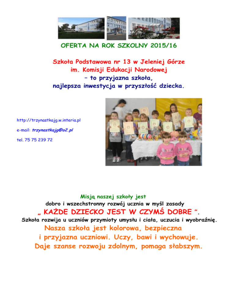 OFERTA NA ROK SZKOLNY 2015/16 Szkoła Podstawowa nr 13 w Jeleniej Górze im. Komisji Edukacji Narodowej – to przyjazna szkoła, najlepsza inwestycja w przyszłość dziecka. http://trzynastkajg.w.interia.pl e-mail: [email protected] tel. 75 75 239 72 Misją naszej szkoły jest dobro i wszechstronny rozwój ucznia w myśl zasady „ KAŻDE DZIECKO JEST W CZYMŚ DOBRE ”. Szkoła rozwija u uczniów przymioty umysłu i ciała, uczucia i wyobraźnię. Nasza szkoła jest kolorowa, bezpieczna i przyjazna uczniowi. Uczy, bawi i wychowuje. Daje szanse rozwoju zdolnym, pomaga słabszym. Nasza szkoła oferuje: 1. Klasy sportowe o profilach: piłka nożna dla chłopców, piłka ręczna dla dziewcząt. 2. Naukę języków obcych (język angielski). 3. Możliwość twórczej edukacji w kołach zainteresowań: matematycznym, informatycznym, przyrodniczym, języka angielskiego, języka niemieckiego, sportowym, tanecznym, plastycznym, teatralnym, muzycznym, recytatorskie, 4. Pomoc i rozwój zainteresowań poprzez uczestnictwo w zajęciach świetlicy szkolnej; 5. Możliwość uczestnictwa w zajęciach świetlicy środowiskowej „Trzynaściaki”; Uczeń swoją samodzielność może rozwijać poprzez: - udział w projektach : „ eTwinning” – autorski program nauczyciela języka angielskiego w ramach współpracy z krajami Unii Europejskiej (Hiszpania, Włochy, Rumunia, Grecja, Łotwa), Mały Mistrz - Program aktywności fizycznej uczniów klas I - III, MultiSport - gry i zabawy drużynowe- piłka nożna dla klas IV - VI, Edukacja Filmowa „Nowe Horyzonty”, Edukacja czytelnicza, Czytam, słucham, tworzę, H2O - akcja propagująca oszczędzanie wody. - udział w programach profilaktycznych i edukacyjnych: „Śniadanie daje Moc”, „Nie pal przy mnie proszę”, „Szklanka mleka”, „Owoce w szkole”, „Ratujmy dzieciom wzrok”, „Biały uśmiech”, „Bezpieczniki TAURONA. Włącz dla dobra dziecka”. „Zbieraj baterie”. W szkole realizowane są programy wewnątrzszkolne: Szkolny program wspierania rozwoju dziecka młodszego na I etapie edukacyjnym; Program profilaktyki bezpieczeństwa internetowego; Program pierwszej pomocy w ramach współpracy z Wielką Orkiestrą Świątecznej Pomocy; Szkolny program wspierania uzdolnień; Program „Bezpieczna Szkoła”. W szkole uczymy dzieci: patriotyzmu poprzez objęcie patronatem „Skwerku Wołyńskego” położonego u zbiegu ulicy Wolności i Al. Wojska Polskiego; zachowań proekologicznych: „ Moje miasto bez elektrośmieci”, „ Zbieramy zużyte baterie”, segregujemy odpady; Uczniowie przygotowują imprezy i uroczystości: Dzień Papieski, Jasełka, Choinka z Trzynastką, itp.; święta nietypowe np. „Dzień pluszowego misia”, „Światowy dzień bicia rekordów” , itp. Sąsiadujemy z ZHP Chorągwią Dolnośląską - Karkonoskim Hufcem w Jeleniej Górze; Nasi uczniowie biorą udział: w konkursach szkolnych i międzyszkolnych w zawodach sportowych; w pracy Samorządu Uczniowskiego; w wycieczkach klasowych; w miejskich imprezach kulturalnych (wyjścia do kina, teatru, muzeum, galerii, itp.) Szkoła współpracuje z: Młodzieżowym Domem Kultury, Jeleniogórskim Centrum Kultury, Biurem Wystaw Artystycznych, Karkonoskim Parkiem Krajobrazowym, Schroniskiem dla małych zwierząt, Teatrem im. C.K. Norwida, Osiedlowym Domem Kultury, Filharmonią, DODN Książnicą Karkonoską, Klubem Sportowym Karkonosze Jelenia Góra, Klubem Piłki Recznej Jelenia Góra, Termami Cieplickimi, Policją, Strażą Miejską, innymi szkołami przedszkolami. Nasi uczniowie mają do dyspozycji: salę komputerową; salę multimedialną; salę terapeutyczną; salę gimnastyczną; przestronną salę do zabawy i nauki „Radosna szkoła”; bibliotekę; boisko sportowe „Orlik”, lodowisko „Orlik”; boisko wielofunkcyjne; nowoczesny i bezpieczny plac zabaw dla najmłodszych „ Radosna Szkoła” przestronne klasy wyposażone w nowe meble i multimedialne środki dydaktyczne (tablice interaktywne, laptopy, dydaktyczne programy komputerowe, itp.) Oferujemy także: naukę pływania dla uczniów klas I-III; zajęcia rytmiczne; pomoc uczniom z trudnościami w nauce; objęcie uczniów opieką psychologicznopedagogiczną, profesjonalną opiekę logopedyczną na terenie szkoły; zajęcia socjoterapii i terapii pedagogicznej; opiekę pielęgniarki; „drugie śniadanie” dla dzieci potrzebujących; stołówkę szkolną i sklepik. Szkoła gwarantuje: miłą i bezpieczną atmosferę; wykwalifikowaną kadrę pedagogiczną; jednozmianowy system nauczania; monitoring wewnętrzny i dozór firmy ochroniarskiej; mało liczne klasy, pozwalające nauczycielowi na indywidualne podejście do dziecka; wsparcie dziecka sześcioletniego w rzeczywistości szkolnej czyste, wyremontowane sale lekcyjne, wyposażone w niezbędne środki audiowizualne i multimedialne; szereg nowoczesnych środków dydaktycznych. Zdobyliśmy 1 miejsce i tytuł „Najfajniejszej podstawówki w regionie jeleniogórskim” wg plebiscytu Gazety Wrocławskiej Nasza placówka otrzymała certyfikat oraz tytuł „Najlepsza Szkoła” za tworzenie przyjaznej atmosfery i warunków rozwoju dla uczniów ZAPRASZAMY!!!