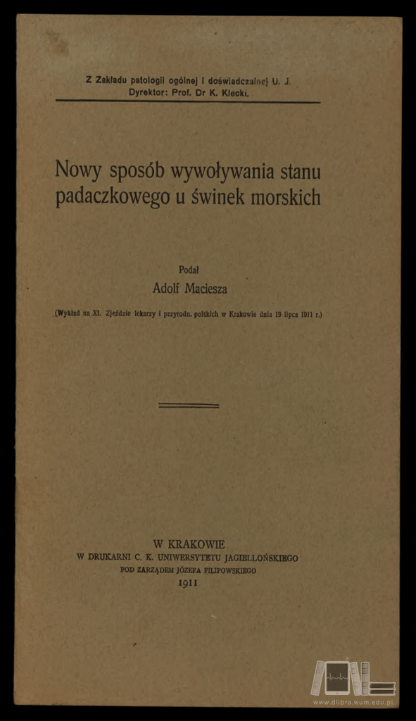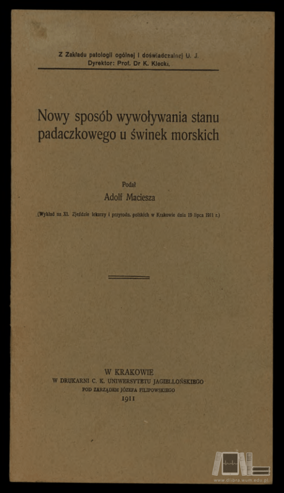 Z Zakładu patologii ogólnej i doświadczalnej U. J. Dyrektor: Prot. Dr K. Kiecki. Nowy sposób wywoływania stanu padaczkowego u świnek morskich Podał Adolf Maciesza (Wykład na XI. Zjeździe lekarzy i przyrodn. polskich w Krakowie dnia 19 lipca 1911 r.) W KRAKOWIE W DRUKARNI C. K. UNIWERSYTETU JAGIELLOŃSKIEGO POD ZARZĄDEM JÓZEFA FILIPOWSKIEGO 1911 Z Zakładu patologii ogólnej i doświadczalnej U. J. D yrektor: Prof. D r K. Kiecki. Nowy sposób wywoływania stanu padaczkowego u świnek morskich Podał Adolf Maciesza (W ykład na XI. Z jeid zie lekarzy i przyrodn. polskich w Krakowie dnia 19 lipca 1911 r.) Biblioteka Główna WUM Br.6382 000031088 W K R A K O W IE W DRUKARNI C. K. UNIWERSYTETU JAGIELLOŃSKIEGO POD ZARZĄDEM JÓZEFA FILIPOWSKIEGO Ipl I Biblioteka Główna WUM www. dl i br a. wum. edu. pl Osobne odbicie z »Przeglądu lekarskiego« 1 9 1 1. Nr 34 www. dl i br a. wum. edu. pl Słynny francuski fizyolog Brown-Sequard *) w licznych swoich pracach, wykonanych w przeciągu z górą lat 40, ogłosił szereg faktów, dotyczących powstawania napadów padaczkowych u świnek morskich po uszkodzeniu niektó rych miejsc układu nerwowego. Pierwsza praca Brown-Sequarda zajmująca się tą sprawą, wyszła w roku 1850, a ostatnia w roku 1892. Napady padaczkowe, zdaniem Brown -Sćąuarda po wstają po uszkodzeniach rdzenia kręgowego między sió dmym lub ósmym kręgiem grzbietowym, a drugim lub trze cim lędźwiowym, a mianowicie: 1) po przecięciu połowicznem poprzecznem zupełnem lub prawie zupełnem; 2) po przecięciu poprzecznem jednoczesnem powróz ków tylnych, szarych rogów tylnych i części powrózków bocznych; 3) po przecięciu poprzecznem bądź obydwu powróz ków tylnych, bądź powrózków bocznych, bądź wreszcie po wrózków przednich samych; 4) po zupełnem poprzecznem przecięciu rdzenia; 5) po prostem ukłuciu. *) Odnośne prace Brown - Seąuarda zostały zestawione w rozprawie naszej, wspólnie z A. W rzoskiem ogłoszonej pod tytułem : »W sprawie dziedziczności padaczki świnek morskich, wywołanej przez uszkodzenie nerwu kulszowego. Nowiny lekar skie 1910; Arch. f. Rassen und Gesellschafts-Biologie 1911 1. und 2. Heft. www. dl i br a. wum. edu. pl 4 Powtóre napady padaczkowe u świnek morskich w y stępują zdaniem Brown-Seąuarda po przecięciu lub uszko dzeniu n. kulszowego, albo n. podkolanowego wewnę trznego. Wreszcie w r. 1892 ogłasza Brown-Sequard krótki komunikat, w którym opisuje występowanie napadów pa daczkowych u świnek morskich po odjęciu kończyny tyl nej na wysokości mniej więcej połowy uda. Napady padaczkowe u świnek morskich, na któ rych wykonano wspomniane zabiegi, występują zarówno samoistnie, jakoteż i po podrażnieniu szczypaniem lub prądem galwanicznym pewnych okolic skóry na pysku i szyi. Okolicę tę Brown-Sequard nazwał >zone epileptogene«. Pierwsze objawy padaczkowe po wyliczonych uszko dzeniach pojawiają się w kilka lub kilkanaście dni po operacyi i charakteryzują się tem, że w czasie drażnienia oko licy padaczkotwórczej ze strony operowanej następuje lek kie skręcanie tułowia, a zwłaszcza karku, w bok w stronę drażnionej okolicy skóry, przyczem łeb zbliża się do mie dnicy. W tym samym czasie, kiedy kark i tułów zwierzę cia zginają się w półkole, kończyna tylna strony drażnio nej wykonywa nader szybko ruchy, które bardzo przypo minają ruchy drapania się zwierzęcia, jeżeli silne swędzenie na szyi zmusza je do tego. W czasie wykonywania tych ruchów oko po stronie operowanej jest zamknięte, przy czem po tej samej stronie następuje kilka skurczów mię śni pyska, zwłaszcza warg. Objawy te Brown-Sequard na zywa napadem padaczkowym niezupełnym. Stan jednak padaczkowy zaczyna się powoli potęgo wać i po upływie znowu kilku lub kilkunastu dni docho dzi do tego stopnia, że można drażnieniem wywołać drgawki ogólne, które Brown-Sćąuard nazywa napadem padaczko wym zupełnym. Niekiedy jednak po upływie pewnego czasu nie mo żna już napadów zupełnych wywołać, a i napady niezu pełne niekiedy także z czasem coraz trudniej wywołać, aż www. dl i br a. wum. edu. pl 5 wreszcie i ich nie można całkiem wywołać. Zjawisko sto pniowego obniżania się stanu padaczkowego występuje je dnak zdaniem Brown-Seąuarda tylko u świnek morskich z uszkodzonym n. kulszowym. Według Brow n-Seąuarda napady padaczkowe w y stępują prawie u wszystkich świnek morskich po uszkodze niu wyżej przytoczonych części układu nerwowego. Powyższe badania Brown - Sćąuarda zostały potwier dzone przez wszystkich badaczy, zajmujących się tą sprawą: a więc przez W estphala2), Obersteinera 8), D upuy4), Romanesa5), M. Som m era6), T. Brow na7) i innych. Nadto Westphal wykazał, że można wywoływać u świnek morskich pa daczkę przez jednokrotne lub wielokrotne uderzenie ich w łeb przedmiotem twardym, co rychło Brown-Sequard po twierdził. W ciągu kilku ostatnich lat, pracując wspólnie z Prof. A. Wrzoskiem nad sprawdzeniem niektórych badań BrownSeąuarda, odnoszących się do dziedziczenia się cech naby tych patologicznych, wykonaliśmy w krakowskim Zakładzie 2) W estphal C. Ueber künstliche Erzeugung von Epilepsie bei Meerschweinchen. Berl. kl. W ochenschr. 1871, S. 449—451, 461—463. — Archiv f. Psychiatrie 1869, S. 518—519. 3) O bersteiner H. Zur Kenntnis einiger Heriditätsgesetze. Mediz. Jahrbücher 1875, S. 179—188. 4) Dupuy E. Bullet, scientif. de France et de Belgique 1890, vol. III., P. 445, cyt. wedlug Raymond. L ’hérédité morbide. Pa ris 1905, P. 35—36. 5) Romanes G. J. Darwin und nach Darwin, II. Bd. Darwi nistische Streitfragen. V ererbung und Nützlichkeit. Ueb. aus d. Engl, von B. Nöldeke. Leipzig 1895, S. 119—141. 6) Sommer M. Die B ro w n -Séquardsche Meerschweinchen epilepsie und ihre erbliche U ebertragung auf die Nachkommen. Zieglers Beiträge z. path. Anatomie u. z. allg. Path. Bd. 27, 1900, S. 2 8 9 -3 3 0 . 7) Brown T. Stud