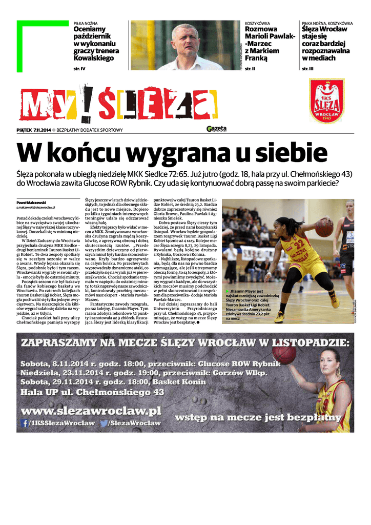 Oceniamy październik w wykonaniu graczy trenera Kowalskiego str. IV GAZETA FOT. PIOTR KRZYŻANOWSKI PIŁKA NOŻNA KOSZYKÓWKA PIŁKA NOŻNA, KOSZYKÓWKA str. II str. III Rozmowa Marioli Pawlak-Marzec z Markiem Franką Ślęza Wrocław staje się coraz bardziej rozpoznawalna w mediach SPORTOWA PI¥TEK 7.11.2014 A BEZPŁATNY DODATEK SPORTOWY PIĄTEK W końcu wygrana u siebie Paweł Malczewski [email protected] Ponad dekadę czekali wrocławscy kibice na zwycięstwo swojej ukochanej Ślęzy w najwyższej klasie rozrywkowej. Doczekali się w minioną niedzielę. W Dzień Zaduszny do Wrocławia przyjechała drużyna MKK Siedlce – drugi beniaminek Tauron Basket Ligi Kobiet. Te dwa zespoły spotkały się w zeszłym sezonie w walce o awans. Wtedy lepsza okazała się Ślęza, podobnie było i tym razem. Wrocławianki wygrały w swoim stylu - emocje były do ostatniej minuty. Początek sezonu nie był łaskawy dla fanów kobiecego basketu we Wrocławiu. Po czterech kolejkach Tauron Basket Ligi Kobiet, Ślęza mogła pochwalić się tylko jednym zwycięstwem. Na nieszczęście dla kibiców wygrać udało się daleko na wyjeździe, aż w Gdyni. Chociaż parkiet hali przy ulicy Chełmońskiego pamięta występy Ślęzy jeszcze w latach dziewięćdziesiątych, to jednak dla obecnego składu jest to nowe miejsce. Dopiero po kilku tygodniach intensywnych treningów udało się odczarować własną halę. Efekty tej pracy było widać w meczu z MKK. Zmotywowana wrocławska drużyna zagrała mądrą koszykówkę, z agresywną obroną i dobrą skutecznością rzutów. „Przede wszystkim dziewczyny od pierwszych minut były bardzo skoncentrowane. Kryły bardzo agresywnie na całym boisku. Po przechwytach wyprowadzały dynamiczne ataki, co przełożyło się na wynik już w pierwszej kwarcie. Chociaż spotkanie trzymało w napięciu do ostatniej minuty, to tak naprawdę nasze zawodniczki, kontrolowały przebieg meczu – mówi nasz ekspert - Mariola PawlakMarzec. Fantastyczne zawody rozegrała, po raz kolejny, Jhasmin Player. Tym razem zdobyła rekordowe 32 punkty i zanotowała aż 9 zbiórek. Rzucająca Ślezy jest liderką klasyfikacji punktowej w całej Tauron Basket Lidze Kobiet, ze średnią 23,2. Bardzo dobrze zaprezentowały się również Gloria Brown, Paulina Pawlak i Agnieszka Śnieżek. Dobra postawa Ślęzy cieszy tym bardziej, że przed nami koszykarski listopad. Wrocław będzie gospodarzem rozgrywek Tauron Basket Ligi Kobiet łącznie aż 4 razy. Kolejne mecze Ślęza rozegra 8,23, 29 listopada. Rywalami będą kolejno drużyny z Rybnika, Gorzowa i Konina. - Najbliższe, listopadowe spotkania, będą dla nas na pewno bardzo wymagające, ale jeśli utrzymamy obecną formę, to są to zespoły, z którymi powinniśmy zwyciężyć. Możemy wygrać z każdym, ale do wszystkich meczów musimy podchodzić w pełni skoncentrowani i z respektem dla przeciwnika– dodaje Mariola Pawlak-Marzec. Już dzisiaj zapraszamy do hali Uniwersytetu Przyrodniczego przy ul. Chełmońskiego 43, przypominając, że wstęp na mecze Ślęzy Wrocław jest bezpłatny. a b Jhasmin Player jest najskuteczniejszą zawodniczką Ślęzy Wrocław oraz całej Tauron Basket Ligi Kobiet. Niesamowita Amerykanka zdobywa średnio 23,2 pkt na mecz FOT. PIOTR ZADUMIŃSKI Ślęza pokonała w ubiegłą niedzielę MKK Siedlce 72:65. Już jutro (godz. 18, hala przy ul. Chełmońskiego 43) do Wrocławia zawita Glucose ROW Rybnik. Czy uda się kontynuować dobrą passę na swoim parkiecie? Polska Gazeta Wrocławska Piątek, 7 listopada 2014 www.gazetawroclawska.pl Koszykówka, piłka nożna //Zawody towarzyskie oraz medialność klubu// Rozmowa FOT. PIOTR ZADUMIŃSKI Z Markiem Franką, koszykarzem Ślęzy Wrocław w latach 1962-1966 i wieloletnim działaczem klubu w nowej serii wywiadów Marioli Pawlak-Marzec b Mariola Pawlak-Marzec wspólnie z zasłużonym Markiem Franką nimum 3500 kibiców. Na meczach z Wisłą i innymi czołowymi zespołami ligi obiekt był zawsze pełny. Hala mieściła wówczas około 4000 - 5000 widzów. Zainteresowanie było takie, że MPK zmuszone było podstawiać dodatkowe tramwaje. Tendencja zwyżkowa naszej frekwencji była zasługą całego klubu. I z tego byliśmy dumni. Który mecz utkwił Ci w pamięci najbardziej? Najbardziej utkwił mi w pamięci mecz z Wisłą, 1986 rok, kiedy po raz pierwszy wybiegłyście w strojach firmy Puma. W tamtym czasie była to rewelacja. Wspaniały doping 5000 kibiców, balkony pełne, przejścia zapchane stojącymi ludźmi. Mimo, że prowadziliśmy czasami 27 punktami przegraliśmy ten mecz jednym oczkiem. Pamiętam rozpacz kibiców, szczególnie tych najwierniejszych z okolic Placu Grunwaldzkiego. Oni bardzo przeżyli tę porażkę. Wtedy stwierdziłem, że prawdziwi mężczyźni łez się nie wstydzą. Mimo, że od wielu lat mieszkasz za granicą wiem, że sercem jesteś dalej ze Ślęzą…Jak wspominasz czas spędzony w tym klubie? Okres mojej działalności w Ślęzie był najwspanialszy w moim życiu i zawsze będę go miło wspominać. Miałem możliwość współpracować ze wspaniałymi ludźmi, takimi jak Janina i Eugeniusz Spisaccy oraz oczywiście całe nasze zespoły. To były czasy niesamowitych wzruszeń i pięknych wspomnień, dlatego nie ukrywam, że powracam do nich z wielkim sentymentem. W przyszłym roku 70-lecie 1 KS Ślęzy Wrocław. Mam nadzieję, że przyjedziesz i razem z nami weźmiesz udział w tym jubileuszu? Jak tylko zdrowie mi pozwoli, to oczywiście z wielką przyjemnością wezmę udział w jubileuszu. Byłoby miło odwiedzić starych znajomych. a ROZMAWIAŁA MARIOLA PAWLAK-MARZEC Coraz głośniej o Ślęzie Siódemka dla Teresy Piotr Zadumiński [email protected] 22 listopada odbędzie się impreza pod hasłem „7 for you”, podczas której dwie reprezentacje Polski koszykarek 40+ i 50+ spotkają się na meczu towarzyskim ku pamięci Teresy Kępki – Swędrowskiej. Spotkanie odbędzie się w hali przy ul. Wojciecha z Brudzewa 12a. Poc