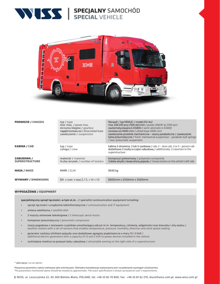 SPECJALNY SAMOCHÓD SPECIAL VEHICLE PODWOZIE / CHASSIS typ / type moc max. / power max. skrzynia biegów / gearbox napęd/rozstaw osi / drive/wheel base zawieszenie / suspension Renault / typ MDA2C / model D12 4x2 moc 206 kW przy 2100 obr/min / power 206HP at 2100 rpm zautomatyzowana 6 AS800 / semi-atomatic 6 AS800 rozstaw osi 4400 mm / wheel base 4400 mm zawieszenie przednie mechaniczne – resory paraboliczne / zawieszenie tylne pneumatyczne / front: mechanical suspension – parabolic leaf springs / rear: pneumatic suspension KABINA / CAB typ / type załoga / crew kabina 2-drzwiona, 2 lub 3-osobowa / cab: 2 – door cab, 2 or 3 – person cab dodatkowo 2 osoby w części zabudowy / additionally: 2 crewmen in the superstructure ZABUDOWA / SUPERSTRUCTURE materiał / material liczba skrytek / number of lockers kompozyt poliestrowy / polyester composite 3 dolne skrytki z lewej strony pojazdu / 3 lower lockers on the vehicle’s left side MASA / MASS MMR / GLM 9540 kg WYMIARY / DIMENSIONS [dł. x szer. x wys.] / [L x W x H] 8000mm x 2550mm x 3500mm WYPOSAŻENIE / EQUIPMENT specjalistyczny sprzęt łączności, w tym m.in. : / specialist communication equipment including: • sprzęt łączności i urządzenia teleinformatyczne / communication and IT equipment • antena satelitarna / satellite dish • 2 maszty antenowe teleskopowe / 2 telescopic aerial masts • kompresor pneumatyczny / pneumatic compressor • stacja pogodowa z zestawem czujników umożliwiająca odczyt m.in. temperatury, ciśnienia, wilgotności oraz kierunku i siły wiatru / weather station with a set of sensors that enables temperature, pressure, humidity, direction and wind speed reading • generator zasilany silnikiem pojazdu oraz dodatkowe agregaty prądotwórcze o mocy 13 i 2 kVA / additional electric generators with a capacity of 13 and 2 kVA to power devices installed in the vehicle • rozkładana markiza na prawym boku zabudowy / retractable awning on the right side of a superstructure * jako opcja / as an option Powyższe parametry należy traktować jako orientacyjne. Dokładna kompletacja wykonywana jest na podstawie wymagań użytkownika. The parameters mentioned above should be treated as approximate. The exact specification is drwan up based on user’s requirements. WISS, ul. Leszczyńska 22, 43-300 Bielsko-Biała, POLAND, tel. +48 33 82 70 800, fax: +48 33 81 62 270, [email protected], www.wiss.com.pl SPECJALNY SAMOCHÓD SPECIAL VEHICLE ISO 9001:2008 WYDANE PRZEZ BUREAU VERITAS CERTIFICATION, CO OZNACZA, ŻE PRACAUJEMY ZGODNIE Z POWYŻSZYMI STANDARDAMI. ISSUEAD BY BUREAU VERITAS CERTIFICATION, CONFIRMING THAT WE WORK IN ACCORDANCE WITH THE ABOVE STANDARDS. ISO 14001:2004 WYDANE PRZEZ BUREAU VERITAS CERTIFICATION, CO OZNACZA, ŻE PRACAUJEMY ZGODNIE Z POWYŻSZYMI STANDARDAMI. ISSUEAD BY BUREAU VERITAS CERTIFICATION, CONFIRMING THAT WE WORK IN ACCORDANCE WITH THE ABOVE STANDARDS. www.facebook.com/isswawrzaszek GRUPA WISS / WISS GROUP WISS F. M. „Bumar - Koszalin” W. RUBERG AB WISS GmbH WISS CZECH, s.r.o. POLSKA / POLAND 43-300 Bielsko-Biała, ul. Leszczyńska 22 tel. +48 33 82 70 800 [email protected] www.wiss.com.pl POLSKA / POLAND 75-842 Koszalin, ul. Lechicka 51 tel. +48 94 342 20 35÷39 [email protected] www.bumar.pl SZWECJA / SWEDEN 289 73 IMMELN, Skarviksvägen 13 tel. +46 44 20 27 50 [email protected] www.ruberg.se NIEMCY / GERMANY 63303 Dreieich, Im Steingrund 3 tel. +49 6103 995 04 15 [email protected] www.wiss-deutschland.de CZECHY / CZECH REPUBLIC 763 63 Halenkovice Halenkovice č.p. 10, tel. +420 608 180 668 [email protected] www.wiss.cz