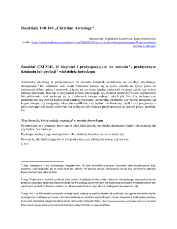 Rozdziały 148-149 „Christian Astrology” tłumaczenie: Magdalena Krukowska, Kuba Ruszkowski źródło: https://podniebosklonem.wordpress.com/2016/03/03/wyznaczanie-i-interpretacja-sygnifikatora-zawodumetoda-w-lillyego/ Rozdział CXLVIII. O biegłości i predyspozycjach do zawodu 1 , praktycznym działaniu lub profesji2 właściciela horoskopu Astrolodzy określają tu predyspozycje do zawodu, kierunek kształcenia, to, co daje satysfakcję, umiejętność 3 lub działanie, coś, czym właściciel kieruje się w życiu, zarabia na życie, przez co zachowuje dobrą opinię i szacunek, a także to, na czym spędza większość swojego życia; czy to jest funkcja publiczna, taka jak w przypadku królów lub książąt, czy wymiar sprawiedliwości, wojskowość lub polowania; inni spełniają się w działaniach innego rodzaju, takich jak filozofia, teologia czy matematyka; czy zawód będzie miał bardziej prywatny, kameralny charakter, czy będzie nauczony od kogoś innego, czy osiągnięty własnym wysiłkiem, czy będzie mechaniczny, ciężki, czy przyjemny – gdyż niewątpliwie każdy człowiek ma mniejsze lub większe predyspozycje do jakiejś pracy, profesji, etc. Trzy kwestie, które należy rozważyć w ocenie horoskopu Po pierwsze, czy urodzony ma w ogóle mieć jakiś zawód, rzemiosło, dziedzinę wiedzy lub profesję, lub czy będzie bez żadnego. Po drugie, rodzaje jego umiejętności lub dziedziny kształcenia; co to może być. Po trzecie, jaki będzie jego los w związku z tym, czy zdobędzie sławę, czy też nie. [s. 625] 1 ang. Magistery – od łacińskiego magisterium. W tym kontekście można rozumieć jako współczesne ang. mastery, czyli biegłość; to, w czym ktoś jest dobry. W dalszej części tłumaczenia wyraz dla ułatwienia odbioru bywa tłumaczony jako zawód. 2 ang. Profession – zawód, profesja (ten termin implikuje konieczność zdobycia niezbędnego wykształcenia do praktyki zawodu). Niektóre słowniki dodatkowo podają, że termin ten nie obejmuje zawodów mechanicznych ani rolniczych, jednakże trudno ustalić czy takim rozumieniem tego słowa posługiwał się również Lilly. 3 ang. Art – w XIII wieku oznaczało umiejętność nabytą w wyniku nauki lub praktyki, następnie odnosiło się do umiejętności nabywanych wraz z kształceniem się w sztukach wyzwolonych. Autor słownika z XVIII wieku podaje, że to moc czynienia czegoś nie dana przez naturę ani instynkt. Patrz: http://www.etymonline.com/index.php?term=art oraz https://books.google.pl/books?id=bXsCAAAAQAAJ&hl=pl&pg=PP130#v=onepage&q&f=false Sposób rozpatrywania sygnifikatorów Bierz pod uwagę Marsa, Wenus i Merkurego. Merkury pokazuje mądrość, która jest domeną umysłu; Mars siłę ciała i wytrzymałość; Wenus przyjemność. Jeśli więc któreś z nich położone jest w miejscach nieba pasujących do wyznaczania profesji, to jest: w domu dziesiątym, pierwszym lub siódmym, w swoich własnych godnościach, nie spalone ani pod promieniami Słońca, to planeta tak położona, lub te planety, będą oznaczały umiejętności, profesję lub zawód, do którego właściciel horoskopu się skłania. Jeżeli żadna z tych planet nie jest tak położona, rozpatrz, czy którakolwiek z trzech jest władcą znaku środka nieba i położna w godności esencjalnej. Albowiem peregrynująca lub w swoim upadku nie jest zdolna do realizowania sygnifikacji. Jeżeli ten warunek nie zachodzi, spójrz, czy któraś z tych trzech planet patrzy ściśle na Księżyc4. Jeżeli dwie lub trzy spoglądają na niego, wybierz najsilniejszą i tę, która ma najlepszy aspekt, taki aspekt, który jest bardziej ścisły i lepiej lewy niż prawy. Jeżeli żadna z trzech wymienionych już planet nie spogląda na Księżyc, spójrz, która z nich aspektuje Księżyc w zakresie połowy jej orby i najsilniejszym aspektem – tę planetę wybierz na sygnifikator profesji dziecka, o ile nie jest uszkodzona przez złośliwą planetę, ani przez koniunkcję, kwadraturę, ani opozycję. Jeżeli tak jest, nie możesz jej brać pod uwagę. Jeżeli żaden z powyższych warunków nie jest spełniony, weź tę z trzech planet, która zgodnie z ruchem prymarnym5 poprzedza Słońce i daj jej władztwo nad profesją. Zwróć uwagę, że jeśli żadna z tych trzech planet nie sygnifikuje natury profesji urodzonego zgodnie z pierwszą lub drugą regułą, tylko zgodnie z trzecią, czwartą lub piątą, to zazwyczaj osoby takie mają nędzny zawód i podchodzą do niego lekceważąco lub prowadzą życie bez żadnej profesji lub fachu w ogóle. Wiele wniosków dotyczących zawodu osób, które do mnie przychodziły, wyciągnąłem na podstawie znaku dziesiątego domu, oraz ze znaku i domu, w których przebywa władca dziesiątego domu. Według Ptolemeusza władca czyjejś profesji może być wyznaczony na dwa sposoby: poprzez Słońce i poprzez znak wierzchołka nieba. Ptolemeusz doradzał, by brać pod uwagę tę planetę, która wschodzi tuż przez Słońcem o poranku, i władcę środka nieba lub planetę w nim [dziesiątym domu], która spogląda na Księżyc. Jeśli zdarzy się, że jedna planeta nie tylko wschodzi tuż przed Słońcem, lecz także będzie władcą dziesiątego domu lub położona w dziesiątym domu, ta planeta będzie włodarzem lub sygnifikatorem działań i umiejętności urodzonego. Jeśli jedna planeta nie pełni obu tych funkcji, wybierz tę, którą pełni pierwszą. Rozdział CXLIX. Kilka wypróbowanych aforyzmów dotyczących biegłości, zawodu lub profesji właściciela horoskopu W pierwszej kolejności, jeśli sygnifikator umiejętności lub biegłości działa samotnie nadaje profesji charakter zgodnie z swoją własną naturą: wenusjańską, merkurialną lub marsową; ale jeśli jest silnie połączony z innym sygnifikatorem umiejętności, wynika z tego mieszana natura, więc jeśli Merkury jest władcą profesji, w silnym, korzystnym aspekcie z Marsem, Merkury zrzeka się swojeg