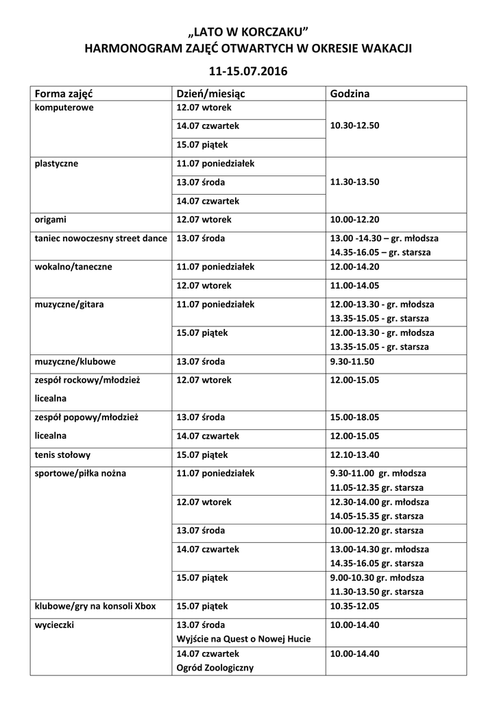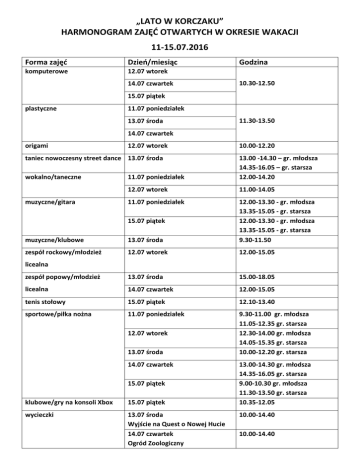 „LATO W KORCZAKU” HARMONOGRAM ZAJĘĆ OTWARTYCH W OKRESIE WAKACJI 11-15.07.2016 Forma zajęć Dzień/miesiąc komputerowe 12.07 wtorek 14.07 czwartek Godzina 10.30-12.50 15.07 piątek plastyczne 11.07 poniedziałek 13.07 środa 11.30-13.50 14.07 czwartek origami 12.07 wtorek taniec nowoczesny street dance 13.07 środa wokalno/taneczne muzyczne/gitara 10.00-12.20 11.07 poniedziałek 13.00 -14.30 – gr. młodsza 14.35-16.05 – gr. starsza 12.00-14.20 12.07 wtorek 11.00-14.05 11.07 poniedziałek muzyczne/klubowe 13.07 środa 12.00-13.30 - gr. młodsza 13.35-15.05 - gr. starsza 12.00-13.30 - gr. młodsza 13.35-15.05 - gr. starsza 9.30-11.50 zespół rockowy/młodzież 12.07 wtorek 12.00-15.05 zespół popowy/młodzież 13.07 środa 15.00-18.05 licealna 14.07 czwartek 12.00-15.05 tenis stołowy 15.07 piątek 12.10-13.40 sportowe/piłka nożna 11.07 poniedziałek 9.30-11.00 gr. młodsza 11.05-12.35 gr. starsza 12.30-14.00 gr. młodsza 14.05-15.35 gr. starsza 10.00-12.20 gr. starsza 15.07 piątek licealna 12.07 wtorek 13.07 środa 14.07 czwartek 15.07 piątek klubowe/gry na konsoli Xbox 15.07 piątek wycieczki 13.07 środa Wyjście na Quest o Nowej Hucie 14.07 czwartek Ogród Zoologiczny 13.00-14.30 gr. młodsza 14.35-16.05 gr. starsza 9.00-10.30 gr. młodsza 11.30-13.50 gr. starsza 10.35-12.05 10.00-14.40 10.00-14.40