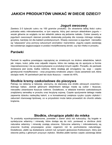 JAKICH PRODUKTÓW UNIKAĆ W DIECIE DZIECI? Jogurt owocowy Zawiera 2-3 łyżeczki cukru na 100 gramów produktu. Do strawienia takiej ilości cukru potrzeba wielu mikroelementów, w tym wapnia, który jest cennym składnikiem jogurtu – wszak głównie ze względu na ten składnik zaleca się jedzenie nabiału. Cukier zawarty w jogurtach owocowych stanowi ponadto doskonałą pożywkę dla rozwoju różnego rodzaju grzybów, bardziej niż dla bakterii probiotycznych. Wsady owocowe w jogurtach nierzadko są “ulepszane” przy pomocy sztucznych aromatów i barwników. Jogurty często zawierają też substancje zagęszczające w postaci modyfikowanej skrobi, czy też mleka w proszku. Parówki Parówki to wędlina powstająca najczęściej ze zmielonych na drobno składników, takich jak: mięso, kości, jelita oraz odpadki mięsne, które nie nadają się do spożycia w formie nieprzetworzonej i nie są wykorzystywane w produkcji innych wędlin. Ponadto, do parówek dodawana jest woda, białka roślinne, które działają jak emulgatory np. soja – często genetycznie modyfikowana – oraz przyprawy smakowe: pieprz i duża zawartość soli, która obciąża nerki. W parówkach jest też dużo tłuszczu – nawet do 40%. Słodkie kremy czekoladowe do pieczywa Patrząc na reklamę w telewizji, wierzymy, że stanowią one źródło zdrowych orzechów i dobrego kakao. Jednak głównymi składnikami takiego masła są cukier i tłuszcze, nierzadko utwardzane tłuszcze roślinne. Dodatkowo, w składzie kremów czekoladowych znajdziemy serwatkę w proszku oraz lecytynę sojową. Częste spożywanie takiego masła zapewnia dziecku nadwyżkę kalorii, a w konsekwencji zwiększa ryzyko ryzyko otyłości i zaburzeń równowagi lipidowej, co w przyszłości może także prowadzić do chorób układu krążenia. Słodkie, chrupiące płatki do mleka To produkty wysokoprzetworzone, powstałe z ziaren zbóż lub kukurydzy. Są bogate w syntetyczne witaminy i minerały, które dodaje się do nich, ponieważ w obróbce zbóż naturalne witaminy i minerały zostają utracone. Sztuczne witaminy i mikroelementy są znacznie trudniej przyswajane przez organizm niż te pochodzenia naturalnego. Dodatkowo, płatki są dosładzane cukrem lub syropem glukozowo-fruktozowym, który jest obecnie jedną z głównych przyczyn otyłości. Słodkie płatki bardzo często zawierają także substancje smakowe, które nie pozostają bez wpływu na zdrowie dzieci, a swoją chrupkość zawdzięczają fosforanom, które negatywnie wpływają na układ nerwowy. “Sztuczne” pieczywo (typu: dmuchane bułeczki) W skład domowego chleba wchodzi: mąka razowa, zakwas, sól, ziarna (słonecznik, siemię lniane, pestki dyni) oraz woda. Niestety piekarze korzystają dziś z dodatków i polepszaczy: emulgatororów, np. E330, regulatorów kwasowości, cukru, mąki pszenno-słodowej, karmelu, tłuszczu roślinnego i sztucznych barwników. Dzięki tym dodatkom zmieniają się właściwości pieczywa, np. dłużej zachowuje on świeżość, czy jest bardziej puszysty. Dodatki te tylko na pozór są w pełni bezpieczne dla zdrowia, guma guar na przykład, choć jest uznawana za substancję nieszkodliwą, może powodować wzdęcia brzucha i problemy żołądkowe. Enzym transglutaminaza dodawany do chlebów czy rogalików w celu uzyskania bardziej rozciągliwego ciasta, może być przyczyną alergii. Warto też zwrócić uwagę na opakowanie chleba – nie powinien być on pakowany w folię. Badania wykazują bowiem, że na większości z nich znajduje się pleśń, która wydziela trujące mytotoksyny. Do chlebów i wypieków długoterminowych dodaje się substancje antypleśniowe, które podrażniają śluzówkę przełyku i żołądka, powodując refluks. Produkty puszkowane Np. pomidory z puszki, tuńczyk puszkowany – nawet te przeznaczone dla dzieci zawierają wysoki poziom bisfenolu A. Mimo, że ta substancja jest wydalana z naszego organizmu za pośrednictwem nerek, jednak 1% może skumulować się w organizmie. Bisfenol ma negatywne działanie estrogenne. Naukowcy sprawdzają też jego działanie rakotwórcze oraz wpływ na zaburzenie koncentracji . Warto dodać, że w niektórych krajach, takich jak Dania, Kanada, Stany Zjednoczone, Korea, Japonia i Australia, wprowadzono zakaz stosowania tej substancji do produkcji butelek plastikowych przeznaczonych dla dzieci. Innym zagrożeniem, powiązanym bezpośrednio z produktami puszkowymi, jest aluminium, które jest kumulowane w organizmie przez lata. Uszkadza układ nerwowy, a z doniesień naukowych wynika, że ma związek z występowaniem takich chorób, jak Alzheimer lub Parkinson. Soki z zagęszczanych soków lub przecierów Do produkcji takich soków używa się koncentratów, które powstają poprzez odparowanie wody i usunięcie miazgi z owoców. Aby uzyskać sok przeznaczony do picia, ponownie dodaje się wodę, która wcześniej została odparowana, odtwarza się na nowo aromat i dodaje miazgę z owoców. Do takich soków mogą być dodawane także witaminy, sole mineralne i kwasy spożywcze. Dozwolone jest także dodanie cukru lub syropu glukozofruktozowego. Jeżeli jest go nie więcej 2 łyżeczki na litr, producent nie ma obowiązku podawania go w składzie. Do soków warzywnych można dodawać sól, przyprawy i zioła oraz ich ekstrakty. Nektary i napoje to soki rozcieńczane z wodą i dosładzane. Pamiętajmy, że syrop glukozo – fruktozowy i cukier mają bardzo niekorzystny wpływ na zdrowie. Polecamy więc do picia soki nieprodukowane z koncentratów owocowych czy warzywnych, które nie są dosładzane. Takie soki warto rozcieńczać z wodą. Rozpuszczalne herbatki Przykładowy skład takiej herbatki zawiera: cukier, glukozę, regulator kwasowości: kwas cytrynowy, ekstrakt z aronii, ekstrakty owocowe 0,45% (ananas, pomarańcza, banan, maltodekstryna), aromaty, witaminę E, witaminę C, tiaminę, ryboflawinę, witaminę B6, niacynę, witaminę B12, biotynę, kwas pant