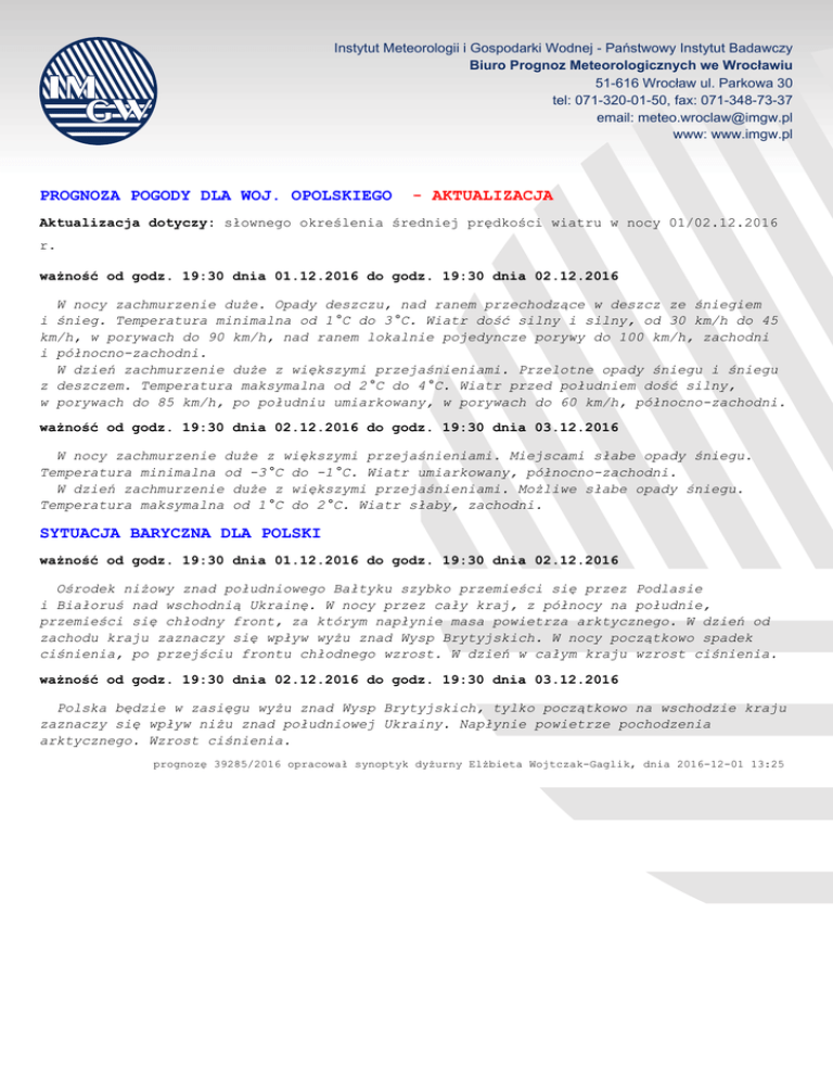 Instytut Meteorologii i Gospodarki Wodnej - Państwowy Instytut Badawczy Biuro Prognoz Meteorologicznych we Wrocławiu 51-616 Wrocław ul. Parkowa 30 tel: 071-320-01-50, fax: 071-348-73-37 email: [email protected] www: www.imgw.pl PROGNOZA POGODY DLA WOJ. OPOLSKIEGO - AKTUALIZACJA Aktualizacja dotyczy: słownego określenia średniej prędkości wiatru w nocy 01/02.12.2016 r. ważność od godz. 19:30 dnia 01.12.2016 do godz. 19:30 dnia 02.12.2016 W nocy zachmurzenie duże. Opady deszczu, nad ranem przechodzące w deszcz ze śniegiem i śnieg. Temperatura minimalna od 1°C do 3°C. Wiatr dość silny i silny, od 30 km/h do 45 km/h, w porywach do 90 km/h, nad ranem lokalnie pojedyncze porywy do 100 km/h, zachodni i północno-zachodni. W dzień zachmurzenie duże z większymi przejaśnieniami. Przelotne opady śniegu i śniegu z deszczem. Temperatura maksymalna od 2°C do 4°C. Wiatr przed południem dość silny, w porywach do 85 km/h, po południu umiarkowany, w porywach do 60 km/h, północno-zachodni. ważność od godz. 19:30 dnia 02.12.2016 do godz. 19:30 dnia 03.12.2016 W nocy zachmurzenie duże z większymi przejaśnieniami. Miejscami słabe opady śniegu. Temperatura minimalna od -3°C do -1°C. Wiatr umiarkowany, północno-zachodni. W dzień zachmurzenie duże z większymi przejaśnieniami. Możliwe słabe opady śniegu. Temperatura maksymalna od 1°C do 2°C. Wiatr słaby, zachodni. SYTUACJA BARYCZNA DLA POLSKI ważność od godz. 19:30 dnia 01.12.2016 do godz. 19:30 dnia 02.12.2016 Ośrodek niżowy znad południowego Bałtyku szybko przemieści się przez Podlasie i Białoruś nad wschodnią Ukrainę. W nocy przez cały kraj, z północy na południe, przemieści się chłodny front, za którym napłynie masa powietrza arktycznego. W dzień od zachodu kraju zaznaczy się wpływ wyżu znad Wysp Brytyjskich. W nocy początkowo spadek ciśnienia, po przejściu frontu chłodnego wzrost. W dzień w całym kraju wzrost ciśnienia. ważność od godz. 19:30 dnia 02.12.2016 do godz. 19:30 dnia 03.12.2016 Polska będzie w zasięgu wyżu znad Wysp Brytyjskich, tylko początkowo na wschodzie kraju zaznaczy się wpływ niżu znad południowej Ukrainy. Napłynie powietrze pochodzenia arktycznego. Wzrost ciśnienia. prognozę 39285/2016 opracował synoptyk dyżurny Elżbieta Wojtczak-Gaglik, dnia 2016-12-01 13:25