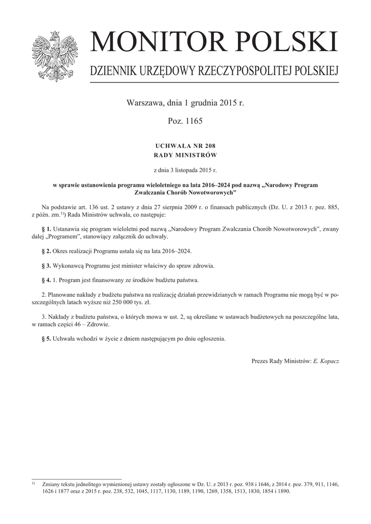 MONITOR POLSKI DZIENNIK URZĘDOWY RZECZYPOSPOLITEJ POLSKIEJ Warszawa, dnia 1 grudnia 2015 r. Poz. 1165 UCHWAŁA NR 208 RADY MINISTRÓW z dnia 3 listopada 2015 r. w sprawie ustanowienia programu wieloletniego na lata 2016–2024 pod nazwą „Narodowy Program Zwalczania Chorób Nowotworowych” Na podstawie art. 136 ust. 2 ustawy z dnia 27 sierpnia 2009 r. o finansach publicznych (Dz. U. z 2013 r. poz. 885, z późn. zm.1)) Rada Ministrów uchwala, co następuje: § 1. Ustanawia się program wieloletni pod nazwą „Narodowy Program Zwalczania Chorób Nowotworowych”, zwany dalej „Programem”, stanowiący załącznik do uchwały. § 2. Okres realizacji Programu ustala się na lata 2016–2024. § 3. Wykonawcą Programu jest minister właściwy do spraw zdrowia. § 4. 1. Program jest finansowany ze środków budżetu państwa. 2. Planowane nakłady z budżetu państwa na realizację działań przewidzianych w ramach Programu nie mogą być w poszczególnych latach wyższe niż 250 000 tys. zł. 3. Nakłady z budżetu państwa, o których mowa w ust. 2, są określane w ustawach budżetowych na poszczególne lata, w ramach części 46 – Zdrowie. § 5. Uchwała wchodzi w życie z dniem następującym po dniu ogłoszenia. Prezes Rady Ministrów: E. Kopacz 1) Zmiany tekstu jednolitego wymienionej ustawy zostały ogłoszone w Dz. U. z 2013 r. poz. 938 i 1646, z 2014 r. poz. 379, 911, 1146, 1626 i 1877 oraz z 2015 r. poz. 238, 532, 1045, 1117, 1130, 1189, 1190, 1269, 1358, 1513, 1830, 1854 i 1890. Monitor Polski – 2 – Poz. 1165 Załącznik do uchwały nr 208 Rady Ministrów z dnia 3 listopada 2015 r. (poz. 1165) PROGRAM WIELOLETNI NA LATA 2016–2024 „NARODOWY PROGRAM ZWALCZANIA CHORÓB NOWOTWOROWYCH” Monitor Polski – 3 – Poz. 1165 Spis treści I. Jednostka organizacyjna wykonująca i nadzorująca Program ....................................... 4 II. Ramy prawne dokumentu i powiązania z innymi dokumentami strategicznymi ................... 4 III. Diagnoza w obszarze objętym programowaniem ................................................................... 5 IV. Cel główny Programu ...................................................................................................... 14 V. Priorytety Programu ......................................................................................................... 14 V.1 Promocja zdrowia i profilaktyka nowotworów ............................................................ 14 V.1.1 Cele szczegółowe w ramach priorytetu ...................................................................... 15 V.1.2 Kierunki interwencji w ramach priorytetu ................................................................ 15 V.2 Profilaktyka wtórna, diagnostyka oraz wykrywanie nowotworów ............................ 17 V.2.1 Cele szczegółowe w ramach priorytetu ...................................................................... 17 V.2.2 Kierunki interwencji w ramach priorytetu ................................................................ 18 V.3 Wsparcie procesu leczenia nowotworów ....................................................................... 22 V.3.1 Cele szczegółowe w ramach priorytetu ...................................................................... 22 V.3.2 Kierunki interwencji w ramach priorytetu ................................................................ 23 V.4 Edukacja onkologiczna ................................................................................................... 25 V.4.1 Cel szczegółowy w ramach priorytetu ........................................................................ 25 V.4.2 Kierunek interwencji w ramach priorytetu ............................................................... 25 V.5 Wspomaganie systemu rejestracji nowotworów .......................................................... 27 V.5.1 Cel szczegółowy w ramach priorytetu ........................................................................ 27 V.5.2 Kierunek interwencji w ramach priorytetu ............................................................... 27 VI. Sposób realizacji Programu ............................................................................................ 28 VII. Plan finansowy Programu ............................................................................................. 29 VIII. Monitoring Programu i ocena stopnia osiągnięcia celów Programu ....................... 30 Monitor Polski – 4 – Poz. 1165 I. Jednostka organizacyjna wykonująca i nadzorująca Program Program wieloletni na lata 2016–2024 pod nazwą „Narodowy Program Zwalczania Chorób Nowotworowych”, zwany dalej „Programem”, jest wykonywany i nadzorowany przez ministra właściwego do spraw zdrowia. II. Ramy prawne dokumentu i powiązania z innymi dokumentami strategicznymi Program jest programem wieloletnim realizowanym na podstawie art. 136 ustawy z dnia 27 sierpnia 2009 r. o finansach publicznych (Dz. U. z 2013 r. poz. 885, z późn. zm.). Ponadto Program jest programem rozwoju, zgodnie z art. 15 ust. 4 pkt 2 ustawy z dnia 6 grudnia 2006 r. o zasadach prowadzenia polityki rozwoju (Dz. U. z 2014 r. poz. 1649, z późn. zm.). Podstawowym źródłem zasad i celów wspólnotowej polityki rozwoju jest prawo traktatowe, zawarte w Traktacie z Lizbony zmieniającym Traktat o Unii Europejskiej i Traktat ustanawiający Wspólnotę Europejską (Dz. U. z 2009 r. Nr 203, poz. 1569). Program wpisuje się w obszar strategiczny Strategii Rozwoju Kraju I. „Sprawne i efektywne państwo” Cel I.3. „Wzmocnienie warunków sprzyjających realizacji indywidualnych potrzeb i aktywności obywatela” kierunek interwencji I.3.3. „Zwiększenie bezpieczeństwa obywatela”. Strategia zakłada, że w związku z wyzwaniami demograficznymi w najbliższej dekadzie nacisk będzie położony na te segmenty ochrony zdrowia, które będą odpowiadać wyzwaniom epidemiologicznym starzejącego się społeczeństwa. W strategii jako pri