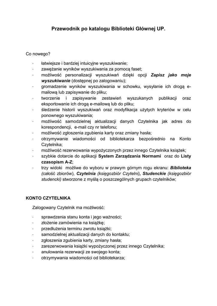 Przewodnik po katalogu Biblioteki Głównej UP. Co nowego? · · · · · · · · · · · · łatwiejsze i bardziej intuicyjne wyszukiwanie; zawężanie wyników wyszukiwania za pomocą faset; możliwość personalizacji wyszukiwań dzięki opcji Zapisz jako moje wyszukiwanie (dostępnej po zalogowaniu); gromadzenie wyników wyszukiwania w schowku, wysyłanie ich drogą emailową lub zapisywanie do pliku; tworzenie i zapisywanie zestawień wyszukanych publikacji oraz eksportowanie ich drogą e-mailową lub do pliku; śledzenie historii wyszukiwań oraz modyfikacja użytych kryteriów w celu ponownego wyszukiwania; możliwość samodzielnej aktualizacji danych Czytelnika jak adres do korespondencji, e-mail czy nr telefonu; możliwość zgłoszenia zgubienia karty oraz zmiany hasła; otrzymywanie wiadomości od bibliotekarza bezpośrednio na Konto Czytelnika; możliwość rezerwowania wypożyczonych przez innego Czytelnika książek; szybkie dotarcie do aplikacji System Zarządzania Normami oraz do Listy czasopism A-Z; trzy widoki możliwe do wyboru w prawym górnym rogu ekranu: Biblioteka (całość zbiorów), Czytelnia (księgozbiór Czytelni), Studenckie (księgozbiór studencki) stworzone z myślą o poszczególnych grupach czytelników; KONTO CZYTELNIKA Zalogowany Czytelnik ma możliwość: · · · · · · · · sprawdzenia stanu konta i jego ważności; złożenie zamówienia na książkę; przedłużenia terminu zwrotu książki; samodzielnej aktualizacji danych do kontaktu; zgłoszenia zgubienia karty, zmiany hasła; zarezerwowania książki wypożyczonej przez innego Czytelnika; anulowania rezerwacji ze swojego konta; otrzymywania wiadomości od bibliotekarza; Logowanie W polu Login należy wpisać numer karty bibliotecznej, a w polu Hasło - hasło do konta bibliotecznego. W przypadku studentów i doktorantów UP w Lublinie loginem jest numer legitymacji zaczynający się od 034, zaś hasłem domyślnie są cztery ostatnie cyfry numeru karty bibliotecznej (legitymacji). Zaleca się zmianę hasła po pierwszym zalogowaniu. Uwaga! Sesja zostanie zamknięta po 20 minutach braku aktywności. Odzyskiwanie zapomnianego hasła Zapomniane hasło można odzyskać, poprzez kliknięcie na przycisk Zaloguj bez wpisywania danych dotyczących loginu oraz hasła, a następnie na link Nie pamiętam hasła. Nowe hasło zostanie wysłane na podany adres e-mail. Zalecamy zmianę nowego hasła po pierwszym zalogowaniu się. Dodawanie adresu e-mail do konta Po zalogowaniu się na konto, w zakładce Dane o Czytelniku / zmiana adresu i hasła, należy edytować dane, następnie jako sposób komunikowania się wybrać email i uzupełnić formularz o adres e-mail. SPOSOBY WYSZUKIWANIA Wyszukiwanie proste W polu Szukaj wpisujemy wybrane przez nas słowo (słowa) lub fragment słowa, maskując pozostałą część za pomocą gwiazdki „*” . Wyniki sortowane są wg trafności. Jako pierwsze wyświetlane są opisy, w których dane słowo kluczowe występuje w polach takich jak: tytuł, autor, temat, a następnie w pozostałych polach opisu. Sortowanie można zmienić, wybierając odpowiednie z rozwijanej listy: Wyszukiwanie możemy zawęzić poprzez dodatkowe kryteria, korzystając z faset po lewej stronie ekranu. Wyszukiwanie zaawansowane: Poniżej okna przeznaczonego do wyszukiwania prostego znajduje się link do wyszukiwania zaawansowanego. Możemy tu wybrać z rozwijanej listy przeszukiwane pole: Autor, Tytuł, Hasło przedmiotowe, Sygnatura itd., oraz sprecyzować składnię wyszukiwania a także zastosować filtry. Wyszukiwanie w hasłach Wyszukiwanie w hasłach (zakładka w menu głównym) umożliwia wyszukiwanie poprzez autora, tytuł, tytuł czasopisma czy hasło przedmiotowe. Wyniki wyszukiwania przez hasła przedstawione są jako odsyłacze: SCHOWEK Schowek służy do gromadzenia wyników wyszukiwania. Zebrane pozycje możemy wysłać jako zestawienie bibliograficzne na wskazany adres e-mail bądź wyeksportować do pliku tekstowego. Zalogowany Czytelnik może zapisać wybrane pozycje ze schowka jako zestawienie bibliograficzne. Schowek przechowuje jedynie dane bieżącej sesji. ZESTAWIENIA Zestawienia bibliograficzne możemy tworzyć z pozycji zapisanych do schowka. Po wejściu do schowka zaznaczamy wybrane pozycje i zapisujemy jako nowe zestawienie lub dopisujemy do istniejącego. Zestawienia można ze sobą łączyć. Istnieje też możliwość wysyłania utworzonych zestawień poprzez e-mail lub eksportu do pliku. Dostęp do zapisanych zestawień uzyskamy z menu głównego po zalogowaniu się na konto. Uwaga! Po upływie 30 dni bez modyfikacji zestawienia, jest ono usuwane z konta Czytelnika. HISTORIA WYSZUKIWANIA Historia wyszukiwania umożliwia dotarcie do wcześniej przeprowadzonych wyszukiwań w bieżącej sesji. Nie jest dostępna po odnowieniu sesji. FASETY Fasety umieszczone po lewej stronie ekranu umożliwiają zawężanie wyników bieżącego wyszukiwania. Możemy zawęzić wyszukiwanie wg klasyfikacji, zawartości, typu dokumentu, miejsca i daty wydania oraz języka. SZCZEGÓŁY OPISU Kliknięcie na wybrany tytuł odsyła do szczegółowych informacji dotyczących danej pozycji oraz wykazu egzemplarzy (lub szczegółów zasobu, w przypadku wydawnictw ciągłych). Z tego ekranu można dokonywać zamówień oraz rezerwacji. REZERWACJE Rezerwację na książkę wypożyczoną przez innego Czytelnika można złożyć po zalogowaniu się na swoje konto, klikając na przycisk „Rezerwuj” na ekranie egzemplarzy. Rezerwację można anulować po zalogowaniu się na konto. Nie jest możliwa rezerwacja książek z księgozbioru studenckiego. POMOC Dla każdego ekranu katalogu dostępna jest pomoc pod znakiem „?” w prawym górnym rogu. WAŻNA INFORMACJA Osoby chcące zamówić materiały do Czytelni, powinny posiadać ważną kartę biblioteczną lub legitymację studencką. Dla osób spoza Uczelni przygotowaliśmy specjalne konto, na które można się zalogować, wpisując jako lo