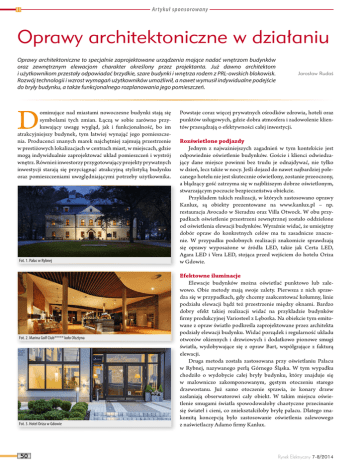 Artykuł sponsorowany Oprawy architektoniczne w działaniu Oprawy architektoniczne to specjalnie zaprojektowane urządzenia mające nadać wnętrzom budynków oraz zewnętrznym elewacjom charakter określony przez projektanta. Już dawno architektom i użytkownikom przestały odpowiadać brzydkie, szare budynki i wnętrza rodem z PRL-owskich blokowisk. Rozwój technologii i wzrost wymagań użytkowników umożliwił, a nawet wymusił indywidualne podejście do bryły budynku, a także funkcjonalnego rozplanowania jego pomieszczeń. D ominujące nad miastami nowoczesne budynki stają się symbolami tych zmian. Łączą w sobie zarówno przykuwający uwagę wygląd, jak i funkcjonalność, bo im atrakcyjniejszy budynek, tym łatwiej wynająć jego pomieszczenia. Producenci znanych marek najchętniej zajmują przestrzenie w prestiżowych lokalizacjach w centrach miast, w miejscach, gdzie mogą indywidualnie zaprojektować układ pomieszczeń i wystrój wnętrz. Również inwestorzy przygotowujący projekty prywatnych inwestycji starają się przyciągnąć atrakcyjną stylistyką budynku oraz pomieszczeniami uwzględniającymi potrzeby użytkownika. Fot. 1. Pałac w Rybnej Fot. 2. Marina Golf Club***** koło Olsztyna Fot. 3. Hotel Oriza w Gdowie 50 Jarosław Rudaś Powstaje coraz więcej prywatnych ośrodków zdrowia, hoteli oraz punktów usługowych, gdzie dobra atmosfera i zadowolenie klientów przesądzają o efektywności całej inwestycji. Rozświetlone podjazdy Jednym z najważniejszych zagadnień w tym kontekście jest odpowiednie oświetlenie budynków. Goście i klienci odwiedzający dane miejsce powinni bez trudu je odnajdywać, nie tylko w dzień, lecz także w nocy. Jeśli dojazd do nawet najbardziej polecanego hotelu nie jest skutecznie oświetlony, zostanie przeoczony, a błądzący gość zatrzyma się w najbliższym dobrze oświetlonym, stwarzającym poczucie bezpieczeństwa obiekcie. Przykładem takich realizacji, w których zastosowano oprawy Kanlux, są obiekty prezentowane na www.kanlux.pl – np. restauracja Avocado w Sieradzu oraz Villa Otwock. W obu przypadkach oświetlenie przestrzeni zewnętrznej zostało oddzielone od oświetlenia elewacji budynków. Wyraźnie widać, że umiejętny dobór opraw do konkretnych celów ma tu zasadnicze znaczenie. W przypadku podobnych realizacji znakomicie sprawdzają się oprawy wyposażone w źródła LED, takie jak Certa LED, Agara LED i Vera LED, stojąca przed wejściem do hotelu Oriza w Gdowie. Efektowne iluminacje Elewacje budynków można oświetlać punktowo lub zalewowo. Obie metody mają swoje zalety. Pierwsza z nich sprawdza się w przypadkach, gdy chcemy zaakcentować kolumny, linie podziału elewacji bądź też przestrzenie między oknami. Bardzo dobry efekt takiej realizacji widać na przykładzie budynków firmy produkcyjnej Variosteel z Lęborka. Na obiekcie tym emitowane z opraw światło podkreśla zaprojektowane przez architekta podziały elewacji budynku. Widać porządek i regularność układu otworów okiennych i drzwiowych i dodatkowo pionowe smugi światła, wydobywające się z opraw Bart, współgrające z fakturą elewacji. Druga metoda została zastosowana przy oświetlaniu Pałacu w Rybnej, nazywanego perłą Górnego Śląska. W tym wypadku chodziło o wydobycie całej bryły budynku, który znajduje się w malowniczo zakomponowanym, gęstym otoczeniu starego drzewostanu. Już samo otoczenie sprawia, że konary drzew zasłaniają obserwatorowi cały obiekt. W takim miejscu oświetlenie smugami światła spowodowałoby chaotyczne przecinanie się świateł i cieni, co zniekształciłoby bryłę pałacu. Dlatego znakomitą koncepcją było zastosowanie oświetlenia zalewowego z naświetlaczy Adamo firmy Kanlux. Rynek Elektryczny 7-8/2014 Artykuł sponsorowany Światło w różnych wnętrzach Gdy efektownie oświetlone elewacje zapraszają do środka, oczekujemy, że architekt dołożył starań, aby wnętrza nie ustępowały zaprojektowanemu otoczeniu. Wizytówką każdego biurowca, hotelu bądź przychodni jest przede wszystkim recepcja. W dobrym hotelu już przy wejściu powinniśmy odczuć wysoki standard obiektu, jego przepych, a nawet luksus. Doskonale to widać w Marina Golf Club koło Olsztyna, gdzie przestronne wnętrze jest intensywnie oświetlone, a prym wiodą w nim oprawy typu downlight Mateo DLP. Z kolei w biurach najważniejsze jest zaprezentowanie profesjonalizmu firmy już od jej progu. Elegancja i minimalizm to najczęściej spotykane rozwiązania w takich miejscach. Funkcjonalność łączy się tutaj z energooszczędnymi rozwiązaniami. Oświetlenie musi spełniać normy, a zarazem podkreślać prestiż miejsca. Właściwe natężenie i jakość oświetlenia wpływają także na wydajność pracy i popełniane błędy. Dlatego warto zadbać o wykreowanie przestrzeni sprzyjającej efektywnemu wykonywaniu zadań. Świetnie uzupełniającym się duetem do zastosowań biurowych są oprawy Lestra 228-SR oraz kinkiety Lucea EL-14 – używane przez firmę Elhurt3 w Osieczanach. Świecąc do góry i dołu, obie oprawy oświetlają płaszczyznę pracy, a przy tym wypełniają przestrzeń światłem, co tworzy równomierne poziomy natężenia oświetlenia w całym pomieszczeniu. Ta sama zasada dobrego oświetlenia miejsc pracy obowiązuje również w skali makro. Przykładem może być Zakład Remontowy Lokomotywownia w Łodzi, gdzie do ogólnego oświetlenia zostały zastosowane oprawy Euro MTH-400-21AL. Podwieszone pod kratownicą kilkunastometrowej hali, zapewniają równomierne oświetlenie miejsc pracy. Dodatkowo powierzchnie boczne remontowanych pojazdów doświetlane są za pomocą oprawy Avia MTH-478. Cała instalacja zapewnia odpowiednie poziomy natężenia oświetlenia przy stosunkowo niskim zużyciu energii. Jeszcze inny sposób wykorzystania oświetlenia widoczny jest w galeriach. W przeciwieństwie do biur i przestrzeni przemysłowych nie dąży się w nich do równomiernego rozł