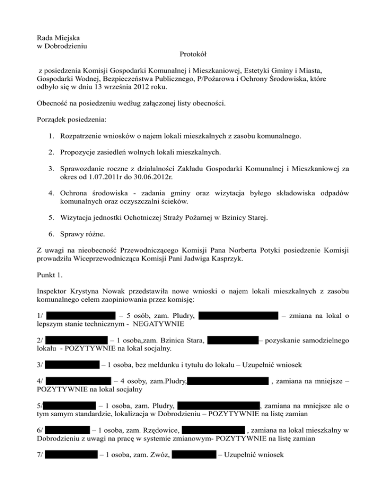 Rada Miejska w Dobrodzieniu Protokół z posiedzenia Komisji Gospodarki Komunalnej i Mieszkaniowej, Estetyki Gminy i Miasta, Gospodarki Wodnej, Bezpieczeństwa Publicznego, P/Pożarowa i Ochrony Środowiska, które odbyło się w dniu 13 września 2012 roku. Obecność na posiedzeniu według załączonej listy obecności. Porządek posiedzenia: 1. Rozpatrzenie wniosków o najem lokali mieszkalnych z zasobu komunalnego. 2. Propozycje zasiedleń wolnych lokali mieszkalnych. 3. Sprawozdanie roczne z działalności Zakładu Gospodarki Komunalnej i Mieszkaniowej za okres od 1.07.2011r do 30.06.2012r. 4. Ochrona środowiska - zadania gminy oraz wizytacja byłego składowiska odpadów komunalnych oraz oczyszczalni ścieków. 5. Wizytacja jednostki Ochotniczej Straży Pożarnej w Bzinicy Starej. 6. Sprawy różne. Z uwagi na nieobecność Przewodniczącego Komisji Pana Norberta Potyki posiedzenie Komisji prowadziła Wiceprzewodnicząca Komisji Pani Jadwiga Kasprzyk. Punkt 1. Inspektor Krystyna Nowak przedstawiła nowe wnioski o najem lokali mieszkalnych z zasobu komunalnego celem zaopiniowania przez komisję: 1/ SKROBISZ Angelika – 5 osób, zam. Pludry, Osiedle Robotnicze 2/8 – zmiana na lokal o lepszym stanie technicznym - NEGATYWNIE 2/ BEDNAREK Piotr – 1 osoba,zam. Bzinica Stara, ul.Główna 30/2 – pozyskanie samodzielnego lokalu - POZYTYWNIE na lokal socjalny. 3/ MUDRY Andrzej – 1 osoba, bez meldunku i tytułu do lokalu – Uzupełnić wniosek 4/ MIKA Adam i Irena – 4 osoby, zam.Pludry, Osiedle Robotnicze 19/1 , zamiana na mniejsze – POZYTYWNIE na lokal socjalny 5/ CZYŻ Barbara – 1 osoba, zam. Pludry, Osiedle Robotnicze 19/14, zamiana na mniejsze ale o tym samym standardzie, lokalizacja w Dobrodzieniu – POZYTYWNIE na listę zamian 6/ PEŁKA Anna – 1 osoba, zam. Rzędowice, ul. Dobrodzieńska 1 , zamiana na lokal mieszkalny w Dobrodzieniu z uwagi na pracę w systemie zmianowym- POZYTYWNIE na listę zamian 7/ CIERPIOŁ Leon – 1 osoba, zam. Zwóz, ul. Stawowa 2 – Uzupełnić wniosek 8/ SZCZUREK Mariola – osób, zam.Myślina, ul. Przejazdowa 16 – Uzupełnić wniosek Punkt 2. Pani Krystyna Nowak przedstawiła propozycje zasiedleń wolnych lokali mieszkalnych: 1/ Pludry, ul.Brzozowa 2 – lokal składa się z 3 pokoi, kuchni, łazienki i p/pokoju. Łączna powierzchnia użytkowa 80,46m2 - REZERWA LOKALOWA do dyspozycji Burmistrza wg potrzeb 2/ Dobrodzień, ul. Oleska 1a/27 – powierzchnia użytkowa 28,72m2 , lokal posiada centralne ogrzewanie Propozycje zasiedleń: 1. Wojcik Sonia - 1 osoba 2. Szyszka Barbara - 1 osoba 3/ Dobrodzień, Plac Wolności 23/2 – 2 pokoje, kuchnia, łazienka, p/pokój. Lokal posiada centralne ogrzewanie Propozycja zasiedlenia: 1. Czyż Barbara – 1 osoba , zwolni 4 pokoje w Pludrach 4/ Ligota Dobrodzieńska ul. Wojska Polskiego 70, lokale socjalne, kuchnia, łazienka, p/pokój do wspólnego użytkowania, centralne ogrzewanie - lokal nr 3 o powierzchni 18,16m2 - 2 pomieszczenia oraz lokal nr 4 o powierzchni 13,65m2 – 1 pomieszczenie :łączna powierzchnia użytkowa pomieszczeń 31,81m2 propozycja zasiedlenia Poloczek Barbara – 3 osoby ( eksmisja ) − lokal nr 1 o powierzchni 25,55m2 – 2 pomieszczenia : propozycja zasiedlenia Mika Adam i Irena 4 osoby 5/ Ligota Dobrodzieńska, ul. Wojska Polskiego 70/4 – 2 pokoje, kuchnia, łazienka,p/pokój o łącznej powierzchni 58,64m2 - REZERWA LOKALOWA do dyspozycji Burmistrza wg potrzeb 6/ Dobrodzień, ul. Lubliniecka 17 – 2 pokoje, kuchnia, p/pokój,korytarz, pomieszczenie kotłowni etażowe co, powierzchnia użytkowa 68,24m2 Propozycja zasiedlenia : 1. Kondziela Małgorzata - 3 osoby Ponadto Pani Krystyna Nowak, że w remoncie znajdują się: − Dobrodzień,Plac Wolności 20 ( budynek frontowy od strony Rynku ). − Dobrodzień, Ks. Gładysza 11 ( parter) Poinformowała także, że u Komornika znajduje się sprawa P. Mirek z Turzy z ul. Kolejowej. Zasygnalizowała sprawę Pana Aleksandra Moroń – ewentualny przydział lokalu w Dobrodzieniu przy ul. Szemrowickiej 1/13 Burmistrz wyjaśniła, że Pan Moroń obecnie lokal ten nie nadaje się do zamieszkania. Pan Moroń przebywał w Domu Pomocy Społecznej w Kamiennej z którego sam zrezygnował. Pani Krystyna Nowak poinformowała także o : − aktualizacji listy oczekujących, − rezygnacjach z przydziału lokalu mieszkalnego, − zabezpieczeniu lokali socjalnych na cele eksmisji dla 2 rodzin, dla Zakładu Gospodarki Komunalnej i Mieszkaniowej w Dobrodzieniu celem wykonania eksmisji, (lokal mieszkalny Dobrodzień, ul.Szemrowicka 1/9 z chwilą zwolnienia przez rodzinę Pani Poloczek Barbary zabezpieczyć na cele eksmisji dla rodziny Pani Szafczyk Emilia -6 osób z Dobrodzienia, ul.Solna 1/1 ). Punkt 3. Dyrektor Zakładu Gospodarki Komunalnej i Mieszkaniowej w Dobrodzieniu zgodnie z § 3 ust.4 Regulaminu Organizacyjnego Zakładu Gospodarki Komunalnej i Mieszkaniowej przekazał informację o sprawozdaniu rocznym z działalności zakładu za okres od 1 lipca 2011 roku do 30 czerwca 2012 roku. Sprawozdanie stanowi załącznik do protokołu. Punkt 4. Dyrektor Zakładu Gospodarki Komunalnej i Mieszkaniowej w Dobrodzieniu przedstawił informację na temat rekultywacji składowiska odpadów innych niż niebezpieczne i obojętne w Błachowie oraz zwiększenie zasięgu oddziaływania istniejącego systemu segregacji odpadów na terenie Gminy Dobrodzień W związku z zamknięciem i rekultywacją składowiska odpadów w Błachowie wykonano następujące prace: − roboty ziemne, związane z ukształtowaniem wierzchowiny składowiska oraz ukształtowaniem skarpy wschodniej, − roboty ziemne związane z wykonaniem okrywy rekultywacyjnej, − rekultywacją biologiczną. W fazie wykonywania robót związanych z ukształtowaniem wierzchowiny i skarp składowiska zainstalowane zostały 3 piezometry obserwacyjne w celu monitorowania wód podziemnych. Wykonano także instalację do odgazowania składowiska. W związku z niesprzyjającą pogodą komisja odst