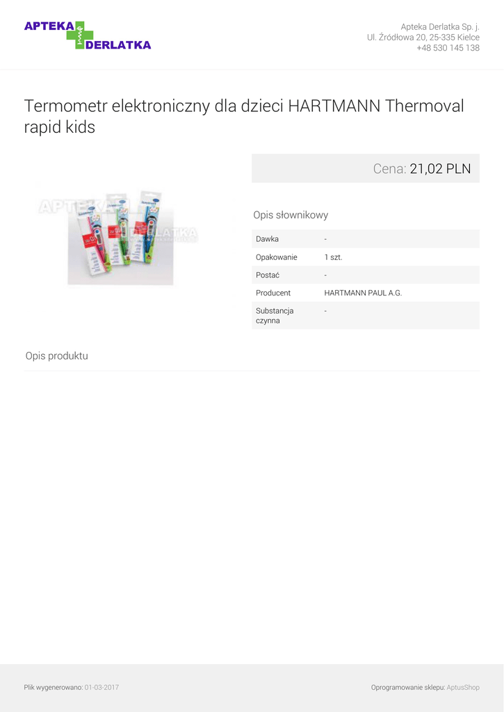 Apteka Derlatka Sp. j. Ul. Źródłowa 20, 25-335 Kielce +48 530 145 138 Termometr elektroniczny dla dzieci HARTMANN Thermoval rapid kids Cena: 21,02 PLN Opis słownikowy Dawka - Opakowanie 1 szt. Postać - Producent HARTMANN PAUL A.G. Substancja czynna - Opis produktu Plik wygenerowano: 01-03-2017 Powered by TCPDF (www.tcpdf.org) Oprogramowanie sklepu: AptusShop
