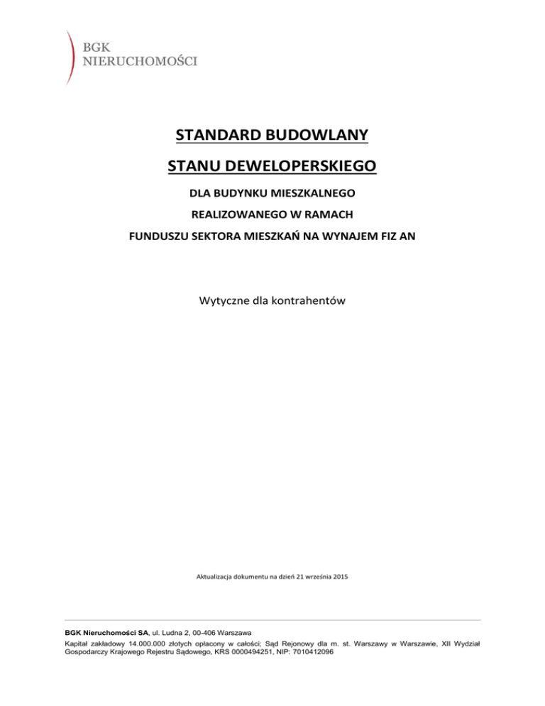 STANDARD BUDOWLANY STANU DEWELOPERSKIEGO DLA BUDYNKU MIESZKALNEGO REALIZOWANEGO W RAMACH FUNDUSZU SEKTORA MIESZKAŃ NA WYNAJEM FIZ AN Wytyczne dla kontrahentów Aktualizacja dokumentu na dzień 21 września 2015 BGK Nieruchomości SA, ul. Ludna 2, 00-406 Warszawa Kapitał zakładowy 14.000.000 złotych opłacony w całości; Sąd Rejonowy dla m. st. Warszawy w Warszawie, XII Wydział Gospodarczy Krajowego Rejestru Sądowego, KRS 0000494251, NIP: 7010412096 I. INFORMACJE OGÓLNE 1. Wstęp Celem niniejszego dokumentu jest prezentacja parametrów, kryteriów oraz wytycznych dla projektowania i wykonania budynków realizowanych w ramach projektów nadzorowanych przez Fundusz Mieszkań na Wynajem. Obowiązujące regulacje prawne i techniczne dotyczące projektowania, wykonania i odbioru budynków mieszkalnych wielorodzinnych są przepisami nadrzędnymi nad treścią przedmiotowego opracowania. Kryteriami rozszerzającymi wymagania stawiane projektantom i inwestorom - w ramach obowiązujących przepisów dotyczących projektowania budynków mieszkalnych wielorodzinnych - jest wznoszenie budynków o rozwiązaniach: a. proekologicznych uwzględniających normy i przepisy ochrony środowiska i gospodarowania odpadami, b. energooszczędnych minimalizujących konieczność zużycia energii elektrycznej dla zapewnienia podstawowych warunków użytkowania lokali mieszkalnych przez najemców oraz części wspólnych niezbędnych do prawidłowej eksploatacji budynku, c. termo oszczędnych minimalizujących konieczność zużycia energii cieplnej dla zapewnienia podstawowych warunków użytkowania lokali mieszkalnych przez najemców i niezbędnych do prawidłowej eksploatacji budynku. W przypadku budynków będących w fazie realizacji - gdzie każda nieruchomość ma swoją specyfikę wynikającą z lokalizacji, kształtu działki, uwarunkowań planistycznych, a budynek jest wznoszony wg. zatwierdzonego projektu budowlanego oraz innej dokumentacji technicznej – zastane i możliwe do zmian rozwiązania architektoniczne będą przedmiotem indywidualnej analizy i negocjacji. W przypadku inwestycji planowanych analizę nakładów i kosztów realizacji budynku należy wykonać z uwzględnieniem zaleceń wyszczególnionych w niniejszym opracowaniu. Należy podkreślić, że każda z nieruchomości - potencjalnych lokat Funduszu, będzie przedmiotem pogłębionej analizy, oraz że ostateczną decyzję o zakupie nieruchomości będzie 1 BGK Nieruchomości SA, ul. Ludna 2, 00-406 Warszawa Kapitał zakładowy 14.000.000 złotych opłacony w całości; Sąd Rejonowy dla m. st. Warszawy w Warszawie, XII Wydział Gospodarczy Krajowego Rejestru Sądowego, KRS 0000494251, NIP: 7010412096 podejmował Fundusz. Oznacza to, iż nie każdy obiekt lub nie każdy projekt planowanego budynku spełniający kryteria zostanie nabyty do portfela Funduszu. 2. Nieruchomość Do portfela Funduszu nabywane będą wydzielone geodezyjnie nieruchomości gruntowe zabudowane budynkami mieszkaniowymi wielorodzinnymi oraz nieruchomości gruntowe z prawem zabudowy budynkami wielorodzinnymi stanowiące niezależną i funkcjonalną całość. Nie przewiduje się nabywania do portfela Funduszu pojedynczych mieszkań zlokalizowanych w różnych budynkach, ani wydzielonych części budynków (tzn. zbioru mieszkań dostępnego w jednej klatce schodowej). Ponadto preferowane będą nieruchomości na prawie własności względem nieruchomości w użytkowaniu wieczystym. Nabywane nieruchomości muszą mieć zapewniony dostęp do drogi publicznej. Wielkość i zagospodarowanie działki winny być dostosowane do zapewnienia niezbędnych potrzeb mieszkańców (miejsca postojowe, ewentualnie miejsca rekreacyjne, place zabaw dla dzieci). 3. Preferowana struktura mieszkań Powierzchnia użytkowa mieszkań będzie liczona zgodnie z normą PN-ISO 9836:1997 dla ścian w stanie wykończonym łącznie z tynkami (do tej powierzchni nie będzie doliczana powierzchnia pod ścianami działowymi). Jeżeli projekt budowlany został wydany w oparciu o PN-70/B-02365, zastrzegamy konieczność dokonania przedmiaru w oparciu o PN-ISO 9836:1997 (sposób mierzenia jak wyżej). Sprzedający ma obowiązek wykonania i przekazania kupującemu powykonawczą inwentaryzację geodezyjną budynku wraz z lokalami mieszkalnymi i usługowymi, potwierdzoną przez geodetę z uprawnieniami. BGKN zastrzega sobie prawo do wykonania inwentaryzacji geodezyjnej powykonawczej celem weryfikacji powierzchni i wymiarów w lokalach. 2 BGK Nieruchomości SA, ul. Ludna 2, 00-406 Warszawa Kapitał zakładowy 14.000.000 złotych opłacony w całości; Sąd Rejonowy dla m. st. Warszawy w Warszawie, XII Wydział Gospodarczy Krajowego Rejestru Sądowego, KRS 0000494251, NIP: 7010412096 4. Preferowana struktura budynku Zagospodarowanie powierzchni: a. Parter (pierwsza kondygnacja): mieszkania oraz powierzchnie handlowo-usługowe (o ile przewiduje MPZP lub decyzja WZ oraz jeżeli uzasadnia lokalizacja budynku i nie jest uciążliwe dla mieszkań powyżej). b. Piętra od +1 (od drugiej kondygnacji) wzwyż: lokale mieszkalne. c. Miejsca postojowe: kondygnacje podziemne, poziom parteru lub na terenie nieruchomości. d. Kondygnacje podziemne: powierzchnie garażowe, komórki lokatorskie, pomieszczenia techniczne, gospodarcze. 5. Ogólne wytyczne Fundusz będzie inwestował w budynki mieszkalne spełniające standardy odpowiednie dla danej lokalizacji oraz wykonane zgodnie z przepisami: a. Prawa Budowlanego, b. Rozporządzenia Ministra Infrastruktury w sprawie warunków technicznych jakim powinny odpowiadać budynki i ich usytuowanie, c. Normami technicznymi oraz innymi przepisami z zakresu planowania przestrzennego i ochrony zabytków w Polsce. Stosowana technologia budowy tradycyjna murowana lub żelbetowa. Ponadto dopuszczalne jest zastosowanie nowoczesnych systemów budowy z tzw. gotowych modułów w technologiach sprawdzonych, z odpowiednio długim doświadczeniem w warunkach pogodowych zbliżonych do p
