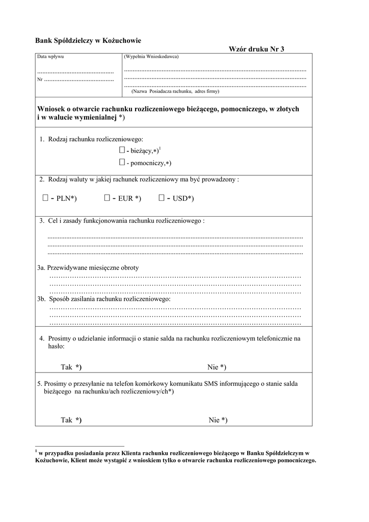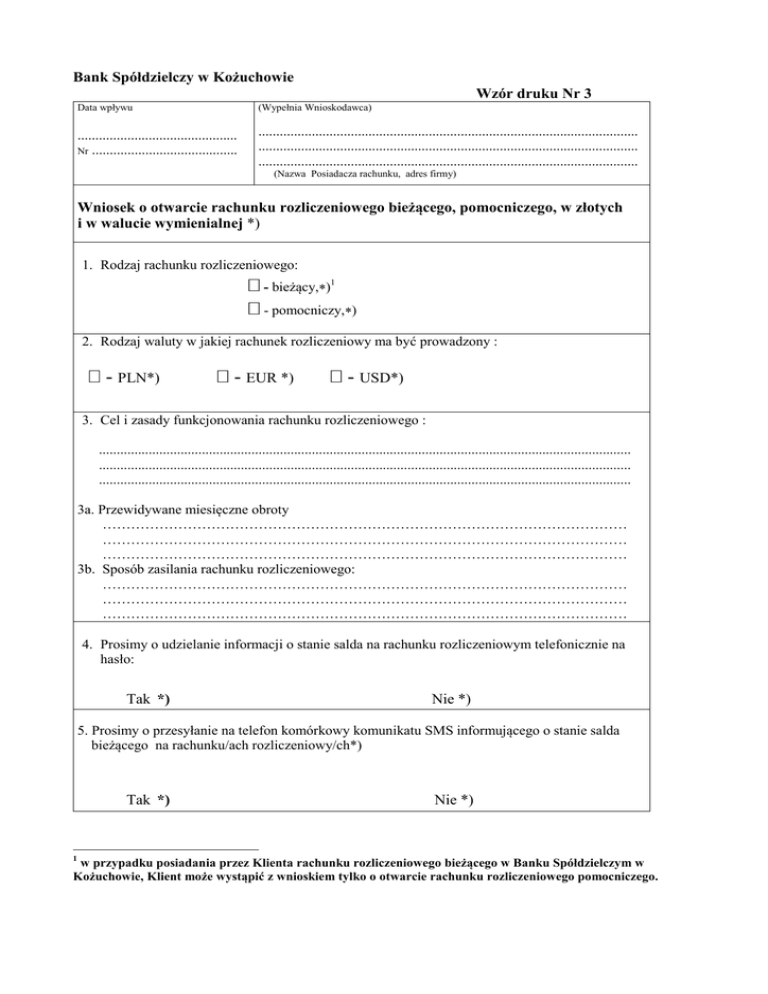 Bank Spółdzielczy w Kożuchowie Wzór druku Nr 3 Data wpływu (Wypełnia Wnioskodawca) ............................................. Nr ......................................... ........................................................................................................... ........................................................................................................... ........................................................................................................... (Nazwa Posiadacza rachunku, adres firmy) Wniosek o otwarcie rachunku rozliczeniowego bieżącego, pomocniczego, w złotych i w walucie wymienialnej *) 1. Rodzaj rachunku rozliczeniowego: - bieżący,∗)1 - pomocniczy,∗) 2. Rodzaj waluty w jakiej rachunek rozliczeniowy ma być prowadzony : - PLN*) - EUR *) - USD*) 3. Cel i zasady funkcjonowania rachunku rozliczeniowego : ...................................................................................................................................................... ...................................................................................................................................................... ...................................................................................................................................................... 3a. Przewidywane miesięczne obroty ………………………………………………………………………………………………… ………………………………………………………………………………………………… ………………………………………………………………………………………………… 3b. Sposób zasilania rachunku rozliczeniowego: ………………………………………………………………………………………………… ………………………………………………………………………………………………… ………………………………………………………………………………………………… 4. Prosimy o udzielanie informacji o stanie salda na rachunku rozliczeniowym telefonicznie na hasło: Tak *) Nie *) 5. Prosimy o przesyłanie na telefon komórkowy komunikatu SMS informującego o stanie salda bieżącego na rachunku/ach rozliczeniowy/ch*) Tak *) 1 Nie *) w przypadku posiadania przez Klienta rachunku rozliczeniowego bieżącego w Banku Spółdzielczym w Kożuchowie, Klient może wystąpić z wnioskiem tylko o otwarcie rachunku rozliczeniowego pomocniczego. 6. Inne warunki: …………………………………………………………………………………………………… …………………………………………………………………………………………………… …………………………………………………………………………………………………… 7. Załączona dokumentacja: ................................................................................................................................................... ................................................................................................................................................... ................................................................................................................................................... Potwierdzamy prawdziwość danych i informacji zawartych w niniejszym Wniosku. ...................................................................... ...................................................................... (pieczęć firmowa i podpis/y Wnioskodawcy/ów) ................................................................. (podpis i stempel memoriałowy pracownika Banku przyjmującego Wniosek) Decyzja Banku Spółdzielczego w sprawie otwarcia /odmowy otwarcia rachunku rozliczeniowego: …………………………………………………………………………………………………………. …………………………………………………………………………………………………………. …………………………………………………………………………………………………………. ………………………………………….. (data, pieczęć Banku i podpisy osób upoważnionych) *) właściwe zaznaczyć