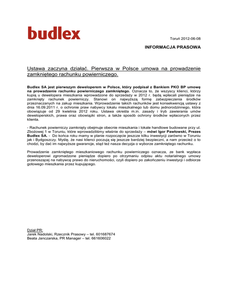 Toruń 2012-06-08 INFORMACJA PRASOWA Ustawa zaczyna działać. Pierwsza w Polsce umowa na prowadzenie zamkniętego rachunku powierniczego. Budlex SA jest pierwszym deweloperem w Polsce, który podpisał z Bankiem PKO BP umowę na prowadzenie rachunku powierniczego zamkniętego. Oznacza to, że wszyscy klienci, którzy kupią u dewelopera mieszkania wprowadzone do sprzedaży w 2012 r. będą wpłacali pieniądze na zamknięty rachunek powierniczy. Stanowi on najwyższą formę zabezpieczenia środków przeznaczanych na zakup mieszkania. Wprowadzenie takich rachunków jest konsekwencją ustawy z dnia 16.09.2011 r. o ochronie praw nabywcy lokalu mieszkalnego lub domu jednorodzinnego, która obowiązuje od 29 kwietnia 2012 roku. Ustawa określa m.in. zasady i tryb zawierania umów deweloperskich, prawa oraz obowiązki stron, a także sposób ochrony środków wpłaconych przez klienta. - Rachunek powierniczy zamknięty obejmuje obecnie mieszkania i lokale handlowe budowane przy ul. Zbożowej 1 w Toruniu, które wprowadziliśmy właśnie do sprzedaży – mówi Igor Pawłowski, Prezes Budlex SA. - Do końca roku mamy w planie rozpoczęcie jeszcze kilku inwestycji zarówno w Toruniu jak i Bydgoszczy. Myślę, że nasi klienci poczują się jeszcze bardziej bezpieczni, a nam przecież o to chodzi, by dać im najwyższe gwarancje, stąd też nasza decyzja o wyborze zamkniętego rachunku. Prowadzenie zamkniętego mieszkaniowego rachunku powierniczego oznacza, ze bank wypłaca deweloperowi zgromadzone pieniądze dopiero po otrzymaniu odpisu aktu notarialnego umowy przenoszącej na nabywcę prawo do nieruchomości, czyli dopiero po zakończeniu inwestycji i odbiorze gotowego mieszkania przez kupującego. Dział PR: Jarek Nadolski, Rzecznik Prasowy – tel. 601687674 Beata Janczarska, PR Manager – tel. 661606022