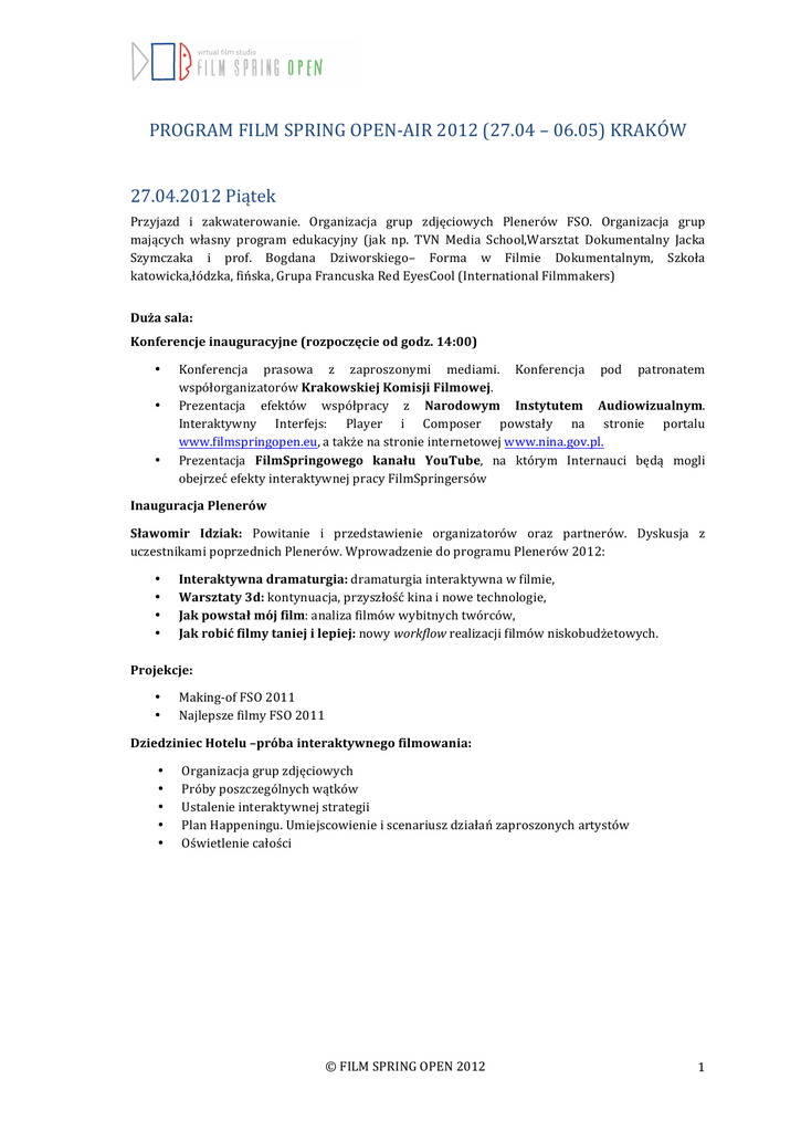 PROGRAM FILM SPRING OPEN-‐AIR 2012 (27.04 – 06.05) KRAKÓW 27.04.2012 Piątek Przyjazd i zakwaterowanie. Organizacja grup zdjęciowych Plenerów FSO. Organizacja grup mających własny program edukacyjny (jak np. TVN Media School,Warsztat Dokumentalny Jacka Szymczaka i prof. Bogdana Dziworskiego– Forma w Filmie Dokumentalnym, Szkoła katowicka,łódzka, fińska, Grupa Francuska Red EyesCool (International Filmmakers) Duża sala: Konferencje inauguracyjne (rozpoczęcie od godz. 14:00) • • • Konferencja prasowa z zaproszonymi mediami. Konferencja pod patronatem współorganizatorów Krakowskiej Komisji Filmowej. Prezentacja efektów współpracy z Narodowym Instytutem Audiowizualnym. Interaktywny Interfejs: Player i Composer powstały na stronie portalu www.filmspringopen.eu, a także na stronie internetowej www.nina.gov.pl. Prezentacja FilmSpringowego kanału YouTube, na którym Internauci będą mogli obejrzeć efekty interaktywnej pracy FilmSpringersów Inauguracja Plenerów Sławomir Idziak: Powitanie i przedstawienie organizatorów oraz partnerów. Dyskusja z uczestnikami poprzednich Plenerów. Wprowadzenie do programu Plenerów 2012: • • • • Interaktywna dramaturgia: dramaturgia interaktywna w filmie, Warsztaty 3d: kontynuacja, przyszłość kina i nowe technologie, Jak powstał mój film: analiza filmów wybitnych twórców, Jak robić filmy taniej i lepiej: nowy workflow realizacji filmów niskobudżetowych. Projekcje: • • Making-‐of FSO 2011 Najlepsze filmy FSO 2011 Dziedziniec Hotelu –próba interaktywnego filmowania: • • • • • Organizacja grup zdjęciowych Próby poszczególnych wątków Ustalenie interaktywnej strategii Plan Happeningu. Umiejscowienie i scenariusz działań zaproszonych artystów Oświetlenie całości © FILM SPRING OPEN 2012 1 28.04.2012 Sobota Organizacja grup zdjęciowych. Konsultacje scenariuszowe interaktywnego filmu. Próby poszczególnych wątków-‐filmów. Próby scen wspólnych dla wielu wątków umieszczonych na Mastertracku. Wykłady duża sala: • • • „Jak zrobiłem swój spektakl: Jak technologia 3D wpływa na rozwój nowoczesnego języka teatralnego – musicalowego.” Wykładowca: Janusz Józefowicz (reżyser i producent „Polity”) Projekcja Making-‐of „Polita” pierwszego na świecie musicalu łączącego żywego aktora z projekcją 3D „Dramaturgia interaktywna w grach komputerowych. Jaka jest przyszłość nowego formatu widowiska filmowego?”. Wykładowcy CD Projekt RED: Paweł Świerszczyński (odpowiedzialny za cut-‐sceny), Sebastian Stępień (Story Lead), Marcin Blacha (Story Writer). Twórcygry „Wiedźmin 2 (The Witcher): Zabójcy królów”. Dziedziniec Hotelu –FilmSpring Night Fever • • • W trakcie koncertu rejestrowanego przez Telewizję TVN nasi uczestnicy kręcą swoje filmy (w szczególności plany ogólne); Muzyka na żywo: zespół muzyczny hipiersoniK Na widowni równocześnie odbywa się happening zaproszonych artystów. (Lista zaproszonych Artystów i ich prezentacji do ustalenia.) 29.04.2012 Niedziela Wstępny montaż nakręconego materiału. W szczególności wysp interaktywnych (scen wspólnych) i wgrywanie klipów do Interaktywnego Playera. Konsultacje (wszyscy wykładowcy są do dyspozycji uczestników Plenerów). Media Desk Polska indywidualne konsultacje: Możliwości finansowania projektów filmowych (development i produkcja) oferowane przez Komisję Europejską Program MEDIA. Wykłady duża sala: • • „Kino 3D nowe wyzwania, nowe szanse. Nowości technologiczne 3D na podstawie niemieckiego filmu „Measuring the world” w 3Dreż. Detlev Buck zrealizowanego w 2011/2012 przez wykładowców i uczestników FSO 2011”. Wykładowcy:Detlev Buck (reżyser), Sławomir Idziak (DOP), Andrzej Waluk (stereografer), Łukasz Baka (stereografer), Daniele Siragusano (stereografer),Andrzej Cichocki (operator), Robert Chaciński (digital image technician), Jan Sadowski (operator). Projekcja wybranych scen z filmów „Measuring the world” oraz „Bitwa Warszawska 1920” Zajęcia praktyczne: Do dyspozycji uczestników Plenerów będzie sprzęt i oprogramowanie Partnerów technologicznych: Panasonic Europe, Sony Europe, Canon Polska, Hewlett-‐Packard, Adobe Systems, RCS Systemy Komputerowe Apple AuthorizedReseller, ScreenPlane GmbH, FGV Schmidle, Zodiak Jerzy Hoffman Film Production, Luks Film © FILM SPRING OPEN 2012 2 • • Prezentacje sprzętowe (nowe kamery, rigi, narzędzia postprodukcyjne i opis workflow). Prowadzący: Andrzej Waluk, Łukasz Baka, Robert Chaciński, Jan Sadowski. Praktyczne przygotowanie rigu 3D do zdjęć. Zajęcia praktyczne z kamerami i rigiem 3D. Prowadzący: Kaspar Kallas, Andrzej Waluk, Łukasz Baka. Projekcje: • Filmy 3D zrealizowane przez naszych uczestników w 2011 roku: a) „Labirynt” – scenariusz i reżyseria: Agnieszka Kowalczyk, b) Pozostałe projekcje filmów uczestników, którzy po Warsztatach 3D w 2011 r. podjęli prób filmowania w nowej technologii c) „FilmSpringersi” – Projekcja filmu dokumentującego Warsztaty 3D2011 reż. Jacek Szymczak (TVN) • Projekcja materiałów zdjęciowych 3D z technicznych prób uczestników; • Projekcje filmów uczestników warsztatów. Dziedziniec Hotelu – FilmSpring Night Fever • • Powtórka (w mniejszej skali) koncertu zespołu muzycznego hipiersoniK. Impreza tylko dla ekip realizacyjnych FSO. Kontynuacja realizacji filmów. Filmowanie tych ujęć, które były niemożliwe do zrealizowania w trakcie normalnego widowiska z publicznością. 30.04.2012 Poniedziałek Projekt Interaktywny -‐ Montaż nakręconego materiału i wgrywanie klipów do Interaktywnego Playera. Konsultacje z zespołem programistów. Wykłady duża sala: • • • „Stereoskopowa percepcja i postrodukcja”. Wykładowca: Daniele Siragusano, Cinepostproduction GmBH Projekcja klipów 3D z filmu „Measuring the world” „Niskobudżetowa produkcja filmów w technologii 3D.Workflow 3D od