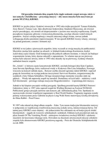 Od początku istnienia ideą zespołu było ciągłe szukanie czegoś nowego, także w nas samych. Chcielibyśmy – przyznają muzycy – aby nasza muzyka była nazywana po prostu MUZYKĄ KROKE. KROKE (w języku jidysz: Kraków) stworzyła w 1992 roku trójka przyjaciół: Tomasz Kukurba, Jerzy Bawoł i Tomasz Lato. Jako absolwenci krakowskiej Akademii Muzycznej, ale również artyści poszukujący, nie stronili od eksperymentów z jazzem oraz muzyką współczesną. Zespół, początkowo kojarzony głównie z twórczością klezmerską, oscyluje obecnie wokół różnych gatunków. Artyści czerpią inspirację z muzyki etnicznej całego świata, zawsze jednak wzbogacają dzieła autorskimi improwizacjami. W ten sposób KROKE tworzy własny, unoszący się ponad granicami, czasem i formami styl. KROKE to też jeden z pierwszych zespołów, który wyszedł ze swoją muzyką do publiczności. Muzyków można było spotkać na ulicach i w klubach krakowskiego Kazimierza, kiedyś żydowskiej części miasta. Grali kompozycje dla jednych całkiem nieznane, w innych zaś budzące wspomnienie świata, który dawno odszedł w zapomnienie. To właśnie tam po raz pierwszy można było usłyszeć utwory, które w 1993 roku ukazały się na pierwszej, wydanej własnym nakładem kasecie zespołu. Do „Ariela”, w którym często koncertowało KROKE, zawitała któregoś dnia Kate Capshaw, żona Stevena Spielberga, który realizował wtedy w Krakowie film Lista Schindlera. Pewnego wieczoru na koncert zabrała męża... Reżyser szybko docenił ogromny talent KROKE i zaprosił grupę do Jerozolimy na występ podczas uroczystości Survivors Reunion, zorganizowanej dla ocalałych z listy Oskara Schindlera. Od tego niesamowitego momentu wszystko stało się głębsze… Wtedy tak naprawdę zespół się narodził. Dostaliśmy od tych ludzi – niektórzy z nich byli klezmerami – pewnego rodzaju muzyczne błogosławieństwo – wspominają dziś muzycy. Jednak to był dopiero początek wielkiej przygody. Spielberg przesłał kasetę KROKE Peterowi Gabrielowi, który w 1997 roku zaprosił zespół do Wielkiej Brytanii na Festiwal WOMAD. Publiczność gorąco przyjęła zarówno sam koncert, jak i debiutancką płytę Trio. Spotkanie to zaowocowało również wspólnymi nagraniami w Real World Studios. Fragmenty nagrania zostały później wykorzystane przez Gabriela na płycie Long Walk Home stanowiącej ścieżkę dźwiękową do filmu Rabbit – Proof Fence. W 1997 roku ukazał się drugi album zespołu – Eden. Tym razem tradycyjne klezmerskie motywy w połączeniu ze współczesną wrażliwością muzyczną zyskały nową, intensywniejszą barwę. Od tamtej pory KROKE coraz chętniej – ale jednocześnie bez odcinania się od tradycyjnych źródeł klezmerskich – sięgało do wzorców sefardyjskich i arabskich. Efektem tych poszukiwań stała się płyta Sounds Of The Vanishing World – nastrojowe świadectwo ewolucji KROKE i zdolności muzyków do kreowania własnego stylu. Dowodem na słuszność artystycznych decyzji członków zespołu było uhonorowanie KROKE prestiżową nagrodą – Preis der Deutsche Schalplattenkritik za rok 2000. Latem 2001 roku, podczas występów w Kornwalii, doszło do pierwszego spotkania KROKE z Nigelem Kennedym. Artysta wykazał natychmiastową gotowość do współpracy, której zwieńczeniem stało się wydanie wspólnej płyty East Meets East w 2003 roku. KROKE otrzymało także nominację do nagrody BBC Radio 3 w kategorii „World music”, a współpraca z Nigelem Kennedym przerodziła się w serię entuzjastycznie przyjmowanych na europejskich festiwalach koncertów. W tamtym czasie ukazała się też kolejna autorska płyta – Ten Pieces To Save The World. Ten melodyjny, klimatyczny album uplasował się na drugim miejscu europejskiej listy World Music Charts i stanowił zwieńczenie 10 lat istnienia KROKE. W 2004 roku zespół wydał kolejną płytę koncertową – Quartet – Live At Home, nagraną w studiu S-5 Radia Kraków z udziałem krakowskiego perkusisty jazzowego Tomasza Grochota, który jeszcze przez kilka kolejnych lat występował z zespołem. Rok później grupa rozpoczęła współpracę z Edytą Geppert i Krzysztofem Herdzinem nad nowym projektem, zamykającym się w albumie Śpiewam życie. Krążek osiągnął ostatecznie status Złotej Płyty, a zespół koncertował równolegle w Polsce i w Niemczech z orkiestrą Sinfonia Baltica i programem KROKE – symfonicznie w aranżacjach i pod dyrekcją Bohdana Jarmołowicza. W 2006 roku utwór The Secrets of The Life Tree w wykonaniu KROKE znalazł się na ścieżce dźwiękowej filmu Davida Lyncha Inland Empire, a rok później, w 15. rocznicę powstania zespołu, KROKE wydało swój kolejny studyjny album Seventh Trip – energetyczną podróż po orientalnych szlakach muzycznych. Cały kolejny rok działalności to szereg koncertów w Polsce i za granicą oraz praca nad projektem kameralnym w aranżacji Krzysztofa Herdzina. Premiera tego przedsięwzięcia – z udziałem orkiestry Sinfónica de Burgos – odbyła się w Hiszpanii. Kolejne odsłony projektu zabrzmiały w Krakowie i Sankt Petersburgu z towarzyszeniem orkiestry Sinfonietta Cracovia pod dyrekcją Roberta Kabary, która nadała projektowi niepowtarzalne brzmienie z pogranicza muzyki klasycznej i współczesnej. Rok 2009 był dla KROKE kolejnym przełomem i zwrotem na drodze artystycznej – zespół coraz częściej występował jako trio, bez perkusji, dzięki czemu koncerty nabrały bardziej kameralnego charakteru, a w muzyce pojawiły się dawno niesłyszane brzmienia aszkenazyjskie i bałkańskie. Janusz Makuch, dyrektor Festiwalu Kultury Żydowskiej w Krakowie, nazwał to „powrotem do korzeni”, a zespół udokumentował swoje poszukiwania albumem Out of Sight, w którym pełne energii i czerpiące z tradycji klezmerskiej utwory współistnieją z kompozycjami z pogranicza jazzu i nastrojowymi wokalizami Tomasza Kuk