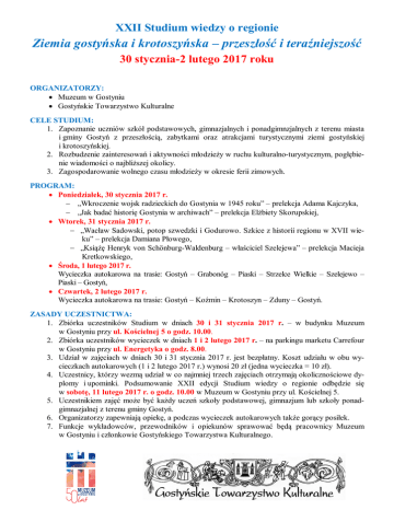 XXII Studium wiedzy o regionie Ziemia gostyńska i krotoszyńska – przeszłość i teraźniejszość 30 stycznia-2 lutego 2017 roku ORGANIZATORZY: Muzeum w Gostyniu Gostyńskie Towarzystwo Kulturalne CELE STUDIUM: 1. Zapoznanie uczniów szkół podstawowych, gimnazjalnych i ponadgimnzjalnych z terenu miasta i gminy Gostyń z przeszłością, zabytkami oraz atrakcjami turystycznymi ziemi gostyńskiej i krotoszyńskiej. 2. Rozbudzenie zainteresowań i aktywności młodzieży w ruchu kulturalno-turystycznym, pogłębienie wiadomości o najbliższej okolicy. 3. Zagospodarowanie wolnego czasu młodzieży w okresie ferii zimowych. PROGRAM: Poniedziałek, 30 stycznia 2017 r. „Wkroczenie wojsk radzieckich do Gostynia w 1945 roku” – prelekcja Adama Kajczyka, „Jak badać historię Gostynia w archiwach” – prelekcja Elżbiety Skorupskiej, Wtorek, 31 stycznia 2017 r. „Wacław Sadowski, potop szwedzki i Godurowo. Szkice z historii regionu w XVII wieku” – prelekcja Damiana Płowego, „Książę Henryk von Schönburg-Waldenburg – właściciel Szelejewa” – prelekcja Macieja Kretkowskiego, Środa, 1 lutego 2017 r. Wycieczka autokarowa na trasie: Gostyń – Grabonóg – Piaski – Strzelce Wielkie – Szelejewo – Piaski – Gostyń, Czwartek, 2 lutego 2017 r. Wycieczka autokarowa na trasie: Gostyń – Koźmin – Krotoszyn – Zduny – Gostyń. ZASADY UCZESTNICTWA: 1. Zbiórka uczestników Studium w dniach 30 i 31 stycznia 2017 r. – w budynku Muzeum w Gostyniu przy ul. Kościelnej 5 o godz. 10.00. 2. Zbiórka uczestników wycieczek w dniach 1 i 2 lutego 2017 r. – na parkingu marketu Carrefour w Gostyniu przy ul. Energetyka o godz. 8.00. 3. Udział w zajęciach w dniach 30 i 31 stycznia 2017 r. jest bezpłatny. Koszt udziału w obu wycieczkach autokarowych (1 i 2 lutego 2017 r.) wynosi 20 zł (jedna wycieczka = 10 zł). 4. Uczestnicy, którzy wezmą udział w co najmniej trzech zajęciach otrzymają okolicznościowe dyplomy i upominki. Podsumowanie XXII edycji Studium wiedzy o regionie odbędzie się w sobotę, 11 lutego 2017 r. o godz. 10.00 w Muzeum w Gostyniu przy ul. Kościelnej 5. 5. Uczestnikiem zajęć może być każdy uczeń szkoły podstawowej, gimnazjum lub szkoły ponadgimnazjalnej z terenu gminy Gostyń. 6. Organizatorzy zapewniają opiekę, a podczas wycieczek autokarowych także gorący posiłek. 7. Funkcje wykładowców, przewodników i opiekunów sprawować będą pracownicy Muzeum w Gostyniu i członkowie Gostyńskiego Towarzystwa Kulturalnego.