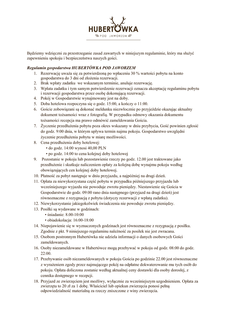 Będziemy wdzięczni za przestrzeganie zasad zawartych w niniejszym regulaminie, który ma służyć zapewnieniu spokoju i bezpieczeństwa naszych gości. Regulamin gospodarstwa HUBERTÓWKA POD JAWORZEM 1. Rezerwację uważa się za potwierdzoną po wpłaceniu 30 % wartości pobytu na konto gospodarstwa do 3 dni od złożenia rezerwacji. 2. Brak wpłaty zadatku we wskazanym terminie, anuluje rezerwację. 3. Wpłata zadatku i tym samym potwierdzenie rezerwacji oznacza akceptację regulaminu pobytu i rezerwacji gospodarstwa przez osobę dokonującą rezerwacji. 4. Pokój w Gospodarstwie wynajmowany jest na doby. 5. Doba hotelowa rozpoczyna się o godz. 15:00, a kończy o 11:00. 6. Goście zobowiązani są dokonać meldunku niezwłocznie po przyjeździe okazując aktualny dokument tożsamości wraz z fotografią. W przypadku odmowy okazania dokumentu tożsamości recepcja ma prawo odmówić zameldowania Gościa. 7. Życzenie przedłużenia pobytu poza okres wskazany w dniu przybycia, Gość powinien zgłosić do godz. 9:00 dnia, w którym upływa termin najmu pokoju. Gospodarstwo uwzględni życzenie przedłużenia pobytu w miarę możliwości. 8. Cena przedłużenia doby hotelowej: • do godz. 14:00 wynosi 40,00 PLN • po godz. 14:00 to cena kolejnej doby hotelowej 9. Pozostanie w pokoju lub pozostawienie rzeczy po godz. 12.00 jest traktowane jako przedłużenie i skutkuje naliczeniem opłaty za kolejną dobę wynajmu pokoju według obowiązujących cen kolejnej doby hotelowej. 10. Płatność za pobyt następuje w dniu przyjazdu, a najpóźniej na drugi dzień. 11. Opłata za niewykorzystana część pobytu w przypadku późniejszego przyjazdu lub wcześniejszego wyjazdu nie powoduje zwrotu pieniędzy. Niestawienie się Gościa w Gospodarstwie do godz. 09:00 rano dnia następnego (przyjazd na drugi dzień) jest równoznaczne z rezygnacją z pobytu (dotyczy rezerwacji z wpłatą zadatku). 12. Niewykorzystanie jakiegokolwiek świadczenia nie powoduje zwrotu pieniędzy. 13. Posiłki są wydawane w godzinach: • śniadanie: 8.00-10:00 • obiadokolacja: 16:00-18:00 14. Niepojawienie się w wyznaczonych godzinach jest równoznaczne z rezygnacją z posiłku. Zgodnie z pkt. 9 niniejszego regulaminu należność za posiłek nie jest zwracana. 15. Osobom postronnym Hubertówka nie udziela informacji o danych osobowych Gości zameldowanych. 16. Osoby niezameldowane w Hubertówce mogą przebywać w pokoju od godz. 08:00 do godz. 22:00. 17. Przebywanie osób niezameldowanych w pokoju Gościa po godzinie 22.00 jest równoznaczne z wyrażeniem zgody przez najmującego pokój na odpłatne dokwaterowanie mu tych osób do pokoju. Opłata doliczona zostanie według aktualnej ceny dostawki dla osoby dorosłej, z cennika dostępnego w recepcji. 18. Przyjazd ze zwierzęciem jest możliwy, wyłącznie za wcześniejszym uzgodnieniem. Opłata za zwierzęta to 20 zł za 1 dobę. Właściciel lub opiekun zwierzęcia ponosi pełną odpowiedzialność materialną za rzeczy zniszczone z winy zwierzęcia. 19. W Gospodarstwie obowiązuje cisza nocna od godz. 22:00 do godz. 06:00 rano (za wyjątkiem imprez okolicznościowych ustalonych wcześniej z gospodarzem). Zachowanie Gości i osób korzystających z usług Gospodarstwa nie powinno zakłócać pobytu innych Gości. Naruszenie tej zasady spowoduje zaprzestania świadczenia dalszych usług. 20. Grille na terenie Hubertówki są do dyspozycji gości noclegowych, pobierana jest jedynie oplata za drewno i sprzątanie. Korzystanie z grilla w godzinach ciszy nocnej (po godzinie 22) należy wcześniej ustalić z gospodarzem. 21. Dzieci poniżej 13 lat muszą znajdować się pod stałą opieką i nadzorem osób dorosłych. Z zachowania dzieci oraz za szkody wynikłe z niewłaściwego zachowania odpowiadają opiekunowie prawni dzieci lub opiekunowie grup. 22. Na terenie Hubertówki w tym - w pokojach oraz na balkonach obowiązuje całkowity zakaz palenia papierosów i wyrobów tytoniowych - z wyłączeniem miejsc do tego wyznaczonych (ustawa z dnia 8 kwietnia 2010 roku o zmianie ustawy o ochronie zdrowia przed następstwami używania tytoniu i wyrobów tytoniowych oraz ustawy o Państwowej Inspekcji Sanitarnej (Dz. U. Nr 81, poz. 529). 23. Złamanie zakazu w/w zakazu palenia papierosów i wyrobów tytoniowych jest równoznaczne z wyrażeniem zgody przez najmującego pokój Gościa, na pokrycie kosztów pralniczych oraz przyjęcie kary pieniężnej w wysokości 500 zł. W przypadku wywołania przez gościa fałszywego alarmu i przyjazdu straży pożarnej gość ponosi pełna odpowiedzialność prawną oraz finansową. 24. Gość ponosi pełną odpowiedzialność materialną i prawną a wszelkiego rodzaju uszkodzenia lub zniszczenia przedmiotów wyposażenia i urządzeń w obiekcie powstałe z jego winy lub odwiedzających go osób. 25. O zaistniałej szkodzie Gość powinien poinformować niezwłocznie Recepcję. 26. Hubertówka nie ponosi odpowiedzialności z tytułu utraty lub uszkodzenia mienia Gości. Zabezpieczenie przed kradzieżą leży po stronie Gości. 27. Po zakończonym pobycie każdy pokój podlega sprawdzeniu przez pracownika recepcji w obecności Gościa gospodarstwa celem wykluczenia ewentualnych szkód. 28. Ze względów bezpieczeństwa zabronione jest używanie w pokojach grzałek, żelazek i innych urządzeń elektrycznych, nie stanowiących wyposażenia tych pomieszczeń. Wyjątek stanowią: ładowarki lub zasilacze urządzeń RTV oraz komputerowych. 29. Przy wychodzeniu z pokoju, prosimy, sprawdzić czy zakręcone są krany, wygaszone światło, zamknięte okna (prosimy pozostawić uchylone lub zamknięte, nigdy otwarte na oścież) oraz czy nie zaprószono ognia. 30. W momencie przekazania przez Recepcję klucza do pokoju Gość hotelowy staje się jego gospodarzem. Sprzątanie odbywa się co trzecią dobę lub na życzenie Gościa – prośbę należy zgłosić w Recepcji. 31. Opłata za zagubienie klucza - 50 zł. 32. Prosimy naszych gości hotelowy
