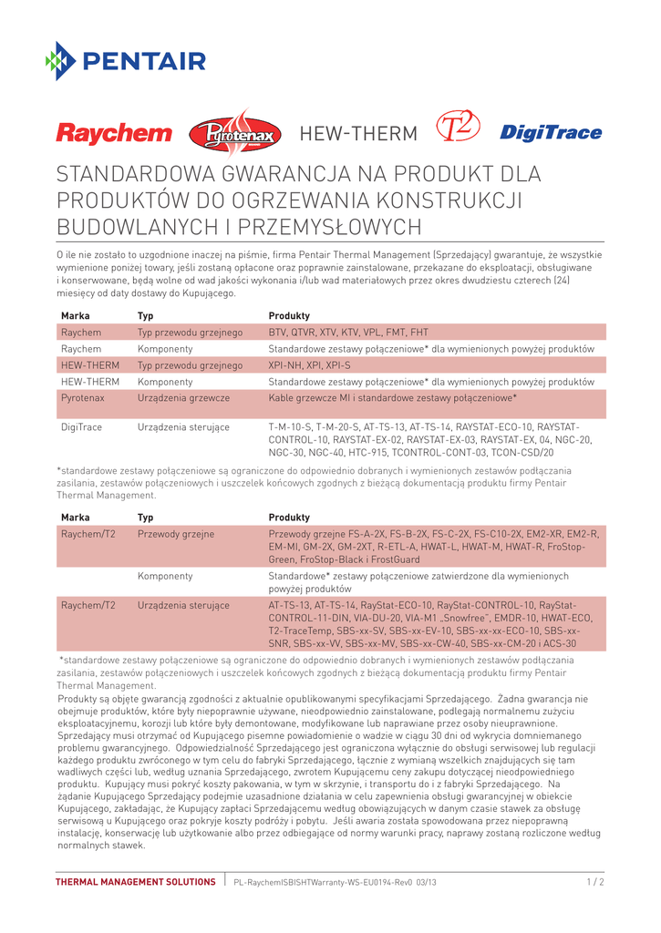 HEW-THERM Standardowa gwarancja na produkt Dla produktów do ogrzewania konstrukcji budowlanych i przemysłowych O ile nie zostało to uzgodnione inaczej na piśmie, firma Pentair Thermal Management (Sprzedający) gwarantuje, że wszystkie wymienione poniżej towary, jeśli zostaną opłacone oraz poprawnie zainstalowane, przekazane do eksploatacji, obsługiwane i konserwowane, będą wolne od wad jakości wykonania i/lub wad materiałowych przez okres dwudziestu czterech (24) miesięcy od daty dostawy do Kupującego. Marka Typ Produkty Raychem Typ przewodu grzejnego BTV, QTVR, XTV, KTV, VPL, FMT, FHT Raychem Komponenty Standardowe zestawy połączeniowe* dla wymienionych powyżej produktów HEW-THERM Typ przewodu grzejnego XPI-NH, XPI, XPI-S HEW-THERM Komponenty Standardowe zestawy połączeniowe* dla wymienionych powyżej produktów Pyrotenax Urządzenia grzewcze Kable grzewcze MI i standardowe zestawy połączeniowe* DigiTrace Urządzenia sterujące T-M-10-S, T-M-20-S, AT-TS-13, AT-TS-14, RAYSTAT-ECO-10, RAYSTATCONTROL-10, RAYSTAT-EX-02, RAYSTAT-EX-03, RAYSTAT-EX, 04, NGC-20, NGC-30, NGC-40, HTC-915, TCONTROL-CONT-03, TCON-CSD/20 *standardowe zestawy połączeniowe są ograniczone do odpowiednio dobranych i wymienionych zestawów podłączania zasilania, zestawów połączeniowych i uszczelek końcowych zgodnych z bieżącą dokumentacją produktu firmy Pentair Thermal Management. Marka Typ Produkty Raychem/T2 Przewody grzejne Przewody grzejne FS-A-2X, FS-B-2X, FS-C-2X, FS-C10-2X, EM2-XR, EM2-R, EM-MI, GM-2X, GM-2XT, R-ETL-A, HWAT-L, HWAT-M, HWAT-R, FroStopGreen, FroStop-Black i FrostGuard Komponenty Standardowe* zestawy połączeniowe zatwierdzone dla wymienionych powyżej produktów Urządzenia sterujące AT-TS-13, AT-TS-14, RayStat-ECO-10, RayStat-CONTROL-10, RayStatCONTROL-11-DIN, VIA-DU-20, VIA-M1 „Snowfree”, EMDR-10, HWAT-ECO, T2-TraceTemp, SBS-xx-SV, SBS-xx-EV-10, SBS-xx-xx-ECO-10, SBS-xxSNR, SBS-xx-VV, SBS-xx-MV, SBS-xx-CW-40, SBS-xx-CM-20 i ACS-30 Raychem/T2 *standardowe zestawy połączeniowe są ograniczone do odpowiednio dobranych i wymienionych zestawów podłączania zasilania, zestawów połączeniowych i uszczelek końcowych zgodnych z bieżącą dokumentacją produktu firmy Pentair Thermal Management. Produkty są objęte gwarancją zgodności z aktualnie opublikowanymi specyfikacjami Sprzedającego. Żadna gwarancja nie obejmuje produktów, które były niepoprawnie używane, nieodpowiednio zainstalowane, podlegają normalnemu zużyciu eksploatacyjnemu, korozji lub które były demontowane, modyfikowane lub naprawiane przez osoby nieuprawnione. Sprzedający musi otrzymać od Kupującego pisemne powiadomienie o wadzie w ciągu 30 dni od wykrycia domniemanego problemu gwarancyjnego. Odpowiedzialność Sprzedającego jest ograniczona wyłącznie do obsługi serwisowej lub regulacji każdego produktu zwróconego w tym celu do fabryki Sprzedającego, łącznie z wymianą wszelkich znajdujących się tam wadliwych części lub, według uznania Sprzedającego, zwrotem Kupującemu ceny zakupu dotyczącej nieodpowiedniego produktu. Kupujący musi pokryć koszty pakowania, w tym w skrzynie, i transportu do i z fabryki Sprzedającego. Na żądanie Kupującego Sprzedający podejmie uzasadnione działania w celu zapewnienia obsługi gwarancyjnej w obiekcie Kupującego, zakładając, że Kupujący zapłaci Sprzedającemu według obowiązujących w danym czasie stawek za obsługę serwisową u Kupującego oraz pokryje koszty podróży i pobytu. Jeśli awaria została spowodowana przez niepoprawną instalację, konserwację lub użytkowanie albo przez odbiegające od normy warunki pracy, naprawy zostaną rozliczone według normalnych stawek. THERMAL MANAGEMENT SOLUTIONS PL-RaychemISBISHTWarranty-WS-EU0194-Rev0 03/13 1/2 W przypadku powstania dowolnej awarii należy podjąć następujące kroki: A. Należy podać Sprzedającemu numer modelu produktu, numer seryjny i szczegóły problemu. Po otrzymaniu tych informacji Kupujący otrzyma dane serwisowe lub instrukcje wysyłki. B. Po otrzymaniu instrukcji wysyłki od Sprzedającego Kupujący powinien wysłać produkt opłacony z góry. Jeśli produkt lub awaria nie są objęte gwarancją, przed rozpoczęciem prac zostanie przekazane oszacowanie kosztów. SPRZEDAJĄCY ZRZEKA SIĘ ODPOWIEDZIALNOŚCI ZA WSZYSTKIE INNE GWARANCJE, M.IN. JAWNE, DOROZUMIANE LUB USTAWOWE, TAKIE JAK GWARANCJE PRZYDATNOŚCI DO SPRZEDAŻY I UŻYTECZNOŚCI DO OKREŚLONEGO CELU. SPRZEDAJĄCY ZRZEKA SIĘ RÓWNIEŻ ODPOWIEDZIALNOŚCI ZA WSZYSTKIE GWARANCJE DOTYCZĄCE WSZELKICH ŚWIADCZONYCH USŁUG DODATKOWYCH. • Czego nie obejmuje ta gwarancja na produkt? Towary podlegające niepoprawnemu użytkowaniu, zaniedbaniom, zmianom lub niepoprawnie zainstalowane, obsługiwane, konserwowane, naprawiane lub testowane (lub wszelkim innym takim czynnościom lub zaniechaniom), których nie można przypisać Sprzedającemu, nie są objęte gwarancją. W żadnym wypadku Sprzedający nie będzie ponosił odpowiedzialności za koszty demontażu lub instalacji, za straty lub uszkodzenia lub ograniczenia używania obiektów lub innej własności, za straty zysków, za brak możliwości korzystania z zysku, za utratę przewidywanych przychodów lub za jakiekolwiek inne szkody lub koszty, czy to bezpośrednie, pośrednie, przypadkowe lub wtórne, zaś w żadnym wypadku odpowiedzialność Sprzedającego nie może przekraczać kwoty równej cenie sprzedaży. • Co robimy, aby usunąć problemy? Sprzedający sprawdzi i potwierdzi, że wszelkie domniemane problemy z produktem objęte niniejszą gwarancją rzeczywiście istnieją i wystąpiły w trakcie poprawnego i normalnego użytkowania oraz że nie zostały spowodowane przez wypadek, niepoprawne użycie, normalne zużycie eksploatacyjne, zaniedbanie, zmianę lub przez niepoprawną instalację, obsługę, konserwację, naprawę lub testowanie lub jakąkolwiek inną przyczynę wykraczającą poza zakres odpowiedzialności Sprzedająceg
