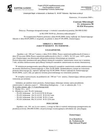 Projekt UPGOW współfinansowany przez Unię Europejską w ramach Europejskiego Funduszu Społecznego Uniwersytet Śląski w Katowicach, ul. Bankowa 12, 40-007 Katowice, http://www.us.edu.pl Katowice, 14 września 2009 r. Centrum Mikroskopii Ul. Arkuszowa 58 01-934 Warszawa Dotyczy: Przetargu nieograniczonego o wartości szacunkowej poniżej 206 000 EURO nr RU/DW/50/09 na „Dostawę mikroskopów”. Po rozpatrzeniu Państwa protestu z dnia 04.09.2009r, który wpłynął do Zamawiającego faksem w dniu 04.09.2009r.w oryginale, na piśmie w dniu 07.09.2009r. Zamawiający: ODRZUCA PROTEST JAKO WNIESIONY PO TERMINIE . UZASADNIENIE. Zgodnie z art. 180 ust.7 ustawy z dnia 29.01.2004r. Prawo zamówień publicznych (Ustawa z dnia 29 stycznia 2004r Prawo zamówień publicznych (t.j.Dz.U. z 2007r. Nr 223, poz. 1655 z późn. zm.) Zamawiający ma obowiązek odrzucenia protestu wniesionego po terminie. Protest dotyczący postanowień specyfikacji istotnych warunków zamówienia wnosi się w terminie 7 dni, od dnia zamieszczenia specyfikacji istotnych warunków zamówienia na stronie internetowej. W niniejszym postępowaniu specyfikacja istotnych warunków zamówienia została zamieszczona na stronie internetowej Zamawiającego w dniu 26.08.2009r. Siedmiodniowy termin na wniesienie protestu dotyczącego jej zapisów upłynął więc 02.09.2009r. Protest wpłynął do Zamawiającego 04.09.2009r, czyli 2 dni, po upływie terminu przewidzianego na wniesienie protestu. W związku z powyższym, na podstawie art. 180 ust 7 ww ustawy, Zamawiający odrzuca protest wniesiony po terminie. Jednakże, po analizie treści protestu, Zamawiający dokonuje zmiany opisu przedmiotu zamówienia w zakresie części C – Mikroskop biologiczny – 1 szt. w zakresie pkt. 3 i 6. W wyniku zmiany, pkt. 3 i 6 przybierają treść: 3. Okular 10 x, szt.2 6. Obiektywy serii PLAN Achromat - PLAN Achromat 4x N.A.0.10 W.D.30 mm - PLAN Achromat 10x N.A.0.25 W.D.10,5 mm - PLAN Achromat 20x N.A.0.40 W.D.1,2 mm - PLAN Achromat 40x N.A.0.65 W.D. 0,56 mm POUCZENIE Zgodnie z art. 184 ust.1a ww ustawy, z uwagi na fakt iż wartość niniejszego postępowania nie przekracza kwoty 206.000 EURO, od powyższego rozstrzygnięcia odwołanie nie przysługuje. Zamawiający Z-ca Kanclerza ds. Technicznych Mgr Edward Wąsiel Strona 1 z 1