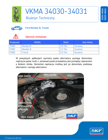 Biuletyn Techniczny Ford Mondeo III, Transit Zalecenia montażowe Producent MODEL Silnik Kod silnika FORD FORD Mondeo III Mondeo III 2.0 Tdci 2.2 Tdci Duratorq Duratorq FORD Transit 2.0 Tdci Duratorq W powyższych aplikacjach wymiana paska alternatora wymaga demontażu napinacza paska multi-v, ponieważ pasek prowadzony jest pomiędzy napinaczem a blokiem silnika. Demontaż napinacza możliwy jest po demontażu podstawy alternatora i samego alternatora. VKM 34031 VKMV 6PK1642 VKM 34032 1 I www.vsm.skf.com VKM 34030 VKMA MA 34030 VKMA 34031 VKMA 34030-34031 Biuletyn Techniczny Zalecenia montażowe 1) Używając odpowiedniego narzędzia (Ford T303676) zmniejsz napięcie paska, tak aby swobodnie odkręcić dolną śrubę mocującą ramię napinacza VKM 34032. Ford T303676 2) Rozłącz akumulator I wymontuj alternator (należy odkręcić 2 śruby mocujące alternator). 3) Zdemontuj podstawę alternatora wraz z napinaczem VKM 34032. 2I www.vsm.skf.com VKMA 34030 VKMA 34031 VKMA 34030-34031 Biuletyn Techniczny 4) Wymień rolkę VKM 34030 5) Na stanowisku warsztatowym wymień napinacz VKM 34032 (montowany do postawy alterntora) oraz rolkę VKM 34031.. 6) PRZED montażem napinacza należy właściwie ułożyć pasek. Do napięcia paska użyj właściwego narzędzia (Ford T303676) oraz sprawdź poprawne ułożenie paska na wszystkich kołach pasowych. 7) Zamontuj uprzednio zedemontowane elementy Właściwa długość paska jest podstawą poprawnie wykonanej naprawy całego układu osprzętu ! Niewłaściwa długość paska (zbyt długi lub zbyt krótki) może spowodować uszkodzenia każdego z elementów układu osprzętu silnika. W celu właściwej wymiany oraz uniknięcia ewentualnych problemów wykonuj w oparciu o kompletny zestaw osprzętu VKMA ! ® SK F jest zast rzeżonym znak iem handlowym Grupy SK F. © Grupa SK F 2010 T reść niniejszej publik acji jest chroniona prawem aut orskim i nie może być przedruk owywana w części lub w ca łości, o ile nie uzysk a się wcześniej zezwolenia w f ormie pisemnej. Dołożono wszelk ich st arań, aby inf ormacje zawart e w t ej publik acji były możliwie dok ładne, nie mniej wydawca nie ponosi żadnej odpowiedzialności za ewent ualne st rat y – bezpośrednie lub pośrednie – wynikające z ich użycia. 3 I www.vsm.skf.com naprawę VKMA 34030 VKMA 34031 VKMA 34030-34031