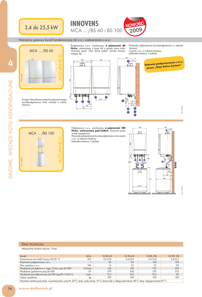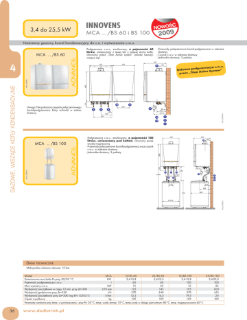 3,4 do 25,5 kW INNOVENS MCA ... /BS 60 i BS 100 ŚĆ NOWO 2009 Naścienny gazowy kocioł kondensacyjny do c.o. i wytwarzania c.w.u. 450 450 = 140 9 .u. rzewacza c.w Ochrona podg em” st Sy e tiv Ac przez „Titan 11 10 260 2 4 6 8 25 192 67 257,5 199 331 10 2 11 4 MCA_F0004A 130 MCA_Q0006 Uwaga: Nie pokazano zespołu połączeniowego kocioł-podgrzewacz, który wchodzi w zakres dostawy 6 450 450 140 9 690 - Podgrzewacz c.w.u., emaliowany, o pojemności 100 litrów, umieszczany pod kotłem, chroniony przez anodę magnezową - Przewody połączeniowe kocioł-podgrzewacz oraz czujnik c.w.u. w zakresie dostawy - Jednostka dostawy: 3 pakiety 130 ADVANCE MCA ... /BS 100 MCA_Q0003A 257,5 150 25 446 2 2000 4 6 132 10 8 132 67 2 48 11 4 6 110 153 305 912 590 Ø 570 DANE TECHNICZNE Maksymalne ciśnienie robocze: 10 bar Model MCA 15/BS 60 25/BS 60 15/BS 100 25/BS 100 Znamionowa moc kotła Pn przy 50/30 °C kW 3,4-15,8 5,4-25,5 3,4-15,8 5,4-25,5 Pojemność podgrzewacza c.w.u. l 60 60 100 100 Moc wymiany c.w.u. kW 15 22 15 25 Wydajność początkowa w ciągu 10 min. przy Δt=30K l/10 min 125 145 195 200 Wydajność godzinowa przy Δt=35K l/h 370 540 370 615 Wydajność początkowa przy Δt=30K (wg EN 13203-1) l/min 12,5 14,5 19,5 20 Ciężar wysyłkowy kg 109 109 109 109 Parametry sanitarne przy temp. w pomieszczeniu przy Pn: 20°C, temp. wody zimnej: 10°C, temp.wody w obiegu pierwotnym: 80°C, temp. magazynowania 60°C 36 www.dedietrich.pl MCA_F0002A GAZOWE, WISZĄCE KOTŁY KONDENSACYJNE 4 450 = 690 ADVANCE MCA ... /BS 60 - Przewody połączeniowe kocioł-podgrzewacz w zakresie dostawy - Czujnik c.w.u. w zakresie dostawy - Jednostka dostawy: 3 pakiety -Podgrzewacz c.w.u., emaliowany, o pojemności 60 litrów, umieszczany z lewej lub z prawej strony kotła, chroniony przez „Titan Active system” (anoda niezużywająca się) WYPOSAŻENIE DODATKOWE I PRZYKŁAD KONFIGURACJI DLA KOTŁÓW MCA WYPOSAŻENIE DODATKOWE OPRÓCZ „REGULACJI” WYTWARZANIE C.W.U. PAKIET - w podgrzewaczu 130 l umieszczonym pod kotłem MCA - natychmiastowe w modelu MCA... MI - w podgrzewaczu stojącym BP... - Czujnik temp. c.w.u. (dł. 5 m) HR 44 HR 45 HC 33 HC 34 HC 35 HC 28 AD 212 HR 39 HC 33 8531Q028A HC 34 MCA_F0015 EA 65 HR 42 MCA_F0015 MCA_F0015 HR 43 EA 67 EA 59 EA 74 BH 84 DY 868 HR 38 DY 887 MCA_F0015 HG 45 MCA_F0015 HG 44 HR 38 MCA_Q0004 DY 868 WYPOSAŻENIE DODATKOWE „REGULACJE” DOBÓR WYPOSAŻENIA DODATKOWEGO W ZALEZNOŚCI OD TYPU KONSOLI STEROWNICZEJ I PODŁĄCZONYCH OBIEGÓW Rodzaj obiegu M c.w.u MCA 15, 25 1 x AD 212 MCA../BS.. MCA 25/28 MI fabr. WYPOSAŻENIE DODATKOWE bezpośredni mieszaczowy M M bezp. + 1miesz. M M guracji konfi zykład 2x miesz. bezp. +2x miesz. 1 x AD 199 + 1 x AD 249 1 x AD 199 + 1 x AD 249 fabr. 1 x AD 199 1 x AD 199 1 x AD 199 + 1 x AD 249 fabr. 1 x AD 199 1 x AD 199 1 x AD 199 + 1 x AD 249 PAKIET Pr MCA... - 1 obieg bezpośredni (bez zaworu mieszającego) - 1 obieg ogrzewania podłogowego (z zaworem mieszającym) OPIS Kocioł MCA 15 VH/ BS 130 Czujnik dla zaworu mieszającego Wyposażenie dodatkowe uzupełniające: - Czujnik zewnetrzny bezprzewopdowy - Zdalne sterowanie dialogowe CDR D. iSystem - Moduł kotła radiowy (nadajnik) - Rozdzielacz hydrauliczny HW Plus 70 - Moduł hydrauliczny dla 1 obiegu bezpośredniego (z pompą sterowaną elektronicznie) - Moduł hydrauliczny dla 1 obiegu mieszaczowego (z pompą sterowaną elektronicznie) - Kolektor izolowany dla 2 modułów - Zespół wspornika naściennego dla modułów hydr. - Zestaw podłączeniowy G w R (1” i 3/4”) www.dedietrich.pl M PAKIET AD 249 AD 199 AD 134 AD 212 AD 250 AD 152 1 AD 251 0 2 2 4 3 6 8 4 10 13:42 12 5 14 6 16 18 AD253 CDR D. iSystem 7 20 22 AUTO MODE AD199 PAKIET AD 199 °C °C °C EA65 EA67 °C AD 251 BUS AD252 BH84 EA59 AD 253 AD 252 HC 28 BH84 HC28 EA 65 EA 67 EA 59 EA 74 BH 84 MCA_F0003A Konsola sterownicza DIEMATIC iSystem (1)(2) Płytka + czujnik dla zaworu mieszającego Zdalne sterowanie CDI D. iSystem AD 254 Czujnik dla zaworu mieszającego Moduł zd. ster. bezprzewodowego CDR D. iSystem Kabel połączeniowy BUS DIEMATIC (12m) (bez nadajnika radiowego) AD 253 Czujnik c.w.u. Czujnik zewnętrzny bezprzewodowy AD 251 Czujnik zasobnika buforowego Moduł radiowy kotła (nadajnik) AD 252 Moduł zdalnego nadzoru telefonicznego Zdalne sterow. uproszczone + czujnik pokojowy FM 52 (1) Każdy obieg c.o. może być uzupełniony do wyboru o zdalne sterowanie AD 254, AD 252/253 lub FM 52 (2) Możliwa kaskada 10 kotłów 38 502767 8531Q027 PAKIET HR 39 HR 40 HR 42 HR 43 MCA_F0015 GAZOWE, WISZĄCE KOTŁY KONDENSACYJNE 4 AKCESORIA Tylna rama montażowa Zestaw połączeniowy dla tylnej ramy montaż. Komora zespołu podłączeniowego Termostat spalin Narzędzie do czyszczenia wymiennika płytowego (MCA 25/28MI) Narzędzie do czyszczenia korpusu kotła Stacja neutralizacji kondensatu Wspornik naścienny dla stacji neutralizacji Wkład 2 kg dla neutralizacji Rozdzielacz hydrauliczny HW Plus 70 Moduł hydrauliczny dla 1 obiegu bezpośredniego (z pompą sterowaną elektronicznie) Moduł hydrauliczny dla 1 obiegu mieszaczowego (z pompą sterowaną elektronicznie) Kolektor izolowany dla 2 modułów Zespół wspornika naśc. dla modułów hydr. Zestaw podłączeniowy G w R (1” i 3/4”) Adapter biflux 2 x 80 mm Adapter Ø 80/125mm Zestaw podłącz. kotła na przewodzie 3 CEP KONSOLE STEROWNICZE DIEMATIC SYSTEM® Wyposażenie dodatkowe konsoli sterowniczej DIEMATIC iSystem CALENTA_Q0005 AD 253/254 AD 212 Płytka + czujnik dla 1 obiegu mieszaczowego Do sterowania elektromechanicznego lub elektrotermicznego siłownika zaworu mieszającego. Płytka jest zamontowana w konsoli DIEMATIC iSystem i podłączona przy pomocy niezamienialnych wtyków. Konsola DIEMATIC iSystem może być wyposażona w jedną „płytkę + czujnik”, do sterowania jednego dodatkowego zaworu mieszającego. AD 249 Zdalne sterowanie dialogowe CDI D. iSystem Zdalne bezprzewodowe sterowanie dialogowe CDI D. iSystem (z nadajnikiem radiowym) Moduł kotła 