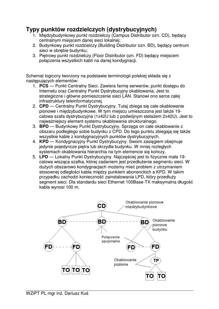 Typy punktów rozdzielczych (dystrybucyjnych) 1. Mi dzybudynkowy punkt rozdzielczy (Campus Distributor ozn. CD), b d cy centralnym miejscem danej sieci lokalnej; 2. Budynkowy punkt rozdzielczy (Building Distributor ozn. BD), b d cy centrum sieci w obr bie budynku; 3. Pi trowy punkt rozdzielczy (Floor Distributor ozn. FD) b d cy miejscem poł czenia wszystkich kabli na danej kondygnacji. Schemat logiczny tworzony na podstawie terminologii polskiej składa si z nast puj cych elementów: 1. PCS — Punkt Centralny Sieci. Zawiera farm serwerów, punkt dost pu do Internetu oraz Centralny Punkt Dystrybucyjny okablowania. Jest to strategiczne i główne pomieszczenie sieci LAN. Stanowi ono serce całej infrastruktury teleinformatycznej. 2. CPD — Centralny Punkt Dystrybucyjny. Tutaj zbiega si całe okablowanie pionowe i mi dzybudynkowe. W tym miejscu umieszczona jest tak e 19calowa szafa dystrybucyjna (1x42U lub z podwójnym stela em 2x42U). Jest to najwa niejszy element systemu okablowania strukturalnego. 3. BPD — Budynkowy Punkt Dystrybucyjny. Sprz ga on całe okablowanie z obszaru podległego sobie budynku z CPD. Do tego punktu zbiegaj si tak e wszystkie kable z kondygnacyjnych punktów dystrybucyjnych. 4. KPD — Kondygnacyjny Punkt Dystrybucyjny. Swoim zasi giem obejmuje jedynie pojedyncze pi tra lub skrzydła budynku. W mniej rozległych systemach okablowania hierarchia na tym elemencie si ko czy. 5. LPD — Lokalny Punkt Dystrybucyjny. Najcz ciej jest to fizycznie mała 19calowa wisz ca szafka, której zadaniem jest przedłu enie segmentu sieci. W du ych obszarowo kondygnacjach mo emy mie problem z utrzymaniem stosownej odległo ci kabla mi dzy punktem abonenckich a KPD. W takim przypadku zachodzi konieczno zainstalowania LPD, który przedłu y segment sieci. Dla standardu sieci Ethernet 100Base-TX maksymalna długo kabla wynosi 100 m. WZiPT PL mgr in . Dariusz Ku Rodzaje punktów dystrybucyjnych • Główny punkt rozdzielczy MDF (ang. Main Distribution Frame) to punkt centralny okablowania w topologii gwiazdy. Zbiegaj si w nim kable z s siednich budynków, pi ter i miejskiej centrali telefonicznej oraz odchodz przebiegi pionowe (do po rednich punktów dystrybucyjnych IDF w obiekcie) i poziome do punktów abonenckich zlokalizowanych w pobli u MDF (do 90m). Cz sto umieszczony jest na parterze lub na rodkowej kondygnacji budynku (np. 2 pi tro budynku 4 pi trowego), w jego pobli u znajduje si centralka telefoniczna, serwer lub inny sprz t aktywny. • Po redni punkt rozdzielczy IDF (ang. Intermediate Distribution Frame) lub inaczej SDF (ang. Sub-Distribution Frame) to lokalny punkt dystrybucyjny obsługuj cy najcz ciej dany obszar roboczy lub pi tro. Jest obszarem przej ciowym mi dzy okablowaniem pionowym i poziomym. Jest to miejsce, którego mo na dokonywa o poszerzenia sieci poprzez rozbudowywanie przebiegów poziomych o zarz dza wykorzystaniem tych przebiegów poprzez organizowanie ich poł cze o przeprowadza ich testowanie Umiejscowienie IDF-ów jest wyznaczane przy uwzgl dnieniu maksymalnej długo ci 90m przebiegów poziomych. Punkty rozdzielcze – rozkład komponentów WZiPT PL mgr in . Dariusz Ku • • • • • • • Przewody powinny by logicznie pogrupowane aby ułatwi ich zako czenie na panelach krosowych Kable powinny by prowadzone po obu stronach szafy lub ramy 19” Nie przekracza minimalnych dopuszczalnych promieni zgi cia kabli o 4 x Ø dla UTP o 6 x Ø dla FTP i UTP o 10 x F dla FO Co ka de 48 portów na panelach krosowych nale y umie ci panel z wieszakami Nie rozplata kabli na długo ci wi kszej ni jest to konieczne do ich zako czenia na zł czach (max 12.5mm) Podczas instalacji kabli ekranowanych STP/FTP doł czy drut uziemiaj cy do wła ciwej listwy lub szczeliny na zł czu IDC Oznaczy kable zgodnie z dokumentacj na obu ko cach Sekwencje WZiPT PL mgr in . Dariusz Ku