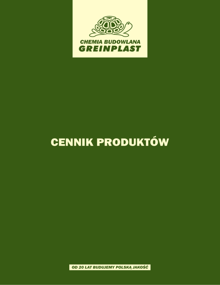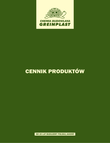 Cennik Produktów od 20 lat budujemy polską jakość spis treści 13 26 9 33 TYNKI 4 FARBY FASADOWE 9 FARBY PODKŁADOWE / PREPARATY ROZCIEŃCZAJĄCE 11 KLEJE SYSTEMOWE 13 GRUNTY / PREPARATY CZYSZCZĄCE 15 FARBY WEWNĘTRZNE 18 SZPACHLE / KLEJE / GIPSY 21 KLEJE DO PŁYTEK 23 ZAPRAWY WYRÓWNUJĄCE 26 TYNKI TRADYCYJNE 28 HYDROIZOLACJE 30 ZAPRAWY CEMENTOWE 33 IMPREGNATY / USZCZELNIACZE 36 DEKORACJE 41 AKCESORIA DO IZOLACJI WODOCHRONNYCH 44 MATERIAŁY TERMOIZOLACYJNE 44 AKCESORIA DO SYSTEMÓW OCIEPLEŃ 45 23 4 15 Przedstawione w cenniku zużycia zostały określone dla podłoży równych i dla jednej warstwy materiału. Wszystkie kolorystyki i struktury przedstawiono za pomocą technik drukarskich dlatego mogą odbiegać w niewielkim stopniu od oryginałów. tynk silikonowy TXB BARANEK Najnowocześniejszy silikonowy tynk elewacyjny, który posiada najwyższe parametry odporności na warunki atmosferyczne, wszelkiego rodzaju zabrudzenia i degradację biologiczną. Tynk tworzy powłoki matowe o fakturze „baranka” wysoce paroprzepuszczalne i nisko nasiąkliwe. Jest bardzo elastyczny i przez to odporny na uszkodzenia mechaniczne. Może być stosowany na wszelkie podłoża mineralne takie jak: beton, tynki cementowe, cementowo-wapienne, wapienno-cementowe, wapienne, gipsowe, itp. po min 28 dniach od ich wykonania oraz jako wyprawa tynkarska na warstwach zbrojonych siatką w systemach ociepleń Greinplast po min. 3 dniach od ich wykonania. Jest integralnym elementem systemu ociepleń Greinplast X, WX, X-XPS (zgodnie z odpowiednimi AT) i EPS. Kolorystyka wg palety Greinplast (220 kolorów). Możliwa inna kolorystyka realizowana w SGB. TXB 1,0: 1,4-1,6 Tynk silikonowy KORNIK cena netto vat cena brutto cena 1kg netto 25 [ BIAŁY ] 200,39 23% 246,48 8,02 25 [ GRUPA I ] 210,81 23% 259,30 8,43 25 [ GRUPA II ] 235,14 23% 289,22 9,40 25 [ GRUPA III ] 265,25 23% 326,26 10,61 25 [ GRUPA IV ] 313,90 23% 386,10 12,56 25 [ GRUPA V ] Ceny ustalane na indywidualne zamówienie zużycie ok. kg/m2 TXB 1,5: 2,3-2,5 TXB 2,0: 2,9-3,1 TXB 2,5: 3,2-3,4 TXB 3,0: 3,8-4,0 TXK Najnowocześniejszy silikonowy tynk elewacyjny, który posiada najwyższe parametry odporności na warunki atmosferyczne, wszelkiego rodzaju zabrudzenia i degradację biologiczną. Tynk tworzy powłoki matowe o fakturze „kornika” wysoce paroprzepuszczalne i nisko nasiąkliwe. Jest bardzo elastyczny i przez to odporny na uszkodzenia mechaniczne. Może być stosowany na wszelkie podłoża mineralne takie jak: beton, tynki cementowe, cementowo-wapienne, wapienno-cementowe, wapienne, gipsowe, itp. po min 28 dniach od ich wykonania oraz jako wyprawa tynkarska na warstwach zbrojonych siatką w systemach ociepleń Greinplast po min. 3 dniach od ich wykonania. Jest integralnym elementem systemu ociepleń Greinplast X, WX, X-XPS (zgodnie z odpowiednimi AT) i EPS. Kolorystyka wg palety Greinplast (220 kolorów). Możliwa inna kolorystyka realizowana w SGB. tynki opak [kg] opak [kg] cena netto vat cena brutto cena 1kg netto 25 [ BIAŁY ] 200,39 23% 246,48 8,02 25 [ GRUPA I ] 210,81 23% 259,30 8,43 25 [ GRUPA II ] 235,14 23% 289,22 9,40 25 [ GRUPA III ] 265,25 23% 326,26 10,61 25 [ GRUPA IV ] 313,90 23% 386,10 12,56 25 [ GRUPA V ] Ceny ustalane na indywidualne zamówienie zużycie ok. kg/m2 TXK 1,5: 2,1-2,3 TXK 2,0: 2,5-2,7 TXK 2,5: 3,1-3,3 TXK 3,0: 3,7-3,9 Tynk silikonowy baranek Z KRUSZYWEM SIC TXB Tynk silikonowy „baranek” z kruszywem SIC to najnowocześniejszy tynk elewacyjny, który posiada najwyższe parametry odporności na warunki atmosferyczne, wszelkiego rodzaju zabrudzenia i degradację biologiczną. Tynk tworzy powłoki wysoce paroprzepuszczalne o niskim współczynniku przenikania wody. Jest bardzo elastyczny i przez to odporny na uszkodzenia mechaniczne. Warstwę dekoracyjną z kruszywa ozdobnego wykonuje się poprzez jego natrysk na świeży tynk. Może być stosowany na wszelkie podłoża mineralne takie jak: beton, tynki cementowe, cementowo-wapienne, wapienno-cementowe, wapienne, gipsowe, itp. po min 28 dniach od ich wykonania oraz jako wyprawa tynkarska na warstwach zbrojonych siatką w systemach ociepleń Greinplast po min. 3 dniach od ich wykonania. Produkt dostępny na zamówienie. zużycie ok. kg/m2 TXB: 2,0:2,9-3,1 4 opak [kg] cena netto vat cena brutto cena 1kg netto 25 [ GRUPA I ] 210,81 23% 259,3 8,43 25 [ GRUPA II ] 235,14 23% 289,22 9,41 25 [ GRUPA III ] 265,25 23% 326,26 10,61 25 [ GRUPA IV ] 313,90 23% 386,10 12,56 25 [ GRUPA V ] Ceny ustalane na indywidualne zamówienie 25 [ SIC ] 200,24 23% 246,30 8,01 TAB opak [kg] cena netto vat cena brutto cena 1kg netto 25 [ BIAŁY ] 139,93 23% 172,11 5,60 25 [ GRUPA I ] 145,95 23% 179,52 5,84 25 [ GRUPA II ] 164,48 23% 202,31 6,58 25 [ GRUPA III ] 201,31 23% 247,61 8,05 25 [ GRUPA IV ] 230,27 23% 283,23 9,21 25 [ GRUPA V ] Ceny ustalane na indywidualne zamówienie Tynk akrylowy BARANEK Tynk akrylowy o niskim współczynniku przenikania wody. Tynk po aplikacji nadaje elewacji matową strukturę o fakturze „baranka” tworząc z podłożem wyjątkowo trwałe połączenie. Może być stosowany na wszelkie podłoża mineralne takie jak: beton, tynki cementowe, cementowo-wapienne, wapienno-cementowe, wapienne, itp. po min 28 dniach od ich wykonania oraz jako wyprawa tynkarska na warstwach zbrojonych siatką w systemach ociepleń Greinplast po min. 3 dniach od ich wykonania. Jest integralnym elementem systemów ociepleń Greinplast A i A-XPS (zgodnie z odpowiednimi AT) i EPS (zgodnie z odpowiednimi ETA). Dostępna kolorystyka wg palety wyrobów fasadowych Greinplast (220 kolorów). Na życzenie klienta możliwa jest inna kolorystyka realizowana w Systemie Barwienia Greinplast SGB. zużycie ok. kg/m2 TAB 1,0: 1,4-1,6 TAB 1,5: 2,5-2,7 TAB 2,0: 3,1-3,3 TAB 2,5: 3,4-3,6 TAB 3,0: 4,0-4,2 TAK cena netto vat cena brutto cena 1kg netto 25 [ BIAŁY ] 139,93 23% 172,11 5,60 25 [ GRUPA I ] 145,95 23% 179,52 5,84 25 [ GRUPA II ] 164,48 23% 202,31 6,58 25 [ GRUPA III ] 201,31 23% 247,61 8,05 25 [ G