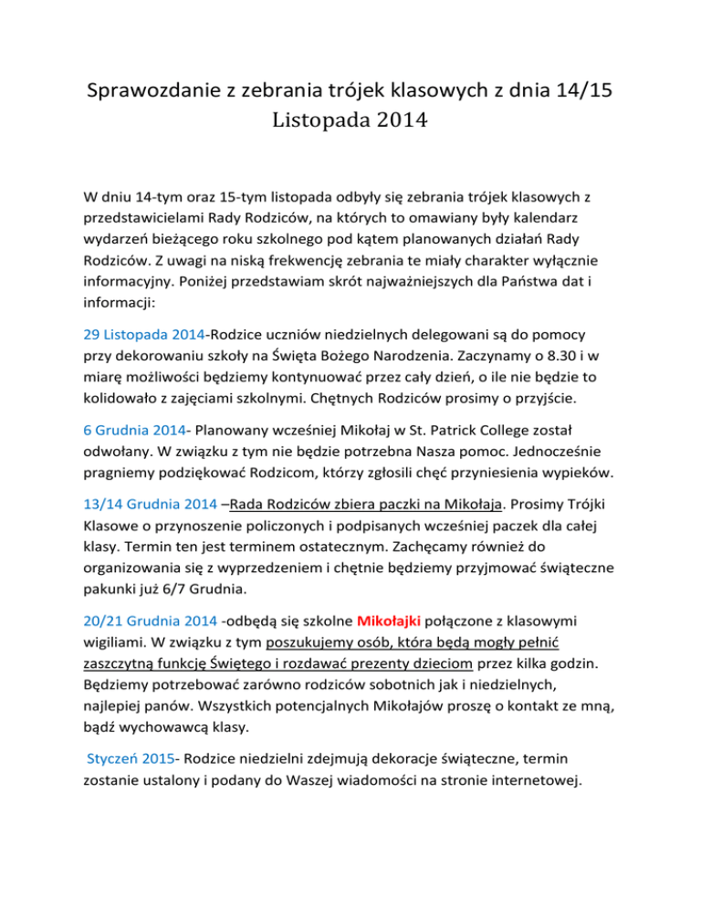 Sprawozdanie z zebrania trójek klasowych z dnia 14/15 Listopada 2014 W dniu 14-tym oraz 15-tym listopada odbyły się zebrania trójek klasowych z przedstawicielami Rady Rodziców, na których to omawiany były kalendarz wydarzeń bieżącego roku szkolnego pod kątem planowanych działań Rady Rodziców. Z uwagi na niską frekwencję zebrania te miały charakter wyłącznie informacyjny. Poniżej przedstawiam skrót najważniejszych dla Państwa dat i informacji: 29 Listopada 2014-Rodzice uczniów niedzielnych delegowani są do pomocy przy dekorowaniu szkoły na Święta Bożego Narodzenia. Zaczynamy o 8.30 i w miarę możliwości będziemy kontynuować przez cały dzień, o ile nie będzie to kolidowało z zajęciami szkolnymi. Chętnych Rodziców prosimy o przyjście. 6 Grudnia 2014- Planowany wcześniej Mikołaj w St. Patrick College został odwołany. W związku z tym nie będzie potrzebna Nasza pomoc. Jednocześnie pragniemy podziękować Rodzicom, którzy zgłosili chęć przyniesienia wypieków. 13/14 Grudnia 2014 –Rada Rodziców zbiera paczki na Mikołaja. Prosimy Trójki Klasowe o przynoszenie policzonych i podpisanych wcześniej paczek dla całej klasy. Termin ten jest terminem ostatecznym. Zachęcamy również do organizowania się z wyprzedzeniem i chętnie będziemy przyjmować świąteczne pakunki już 6/7 Grudnia. 20/21 Grudnia 2014 -odbędą się szkolne Mikołajki połączone z klasowymi wigiliami. W związku z tym poszukujemy osób, która będą mogły pełnić zaszczytną funkcję Świętego i rozdawać prezenty dzieciom przez kilka godzin. Będziemy potrzebować zarówno rodziców sobotnich jak i niedzielnych, najlepiej panów. Wszystkich potencjalnych Mikołajów proszę o kontakt ze mną, bądź wychowawcą klasy. Styczeń 2015- Rodzice niedzielni zdejmują dekoracje świąteczne, termin zostanie ustalony i podany do Waszej wiadomości na stronie internetowej. Luty/Marzec 2015- na początku nowego semestru zostanie zorganizowane kolejne zebranie trójek klasowych z Radą Rodziców. Na którym to będziemy omawiać kolejne wydarzenia z życia szkoły związane z Naszym czynnym udziałem. Z poważaniem Przewodnicząca RP Justyna Paterek-Jaros [email protected] Cavan 20/11/2014