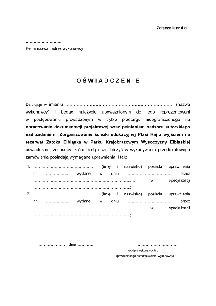 Załącznik nr 4 a ……………………… Pełna nazwa i adres wykonawcy OŚWIADCZENIE Działając w imieniu ………………………………………………………………… (nazwa wykonawcy) w i postępowaniu będąc należycie prowadzonym upoważnionym w trybie do przetargu jego reprezentowani nieograniczonego na opracowanie dokumentacji projektowej wraz pełnieniem nadzoru autorskiego nad zadaniem „Zorganizowanie ścieżki edukacyjnej Ptasi Raj z wyjściem na rezerwat Zatoka Elbląska w Parku Krajobrazowym Wysoczyzny Elbląskiej oświadczam, że osoby, które będą uczestniczyć w wykonywaniu przedmiotowego zamówienia posiadają wymagane uprawnienia, i tak: 1. ……………………………………….. nr …………….. wydane (imię w i dniu nazwisko) posiada uprawnienia …………………………… ………………………………………………………………..… w przez specjalizacji ……………………………………………………………….; 2. ……………………………………….. nr …………….. wydane (imię w i dniu nazwisko) posiada uprawnienia …………………………… ………………………………………………………………..… w specjalizacji ……………………………………………………………….; …………………, dnia………….. przez …………………………. (podpis wykonawcy lub upoważnionego przedstawiciela wykonawcy) Załącznik nr 4 b ……………………… Pełna nazwa i adres wykonawcy OŚWIADCZENIE Działając w imieniu ………………………………………………………………… (nazwa wykonawcy) i będąc należycie upoważnionym do jego reprezentowani w postępowaniu prowadzonym w trybie przetargu nieograniczonego na opracowanie dokumentacji projektowej oraz pełnienie nadzoru autorskiego: Rekonstrukcja wież do obserwacji ptaków oraz kładki nad Jeziorem Łuknajno oraz modernizacja kładki, pomostów widokowych i oznakowanie ścieżek przyrodniczych w rezerwatach przyrody "Zakręt", "Królewska sosna", "Krutyń" - Mazurski Park Krajobrazowy, oświadczam, że osoby, które będą uczestniczyć w wykonywaniu przedmiotowego zamówienia posiadają wymagane uprawnienia, i tak: 1. ……………………………………….. nr …………….. wydane (imię w i dniu nazwisko) posiada uprawnienia …………………………… ………………………………………………………………..… przez w specjalizacji posiada uprawnienia ……………………………………………………………….; 2. ……………………………………….. nr …………….. wydane (imię w i dniu nazwisko) …………………………… ………………………………………………………………..… w specjalizacji ……………………………………………………………….; …………………, dnia………….. przez …………………………. (podpis wykonawcy lub upoważnionego przedstawiciela wykonawcy) Załącznik nr 4c ……………………… Pełna nazwa i adres wykonawcy OŚWIADCZENIE Działając w imieniu ………………………………………………………………… (nazwa wykonawcy) i będąc należycie upoważnionym do jego reprezentowani w postępowaniu prowadzonym w trybie przetargu nieograniczonego na opracowanie dokumentacji projektowej oraz pełnienie nadzoru autorskiego Rewitalizacja zabytkowego parku podworskiego w Bludziach - Park Krajobrazowy Puszczy Rominckiej oświadczam, że osoby, które będą uczestniczyć w wykonywaniu przedmiotowego zamówienia posiadają wymagane uprawnienia, i tak: 1. ……………………………………….. nr …………….. wydane (imię w i dniu nazwisko) posiada uprawnienia …………………………… ………………………………………………………………..… przez w specjalizacji posiada uprawnienia ……………………………………………………………….; 2. ……………………………………….. nr …………….. wydane (imię w i dniu nazwisko) …………………………… ………………………………………………………………..… w specjalizacji ……………………………………………………………….; …………………, dnia………….. przez …………………………. (podpis wykonawcy lub upoważnionego przedstawiciela wykonawcy) Załącznik nr 4 d ……………………… Pełna nazwa i adres wykonawcy OŚWIADCZENIE Działając w imieniu ………………………………………………………………… (nazwa wykonawcy) i będąc należycie upoważnionym do jego reprezentowani w postępowaniu prowadzonym w trybie przetargu nieograniczonego na opracowanie dokumentacji projektowej oraz pełnienie nadzoru autorskiego: Mała infrastruktura na terenie Zespołu Parków Krajobrazowych Pojezierza Iławskiego i Wzgórz Dylewskich (inwestycja w Parku Krajobrazowym Pojezierza Iławskiego), oświadczam, że osoby, które będą uczestniczyć w wykonywaniu przedmiotowego zamówienia posiadają wymagane uprawnienia, i tak: 1. ……………………………………….. nr …………….. wydane (imię w i dniu nazwisko) posiada uprawnienia …………………………… ………………………………………………………………..… przez w specjalizacji posiada uprawnienia ……………………………………………………………….; 2. ……………………………………….. nr …………….. wydane (imię w i dniu nazwisko) …………………………… ………………………………………………………………..… w specjalizacji ……………………………………………………………….; …………………, dnia………….. przez …………………………. (podpis wyk