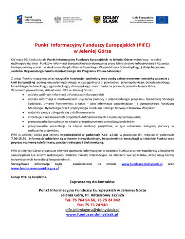 Punkt Informacyjny Funduszy Europejskich (PIFE) w Jeleniej Górze Od maja 2014 roku działa Punkt Informacyjny Funduszy Europejskich w Jeleniej Górze wchodzący w skład ogólnopolskiej sieci Punktów Informacji Europejskiej koordynowanej przez Ministerstwo Infrastruktury i Rozwoju. Umiejscowiony został w strukturze Urzędu Marszałkowskiego Województwa Dolnośląskiego ( dotychczasowa siedziba Regionalnego Punktu Kontaktowego dla Programu Polska-Saksonia). Z usług Punktu mogą korzystać wszystkie instytucje - podmioty oraz osoby zainteresowane tematyką wsparcia z Unii Europejskiej podregionu jeleniogórskiego, w szczególności z powiatów: jeleniogórskiego, bolesławieckiego, lubańskiego, lwóweckiego, zgorzeleckiego, złotoryjskiego oraz miasta na prawach powiatu Jelenia Góra. W ramach prowadzonej działalności PIFE w Jeleniej Górze: udziela ogólnych informacji o Funduszach Europejskich udziela informacji o możliwościach uzyskania pomocy z odpowiedniego programu Narodowej Strategii Spójności, Umowy Partnerstwa, a także – jako informacje uzupełniające - z Europejskiego Funduszu Morskiego i Rybackiego oraz Europejskiego Funduszu Rolnego Rozwoju Obszarów Wiejskich wyjaśnia zasady ubiegania się o dofinansowanie informuje o realizowanych projektach dofinansowanych z Funduszy Europejskich, przeprowadza konsultacje na etapie przygotowywania wniosków/projektów; przeprowadza konsultacje na etapie realizacji projektów, w tym udzielanie wstępnej pomocy w rozliczaniu projektów; PIFE w Jeleniej Górze jest czynny w poniedziałki w godzinach 7.30 -17.30, w pozostałe dni robocze w godzinach 7.30-15.30. Informacje udzielane są w formie indywidualnych, bezpośrednich konsultacji w siedzibie Punktu oraz poprzez rozmowę telefoniczną, pocztę tradycyjną i elektroniczną. PIFE w Jeleniej Górze organizuje również spotkania informacyjne w siedzibie Punktu oraz we współpracy z lokalnymi samorządami lub innymi instytucjami Mobilne Punkty Informacyjne na obszarze ww powiatów, które mają formę indywidualnych konsultacji bezpośrednich. Szczegółowe informacje będą zamieszczane na stronie www.fundusze.dolnyslask.pl oraz www.funduszeeuropejskie.gov.pl Usługi PIFE są bezpłatne. Zapraszamy do kontaktu: Punkt Informacyjny Funduszy Europejskich w Jeleniej Górze Jelenia Góra, Pl. Ratuszowy 32/32a Tel. 75 764 94 66, 75 75 24 942 fax: 75 75 24 940 [email protected] www.fundusze.dolnyslask.pl