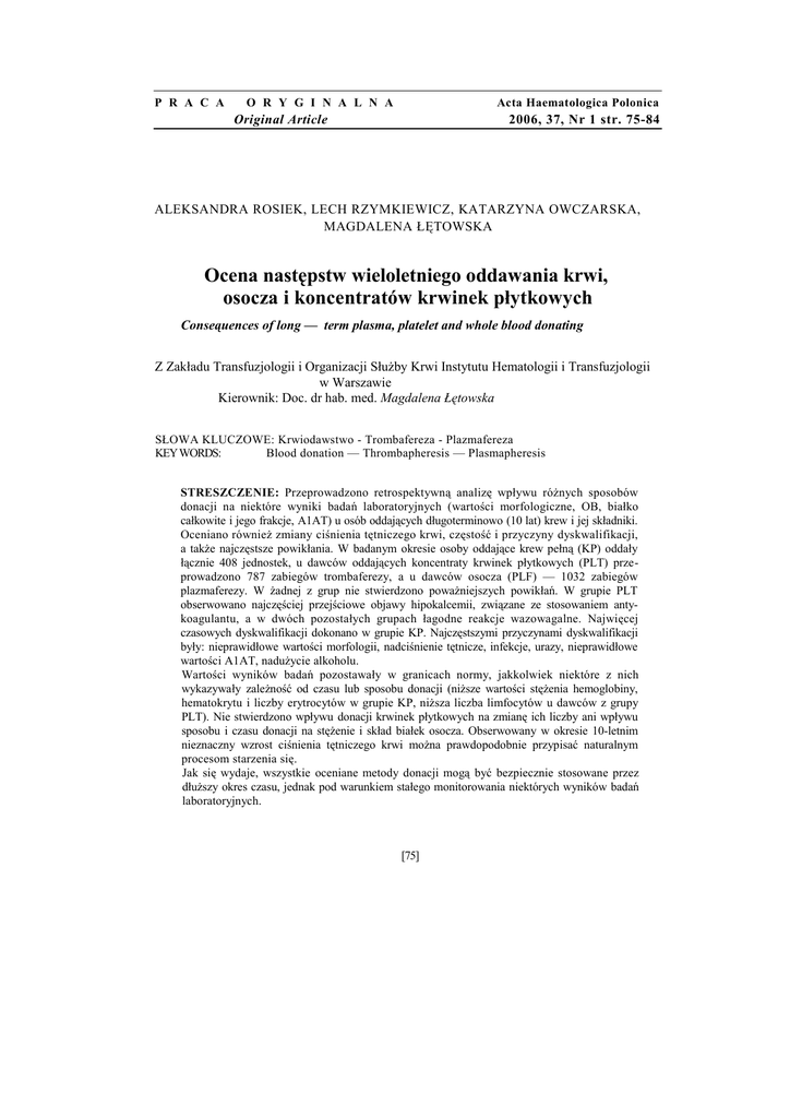 P R A C A O R Y G I N A L N A Acta Haematologica Polonica Original Article 2006, 37, Nr 1 str. 75-84 ALEKSANDRA ROSIEK, LECH RZYMKIEWICZ, KATARZYNA OWCZARSKA, MAGDALENA ŁĘTOWSKA Ocena następstw wieloletniego oddawania krwi, osocza i koncentratów krwinek płytkowych Conseąuences of long — term plasma, platelet and whole blood donating Z Zakładu Transfuzjologii i Organizacji Służby Krwi Instytutu Hematologii i Transfuzjologii w Warszawie Kierownik: Doc. dr hab. med. Magdalena Łętowska SŁOWA KLUCZOWE: Krwiodawstwo - Trombafereza - Plazmafereza KEY WORDS: Blood donation — Thrombapheresis — Plasmapheresis STRESZCZENIE: Przeprowadzono retrospektywną analizę wpływu różnych sposobów donacji na niektóre wyniki badań laboratoryjnych (wartości morfologiczne, OB, białko całkowite i jego frakcje, A1AT) u osób oddających długoterminowo (10 lat) krew i jej składniki. Oceniano również zmiany ciśnienia tętniczego krwi, częstość i przyczyny dyskwalifikacji, a także najczęstsze powikłania. W badanym okresie osoby oddające krew pełną (KP) oddały łącznie 408 jednostek, u dawców oddających koncentraty krwinek płytkowych (PLT) przeprowadzono 787 zabiegów trombaferezy, a u dawców osocza (PLF) — 1032 zabiegów plazmaferezy. W żadnej z grup nie stwierdzono poważniejszych powikłań. W grupie PLT obserwowano najczęściej przejściowe objawy hipokalcemii, związane ze stosowaniem antykoagulantu, a w dwóch pozostałych grupach łagodne reakcje wazowagalne. Najwięcej czasowych dyskwalifikacji dokonano w grupie KP. Najczęstszymi przyczynami dyskwalifikacji były: nieprawidłowe wartości morfologii, nadciśnienie tętnicze, infekcje, urazy, nieprawidłowe wartości A1AT, nadużycie alkoholu. Wartości wyników badań pozostawały w granicach normy, jakkolwiek niektóre z nich wykazywały zależność od czasu lub sposobu donacji (niższe wartości stężenia hemoglobiny, hematokrytu i liczby erytrocytów w grupie KP, niższa liczba limfocytów u dawców z grupy PLT). Nie stwierdzono wpływu donacji krwinek płytkowych na zmianę ich liczby ani wpływu sposobu i czasu donacji na stężenie i skład białek osocza. Obserwowany w okresie 10-letnim nieznaczny wzrost ciśnienia tętniczego krwi można prawdopodobnie przypisać naturalnym procesom starzenia się. Jak się wydaje, wszystkie oceniane metody donacji mogą być bezpiecznie stosowane przez dłuższy okres czasu, jednak pod warunkiem stałego monitorowania niektórych wyników badań laboratoryjnych. [75] 76 A. ROSIEK, L. RZYMKIEWICZ, K. OWCZARSKA, M. ŁĘTOWSKA SUMMARY: In order to compare long-term conseąuences of repeated plateletpheresis, plasmapheresis and whole blood donations, a retrospective study covering the last ten years has been performed. A variety of haematological and biochemical data were analysed, including blood counts, serum proteins and protein fractions, ALT, also blood pressure, deferral rates and adverse effects freąuency. During this period persons ąualified as whole blood donors (No = 11) donated summarily 408 blood units, platelet donors (No = 10) underwent 787 continuous plateletpheresis procedures, and plasma donors (No = 10) — 1032 plasmapheresis procedures (both manuał and automatic). No serious complications occurred in either investigated group. Mild vasovagal events were most freąuent in whole blood donors, while transient paresthesia in platelet donors. Deferral rates were highest in whole blood group, the most common reasons being Iow haemoglobin, abnormal blood pressure values and infections of various origin. The analysis of laboratory results revealed some differences between groups (though values remained well within normal rangę). Mean erythrocyte counts were lower in whole blood donors, than in both platelet and plasma donors, whereas lymphocyte counts were lowest in platelet donors. Platelet counts in platelet donors and in two other groups did not differ significantly. No significant differences concerning either serum proteins or protein fractions were observed. Blood pressure values tended to increase slightly during observation period, probably due to natural ageing processes. In conclusion, while all analysed donation methods appear to be safe enough for long-term donors, continuous monitoring of some laboratory results seems to be recommended. WSTĘP Współczesna transfuzjologia zaleca stosowanie wybranych składników krwi zgodnie z indywidualnym zapotrzebowaniem chorego. Stąd też na przestrzeni ostatnich kilkudziesięciu lat obok donacji krwi pełnej wprowadzono szereg metod selektywnego pobierania wybranych składników krwi, w tym plazmaferezę (pobieranie osocza) i trombaferezę (pobieranie krwinek płytkowych). Metody te uznawane są powszechnie za bezpieczne i dobrze tolerowane, jednak w przypadku wieloletnich donacji niezbędna jest systematyczna kontrola stanu klinicznego i wyników badań laboratoryjnych dawców. Praca niniejsza miała na celu przeprowadzenie analizy retrospektywnej wpływu różnych sposobów donacji (krew pełna, plazmafereza i trombafereza) na niektóre wyniki badań laboratoryjnych i badania przedmiotowego osób oddających długoterminowo krew i jej składniki. MATERIAŁY I METODY Badania przeprowadzono u zdrowych dawców, spełniających standardowe kryteria kwalifikacyjne (1). Byli to: 1) dawcy oddający krew pełną (450 ml na donację) określani dalej jako grupa KP, 2) dawcy oddający osocze metodą plazmaferezy (400 do 600 ml na donację) – określani dalej jako grupa PLF. Zabiegi plazmaferezy przeprowadzano metodą manualną lub przy użyciu separatorów osocza (PCS – Haemonetics, Autopheresis – Baxter), 3) dawcy oddający metodą trombaferezy koncentraty krwinek płytkowych (KKP), zawierające 3–4x10 11 płytek/koncentrat – określani dalej jako grupa PLT. Oddawanie krwi, osocza i koncentratów krwinek płytkowych 77 KKP otrzymywano przy użyciu separatorów o przepływie ciągłym (CS 3000 Plus