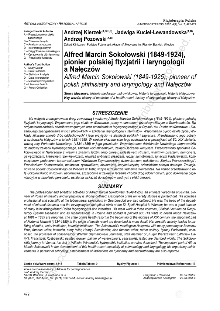 Fizjoterapia Polska ARTYKU£ HISTORYCZNY / HISTORICAL ARTICLE Zak³ad Klinicznych Podstaw Fizjoterapii, AkademiA Medyczna im. Piastów Œl¹skich, Wroc³aw tio np roh ibit Alfred Marcin Soko³owski (1849-1924), pionier polskiej ftyzjatrii i laryngologii a Na³êczów Author’s Contribution A – Study Design B – Data Collection C – Statistical Analysis D – Data Interpretation E – Manuscript Preparation F – Literature Search G – Funds Collection Alfred Marcin Soko³owski (1849-1925), pioneer of polish phthisiatry and laryngology and Na³êczów -d istr al us eo nly Na wstêpie zrelacjonowano drogi zawodow¹ i naukow¹ Alfreda Marcina Soko³owskiego (1849-1924), pioniera polskiej ftyzjatrii i laryngologii. Wspomniano jego studia w Warszawie, pracê w sanatorium przeciwgruŸliczym w Goerbersdorfie. By³ ordynatorem oddzia³u chorób wewnêtrznych oraz ambulatorium laryngologicznego w Szpitalu œw. Ducha w Warszawie. Ukazano jego zaanga¿owanie w tych placówkach w szkoleniu laryngologów i internistów. Wspomniano o jego dziele ¿ycia „Wyk³ady kliniczne chorób dróg oddechowych” i jego przyjêciu na ziemiach polskich i zagranic¹. Przedstawiono jego pobyty w uzdrowisku Na³êczów w latach 1881-1885. W skrócie ukazano stan tego uzdrowiska w pocz¹tkach lat 80. XIX stulecia, wa¿n¹ rolê Fortunata Nowickiego (1834-1885) w jego powstaniu. Wszechstronna dzia³alnoœæ Nowickiego doprowadzi³a do budowy zak³adu hydropatycznego, zak³adu wód mineralnych, zak³adu leczenia kumysem. Przedstawiono spotkania Soko³owskiego w Na³êczowie z wieloma znanymi ludŸmi tego okresu: Boles³awem Prusem, wybitnym pisarzem, humoryst¹, gawêdziarzem, Henrykiem Sienkiewiczem, równie¿ wybitnym pisarzem, raczej samotnikiem, Ignacym Paderewskim, kompozytorem, profesorem konserwatorium, Wac³awem Szymanowskim, dziennikarzem, redaktorem „Kurjera Warszawskiego”, Franciszkiem Kostrzewskim, malarzem, rysownikiem, akwarelist¹, karykaturzyst¹, cz³owiekiem pe³nym dowcipu. Zrelacjonowano podró¿ Soko³owskiego do Wiednia w 1882, wizytê w zak³adzie Wilhelma Winternitza. Na koniec przedstawiono rolê Soko³owskiego w rozwoju uzdrowiska, szczególnie w zakresie leczenia chorób dróg oddechowych, jego dokonania organizacyjne w szkoleniu personelu, ustalania wskazañ do zabiegów wodnych i elektroterapii. on SUMMARY is c op y is for pe rs The professional and scientific activities of Alfred Marcin Soko³owski (1849-1924), an eminent Varsovian physician, pioneer of Polish phthisiatry and laryngology is shortly outlined. Description of his university studies is pointed out. His activities professional and scientific at the tuberculosis sanatorium in Goerbersdorf are also outlined. He was the head of the department of internal diseases and the laryngological outaptient clinic at the St. Spirit Hospital in Warsaw, he was a good teacher of many later distinguished Polish laryngologists and internists. His main work in three volumes „Clinical Lectures on Respiratory System Diseases” and its repercussions in Poland and abroad is pointed out. His visits to health resort Na³êczów at 1881 – 1885 are reported. The state of this health resort in the beginning of the eighties of XIX century, the important part of Fortunat Nowicki (1834-1885) in the origin of health resort are described in more detail. His versatile activity leaded to building of baths, water institution, koumiss institution. The Soko³owski's meetings in Na³êczów with many personages: Boles³aw Prus, famous writer, humorist, story teller, Henryk Sienkiewicz, also famous writer, rather solitary, Ignacy Paderewski, composer, the professor of conservatory, Wac³aw Szymanowski, journalist, staff member of „Kurjer Warszawski” („Warsaw Daily”), Franciszek Kostrzewski, painter, drawer, painter of water-colours, caricaturist, jester, are desribed widely. The Soko³owski's journey to Vienna, his visit at Wilhelm Winternitz's hydropathic institution are also described. The important part of Alfred Marcin Soko³owski in the development of this health resort especially at pulmonology and laryngology, his organizing achievements in personnel schooling, establishment of indications on hyropathy and electrotherapy are also reported. Liczba s³ów/Word count: 6345 Tabele/Tables: 0 Adres do korespondencji / Address for correspondence prof. Andrzej Kierzek 50-334 Wroc³aw, ul. Rozbrat 5 m. 6 tel. (0-71) 322-17-60, fax: (0-71) 322-17-51, e-mail: [email protected] Th This copy is for personal use only - distribution prohibited. This copy is for personal use only - distribution prohibited. - STRESZCZENIE ibu S³owa kluczowe: historia medycyny uzdrowiskowej, historia laryngologii, historia Na³êczowa Key words: history of medicine of a health resort, history of laryngology, history of Na³êczów - This copy is for personal use only - distribution prohibited. ed . Andrzej Kierzek(A,B,E,F), Jadwiga Kuciel-Lewandowska(A,B), Andrzej Pozowski(A,B) Zaanga¿owanie Autorów A – Przygotowanie projektu badawczego B – Zbieranie danych C – Analiza statystyczna D – Interpretacja danych E – Przygotowanie manuskryptu F – Opracowanie piœmiennictwa G – Pozyskanie funduszy - This copy is for personal use only - distribution prohibited. - © MEDSPORTPRESS, 2007; 4(4); Vol. 7, 472-479 472 Ryciny/Figures: 1 Piœmiennictwo/References: 13 Otrzymano / Received Zaakceptowano / Accepted 08.05.2006 r. 28.08.2006 r. tio np roh ibit ibu -d istr nly eo for pe rs on al us This copy is for personal use only - distribution prohibited. is c op y is - Th Ryc. 1. A. M. Soko³owski (1849-1924). Gaz. Lek. 1913, R. XLVIII, Nr 45, s. 1163 Fig. 1. A. M. Soko³owski (1849-1924) - This copy is for personal use only - distribution prohibited. Marcin Soko³owski (1849-1924) has been considered a pioneer of Polish phthisiatry and health resort treatment of pulmonary tuberculosis. The author of the present paper has written, among others, on the development of Polish 