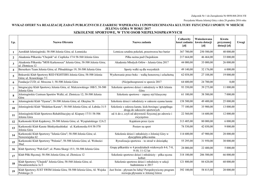 Załącznik Nr 1 do Zarządzenia Nr 0050.868.2016.VII Prezydenta Miasta Jeleniej Góry z dnia 28 grudnia 2016 roku WYKAZ OFERT NA REALIZACJĘ ZADAŃ PUBLICZNYCH Z ZAKRESU WSPIERANIA I UPOWSZECHNIANIA KULTURY FIZYCZNEJ I SPORTU W MIEŚCIE JELENIA GÓRA W ROKU 2017 SZKOLENIE SPORTOWE, W TYM OSÓB NIEPEŁNOSPRAWNYCH Lp. Nazwa Oferenta 1 Aeroklub Jeleniogórski; 58-500 Jelenia Góra; ul. Łomnicka 2 Akademia Piłkarska "Chojnik" ul. Cieplicka 17/4 58-560 Jelenia Góra 3 Akademia Piłkarska "MOS Karkonosze" Jelenia Góra; 58-500 Jelenia Góra; ul. Złotnicza 12 Berserkers Team Jelenia Góra; ul. Piłsudskiego 19; 58-500 Jelenia Góra 4 5 6 Bokserski Klub Sportowy RED FIGHTERS Jelenia Góra; 58-500 Jelenia Góra; ul. Krasickiego 7/1 Fundacja CUD; ul. Mroczna 1; 58-500 Jelenia Góra 9 Integracyjny Klub Sportowy Jelenia Góra, ul. Malczewskiego 18B/5, 58-500 Jelenia Góra Jeleniogórskie Centrum Sportów Walki; ul. Złotnicza 12; 58-500 Jelenia Góra Jeleniogórski Klub "Oyama"; 58-500 Jelenia Góra; ul. Okrężna 56 10 Jeleniogórski Klub "Shidokan Karate"; 58-560 Jelenia Góra; ul. Łabska 31/5 7 8 11 12 13 14 15 Jeleniogórski Klub Sportowo-Rehabilitacyjny ul. Kiepury 17/31 58-506 Jelenia Góra Karkonoski Klub Kajakowy; 58-500 Jelenia Góra; ul. Wyspiańskiego 12A/2 Karkonoski Klub Karate Shinkyokushinkai ul. Karkonoska 8/4 58-570 Jelenia Góra Karkonoski Klub Sportowy "Jelenia Góra"; 58-500 Jelenia Góra; ul. Nowowiejska 62 Karkonoski Klub Sportowy "Polonia"; 58-500 Jelenia Góra; ul. Wolności 39of. Nazwa zadania Całkowity Wnioskowana koszt zadania kwota dotacji [zł] [zł] Kwota przyznanej dotacji [zł] Lotnicza sztafeta pokoleń, przestworza bez barier 367 700,00 250 500,00 40 000,00 Piłka nożna pod Chojnikiem 217 664,00 46 464,00 33 000,00 Akademia Młodych Orłów - Jelenia Góra 2017 44 000,00 35 000,00 26 000,00 Sporty walki są dla wszystkich 49 140,00 32 176,00 6 000,00 Wychowanie przez boks – walkę honorową i szlachetną 62 038,00 27 188,00 19 000,00 (Nie)pełnosprawni w sporcie 2017 64 600,00 24 700,00 0,00 Szkolenie sportowe dzieci i młodzieży w IKS Jelenia Góra Szkolenie sportowe – zapasy styl klasyczny 93 350,00 39 275,00 11 000,00 61 100,00 38 500,00 7 000,00 Szkolenie dzieci i młodzieży w zakresie oyama karate 158 500,00 49 400,00 25 000,00 Szkolenie z zakresu karate, kick-boxingu i grapplingu drogą do sukcesów sportowych od A do z, czyli od aktywność fizycznej po zdrowie i zwycięstwo Kajakiem przez życie 77 100,00 35 900,00 13 000,00 22 560,00 14 600,00 12 000,00 313 405,00 80 000,00 6 000,00 Postaw na sport 78 530,00 42 030,00 9 000,00 Szkolenie dzieci i młodzieży z Jeleniej Góry w dyscyplinie piłka nożna Rywalizacja sportowa – to strzał w dziesiątkę 114 600,00 47 900,00 28 000,00 55 295,00 31 950,00 30 000,00 28 000,00 22 400,00 5 000,00 318 100,00 206 500,00 66 000,00 121 800,00 84 620,00 60 000,00 392 100,00 58 815,00 20 000,00 16 Klub Sportowy "Pub-Gol"; ul. Piotra Skargi 15/1; 58-500 Jelenia Góra 17 Klub Piłki Ręcznej; 58-506 Jelenia Góra; ul. Złotnicza 12 18 Klub Sportowy "Chojnik" Jelenia Góra; 58-560 Jelenia Góra; ul. Dwudziestolecia 3c/3 Grupy piłkarskie w 4 przedziałach wiekowych 4-6, 7-8, 9-10, 11-12 lat Szkolenie sportowe dzieci i młodzieży – piłka ręczna kobiet Szkolenie sportowe dzieci i młodzieży w sekcji badmintona w 2017 19 Klub Sportowy JUST SWIM Jelenia Góra; 58-500 Jelenia Góra, Al. Wojska Polskiego 21 Just Swim - pływam bo lubię! Perspektywiczny program rozwoju pływania w Jeleniej Górze Uwagi 20 Klub Sportowy "Sudety" Jelenia Góra Stowarzyszenie; 58-500 Jelenia Góra; ul. Sudecka 42 Powszechna nauka gry w koszykówkę – szkolenie dzieci i młodzieży 119 300,00 82 180,00 55 000,00 21 Klub Sportowy "Wichoś" Jelenia Góra; 58-506 Jelenia Góra; ul. Moniuszki 9 KS Wichoś Jelenia Góra – Przyjemność i pasja 169 200,00 131 700,00 60 000,00 22 Klub Sportowy Orlik” ; 58-500 Jelenia Góra; ul. Groszowa 49 40 580,00 25 000,00 11 000,00 23 Klub Szachowy "Jelonka"; 58-500 Jelenia Góra; ul. Sudecka 42 Szkolenie dzieci i młodzieży w piłce nożnej dziewcząt i chłopców Szkolenie dzieci i młodzieży w szachach na rok 2017 28 600,00 22 600,00 10 000,00 24 Klub Tenisa Stołowego Jelenia Góra ul. Złotnicza 12 58-500 Jelenia Góra Szkolenie sportowe w sekcji tenisa stołowego 50 240,00 40 150,00 22 000,00 25 Klub Tenisowy "Jelenia Góra"; 58-506 Jelenia Góra; ul. Kiepury 53/45 Szkolenie sportowe dzieci i młodzieży 91 800,00 56 400,00 26 000,00 Miejski Klub Sportowy "Karkonosze" Jelenia Góra; 58-500 Jelenia Góra; ul. Złotnicza 12 Międzyszkolny Klub Lekkoatletyczny "12" Jelenia Góra; 58-500 Jelenia Góra; ul. Grunwaldzka 64a Międzyszkolny Klub Sportowy "Karkonosze" - Sporty Zimowe Jelenia Góra; 58-570 Jelenia Góra; ul. Karkonoska 5 Międzyszkolny Klub Sportowy Międzyszkolnego Ośrodka Sportu "Karkonosze" Jelenia Góra; 58-500 Jelenia Góra; ul. Morcinka 31 Karkonosze – tu spełniają się marzenia 324 700,00 165 700,00 64 000,00 Organizacja szkolenia sportowego dzieci i młodzieży w zakresie lekkiej atletyki Szkolenie sportowe w MKS Karkonosze - Sporty Zimowe Jelenia Góra Uprawiamy sport z Miastem Jelenia Góra - Szkolenie sportowe dzieci i młodzieży, udział we współzawodnictwie sportowym - Koszykówka Dziewcząt 134 730,00 107 050,00 64 000,00 347 350,00 276 400,00 175 000,00 143 200,00 114 560,00 46 000,00 Dziś jeżdżę na rowerze, biegam i pływam, jutro zdrowie wygrywam Szkolenie sportowe dzieci i młodzieży w orientacji sportowej Szkolenie sportowe w zakresie sztuk walki skierowane do dzieci, młodzieży, dorosłych. Aktywowanie sprawności fizycznej osób niepełnosprawnych i seniorów. Organizacja zawodów sportowych rangi międzynarodowej wspólnie ze Światową Federacją JUJiTSU. Wychowanie przez góry dla gór 241 200,00 102 300,00 30 000,00 81 880,20 64 400,00 59 000,00 85 600,00 68 480,00 0,00 85 366,00 23 000,00 13 000,00 Organizacja szkolenia narciarskiego dzieci