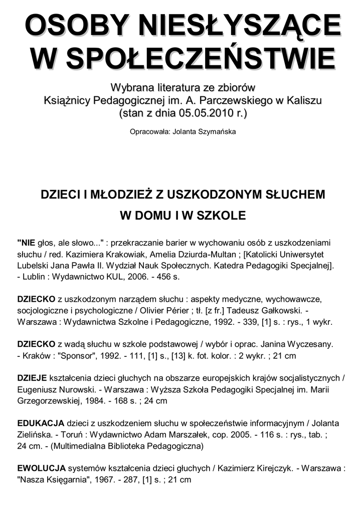OSOBY NIESŁYSZĄCE W SPOŁECZEŃSTWIE W ybrana literatura ze zbiorów Książnicy Pedagogicznej im. A. Parczewskiego w Kaliszu (stan z dnia 05.05.2010 r.) Opracowała: Jolanta Szymańska DZIECI I MŁODZIEŻ Z USZKODZONYM SŁUCHEM W DOMU I W SZKOLE "NIE głos, ale słowo..." : przekraczanie barier w wychowaniu osób z uszkodzeniami słuchu / red. Kazimiera Krakowiak, Amelia Dziurda-Multan ; [Katolicki Uniwersytet Lubelski Jana Pawła II. Wydział Nauk Społecznych. Katedra Pedagogiki Specjalnej]. - Lublin : Wydawnictwo KUL, 2006. - 456 s. DZIECKO z uszkodzonym narządem słuchu : aspekty medyczne, wychowawcze, socjologiczne i psychologiczne / Olivier Périer ; tł. [z fr.] Tadeusz Gałkowski. Warszawa : Wydawnictwa Szkolne i Pedagogiczne, 1992. - 339, [1] s. : rys., 1 wykr. DZIECKO z wadą słuchu w szkole podstawowej / wybór i oprac. Janina Wyczesany. - Kraków : "Sponsor", 1992. - 111, [1] s., [13] k. fot. kolor. : 2 wykr. ; 21 cm DZIEJE kształcenia dzieci głuchych na obszarze europejskich krajów socjalistycznych / Eugeniusz Nurowski. - Warszawa : Wyższa Szkoła Pedagogiki Specjalnej im. Marii Grzegorzewskiej, 1984. - 168 s. ; 24 cm EDUKACJA dzieci z uszkodzeniem słuchu w społeczeństwie informacyjnym / Jolanta Zielińska. - Toruń : Wydawnictwo Adam Marszałek, cop. 2005. - 116 s. : rys., tab. ; 24 cm. - (Multimedialna Biblioteka Pedagogiczna) EWOLUCJA systemów kształcenia dzieci głuchych / Kazimierz Kirejczyk. - Warszawa : "Nasza Księgarnia", 1967. - 287, [1] s. ; 21 cm JAK dzieci niesłyszące czytają teksty podręczników szkolnych? / Marta Korendo. Kraków : Wydawnictwo Naukowe Uniwersytetu Pedagogicznego, cop. 2009. - 203, [3] s. ; 24 cm. - (Prace Monograficzne / Uniwersytet Pedagogiczny im. Komisji Edukacji Narodowej w Krakowie, ISSN 0239-6025 ; nr 537) KOMPUTER w rozwoju sprawności komunikacyjnej dzieci niesłyszących / Jolanta Zielińska. - Toruń : Wydawnictwo Adam Marszałek, cop. 2005. - 166 s. : il. ; 24 cm. (Multimedialna Biblioteka Pedagogiczna) KSZTAŁTOWANIE i rozwijanie mowy dziecka głuchego w szkole podstawowej / Irena Tułodziecka, Wacław Tułodziecki. - Warszawa : Państwowe Zakłady Wydawnictw Szkolnych, 1967. - 382, [2] s. : fot., rys. ; 21 cm LISTY do rodziców dzieci z wadami słuchu. Z.7 / Maria Góralówna, Teresa Siwecka. Warszawa : Zarząd Główny Polskiego Związku Głuchych : Wydawnictwa Szkolne i Pedagogiczne, 1981. - 128 s. LISTY o wychowaniu dziecka głuchego : poradnik dla rodziców / [tł. z ang.i przedm.] Maria Góralówna ; Ministerstwo Oświaty i Wychowania ; Polski Związek Głuchych. Wyd.2 uzup.. - Warszawa : Wydawnictwa Szkolne i Pedagogiczne, 1982. - 260, [4] s. MAMO naucz mnie rozumieć : poradnik dla rodziców dzieci niedosłyszących (od 1 do 30 miesiąca życia) / Armin Löwe ; z niem. tł. Benon Wasielewski. - Warszawa : Państwowy Zakład Wydawnictw Lekarskich, 1981. - 47, [1] s. : il. ; 19 cm GŁUSI, język, metafora : rozumienie metaforycznego znaczenia wyrażeń językowych przez uczniów niesłyszących / Marcin Białas. - Piotrków Trybunalski : Naukowe Wydawnictwo Piotrkowskie przy Filii Akademii Świętokrzyskiej, 2007. - 321 s. : il. (w tym kolor.) ; 25 cm MATEMATYKA 2 : poradnik dla nauczyciela szkoły dla głuchych / Jacek Bieńkowski. - Warszawa : Wydawnictwa Szkolne i Pedagogiczne, 1981. - 62, [2] s. : rys. ; 21 cm MOWA dziecka : wychowanie dwujęzyczne dziecka niesłyszącego / Danielle Bouvet ; tł. [z fr.] Rafał Gałkowski. - Warszawa : Wydawnictwa Szkolne i Pedagogiczne, 1996. 327, [1] s. : rys., wykr. ; MÓJ uczeń nie słyszy : poradnik dla nauczycieli szkół ogólnodostępnych / Urszula Buryn [i in.]. - Warszawa : Ministerstwo Edukacji Narodowej, 2001. - 117,[4] s. : il., wykr. ; 24 cm NAUCZANIE historii w szkole podstawowej dla głuchych : poradnik metodyczny / Lidia Karpińska. - Warszawa : Wydawnictwa Szkolne i Pedagogiczne, 1980. - 138, [2] s. NAUCZANIE języka polskiego w klasie 2 szkoły podstawowej dla głuchych : poradnik metodyczny / Irena Tułodziecka. - Warszawa : Wydawnictwa Szkolne i Pedagogiczne, 1977. - 208, [4] s. : il., tab. ; NAUCZANIE w klasach 1-3 szkoły dla głuchych : praca zbiorowa / pod red. Irena Stawowy-Wojnarowska. - Warszawa : Wydawnictwa szkolne i Pedagogiczne, 1981. 242, [2] s. ; 21 cm NAUCZANIE w klasach 4-8 szkoły dla głuchych : praca zbiorowa / red. Irena StawowyWojnarowa ; Instytut Programów Szkolnych. - Warszawa : Wydawnictwa Szkolne i Pedagogiczne, 1990. - 533, [3] s. : rys. ; 21 cm OD słowa przeczytanego do wypowiedzianego : droga nabywania systemu językowego przez dzieci niesłyszące w wieku poniemowlęcym i przedszkolnym / Jadwiga Cieszyńska. - Kraków : Wydawnictwo Naukowe Akademii Pedagogicznej, 2000. 181,[5] s.,[8] s. tabl. kolor. : faks., rys. ; 24 cm. - (Prace Monograficzne / Akademia Pedagogiczna im. Komisji Edukacji Narodowej w Krakowie, ISSN 0239-6025 ; nr 292) POSTAWY społęczno-moralne młodzieży głuchej / Aniela Korzon. - Kraków : Wydawnictwo Naukowe WSP, 1982. - 147, [1] s. : wykr. ; 24 cm. - (Prace Monograficzne Wyższej Szkoły Pedagogicznej w Krakowie, ISSN 0239-6025 ; t. 56) POWODZENIE szkolne w klasie I dzieci niedosłyszących / Maria Dubczyńska. - Warszawa : Wydawnictwa Szkolne i Pedagogiczne, 1991. - 159, [1] s. ; 20 cm PRACA z dziećmi z uszkodzonym słuchem : z doświadczeń nauczycieli / pod red. Kazimera Krakowiak ; Centrum Doskonalenia Nauczycieli im. Władysława Spasowskiego. Oddział w Lublinie. - Lublin : CDN, 1990. - 184 s. ; 21 cm PROBLEMY diagnozowania i rehabilitacji małego dziecka z wadą słuchu : materiały II Krajowego Sympozjum Psychologii Defektologicznej [...], Szczecin 23-24 XI 1976 r. / [aut.] E. Mozolewski [i in.] ; Pomorska Akademia Medyczna w Szczecinie. - Szczecin : PAM, 1977. PROGRAM pracy z dziećmi z wadą słuchu lub zagrożonych wadą słuchu w ramach wczesnego wspomagania rozwoju dziecka (0-6 lat) : poradnik dla nauczycieli i terapeutów / Joanna Szuchnik [i in.] ; Ministerstwo Edukacji Narodowej 