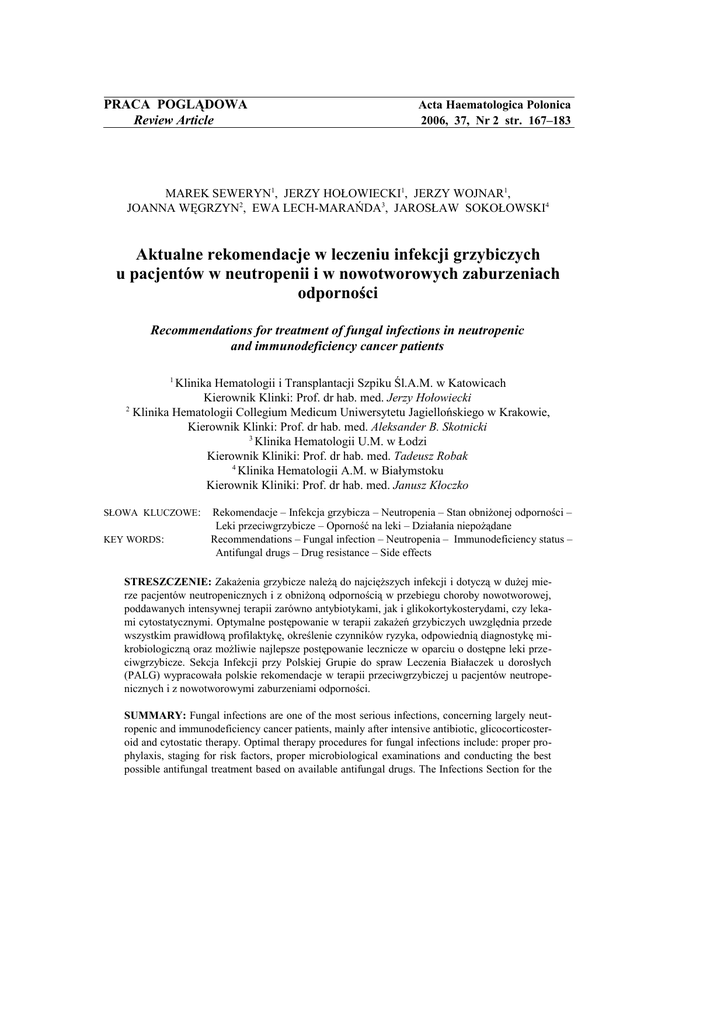 PRACA POGLĄDOWA Review Article Acta Haematologica Polonica 2006, 37, Nr 2 str. 167–183 MAREK SEWERYN1, JERZY HOŁOWIECKI1, JERZY WOJNAR1, JOANNA WĘGRZYN2, EWA LECH-MARAŃDA3, JAROSŁAW SOKOŁOWSKI4 Aktualne rekomendacje w leczeniu infekcji grzybiczych u pacjentów w neutropenii i w nowotworowych zaburzeniach odporności Recommendations for treatment of fungal infections in neutropenic and immunodeficiency cancer patients 1 Klinika Hematologii i Transplantacji Szpiku Śl.A.M. w Katowicach Kierownik Klinki: Prof. dr hab. med. Jerzy Hołowiecki 2 Klinika Hematologii Collegium Medicum Uniwersytetu Jagiellońskiego w Krakowie, Kierownik Klinki: Prof. dr hab. med. Aleksander B. Skotnicki 3 Klinika Hematologii U.M. w Łodzi Kierownik Kliniki: Prof. dr hab. med. Tadeusz Robak 4 Klinika Hematologii A.M. w Białymstoku Kierownik Kliniki: Prof. dr hab. med. Janusz Kłoczko SŁOWA KLUCZOWE: KEY WORDS: Rekomendacje – Infekcja grzybicza – Neutropenia – Stan obniżonej odporności – Leki przeciwgrzybicze – Oporność na leki – Działania niepożądane Recommendations – Fungal infection – Neutropenia – Immunodeficiency status – Antifungal drugs – Drug resistance – Side effects STRESZCZENIE: Zakażenia grzybicze należą do najcięższych infekcji i dotyczą w dużej mierze pacjentów neutropenicznych i z obniżoną odpornością w przebiegu choroby nowotworowej, poddawanych intensywnej terapii zarówno antybiotykami, jak i glikokortykosterydami, czy lekami cytostatycznymi. Optymalne postępowanie w terapii zakażeń grzybiczych uwzględnia przede wszystkim prawidłową profilaktykę, określenie czynników ryzyka, odpowiednią diagnostykę mikrobiologiczną oraz możliwie najlepsze postępowanie lecznicze w oparciu o dostępne leki przeciwgrzybicze. Sekcja Infekcji przy Polskiej Grupie do spraw Leczenia Białaczek u dorosłych (PALG) wypracowała polskie rekomendacje w terapii przeciwgrzybiczej u pacjentów neutropenicznych i z nowotworowymi zaburzeniami odporności. SUMMARY: Fungal infections are one of the most serious infections, concerning largely neutropenic and immunodeficiency cancer patients, mainly after intensive antibiotic, glicocorticosteroid and cytostatic therapy. Optimal therapy procedures for fungal infections include: proper prophylaxis, staging for risk factors, proper microbiological examinations and conducting the best possible antifungal treatment based on available antifungal drugs. The Infections Section for the 168 M. SEWERYN i wsp. Polish Adult Leukaemia Group (PALG), has worked out Polish recommendations for antifungal therapy in neutropenic and immunodeficiency cancer patients. WSTĘP Zakażenia grzybicze stają się w ostatnim czasie coraz większym problemem terapeutycznym ze względu na częściej spotykane czynniki predysponujące do ciężko przebiegających infekcji. Wiele spośród stosowanych opcji terapeutycznych zawiera czynniki ryzyka sprzyjające rozwojowi oportunistycznych zakażeń grzybiczych. Pacjenci intensywnie leczeni antybiotykami, kortykosterydami, chemioterapią, pacjenci w neutropenii, w stanach immunosupresji po transplantacjach, zarówno narządowych, jak i szpiku kostnego, pacjenci z przewlekłymi chorobami wyniszczającymi i metabolicznymi są szczególnie predysponowani do wystąpienia ciężko przebiegających infekcji grzybiczych. Diagnostyka i terapia tego typu zakażeń jest wyjątkowo trudna ze względu na niedoszacowanie problemu nadkażeń i zespołów nakładania się objawów chorobowych oraz znacznie ograniczone w porównaniu do powikłań bakteryjnych, możliwości wyboru leków. CZYNNIKI RYZYKA Wśród czynników usposabiających do wystąpienia infekcji grzybiczej przede wszystkim wymienia się głęboką (<0,1 G/l) i długo trwającą (powyżej 10 dni) neutropenię, terapię glikokortykosterydami, szeroko zakresowe leczenie antybiotykami, stan immunosupresji spowodowany przez nowotworową chorobę podstawową i inne (Tabela 1). Choroba nowotworowa z jej zaburzeniami odporności nie tylko komórkowej, ale również i humoralnej sama w sobie predysponuje do wystąpienia groźnych dla życia fungemii. Zaburzenia odporności potęguje stosowanie glikokortykosteroidów, które wchodzą w skład wielu schematów leczniczych w hematoonkologii. Z czynników mających wpływ na wystąpienie ciężko przebiegających grzybic, obok już wspomnianej terapii przeciwnowotworowej i szerokozakresowej antybiotykoterapii, wymienić należy również długotrwałe stosowanie samych leków przeciwgrzybiczych np. flukonazolu, amfoterycyny B, które powodują selekcję opornych gatunków patogenów. Tabela 1. Czynniki ryzyka wystąpienia zakażeń grzybiczych Table 1. Risk factors for development of fungal infections Głęboka (<0,1G/l) i długo trwająca (>10dni) neutropenia Glikokortykoterapia i leczenie immunosupresyjne Intensywna antybiotykoterapia (np. stosowanie antybiotyków ponad 14 dni, poliantybiotykoterapia) Ogólnoustrojowa, przewlekła terapia flukonazolem, amfoterycyną B - ponad 7 dni Choroba przeszczep przeciwko gospodarzowi po allotransplantacji szpiku (ostra i przewlekła) Stan po przeszczepie narządowym (zwłaszcza w starszym wieku) Przewlekłe schorzenia wirusowe (np. CMV, HIV/AIDS) Kolonizacja przewodu pokarmowego opornymi postaciami grzybów (posiew) oraz zanieczyszczone otoczenie chorego (powietrze, pokarm) Aktualne rekomendacje w leczeniu infekcji grzybiczych 169 Oporna, lub nawrotowa postać choroby nowotworowej pacjenta Obecność centralnego cewnika naczyniowego Podejrzenie infekcji grzybiczej w wywiadzie Procedura transplantacji narządów oraz szpiku (przede wszystkim allogeniczna) niesie za sobą zwiększone ryzyko wystąpienia grzybic układowych. W wielu przypadkach choroby przeszczep przeciwko gospodarzowi po allotransplantacjach szpiku (zwłaszcza formy przewlekłej) mamy do czynienia z powikłaniami infekcyjnymi, które nierzadko mają etiologię grzybiczą. Schorzenia takie przebiegają pod ma