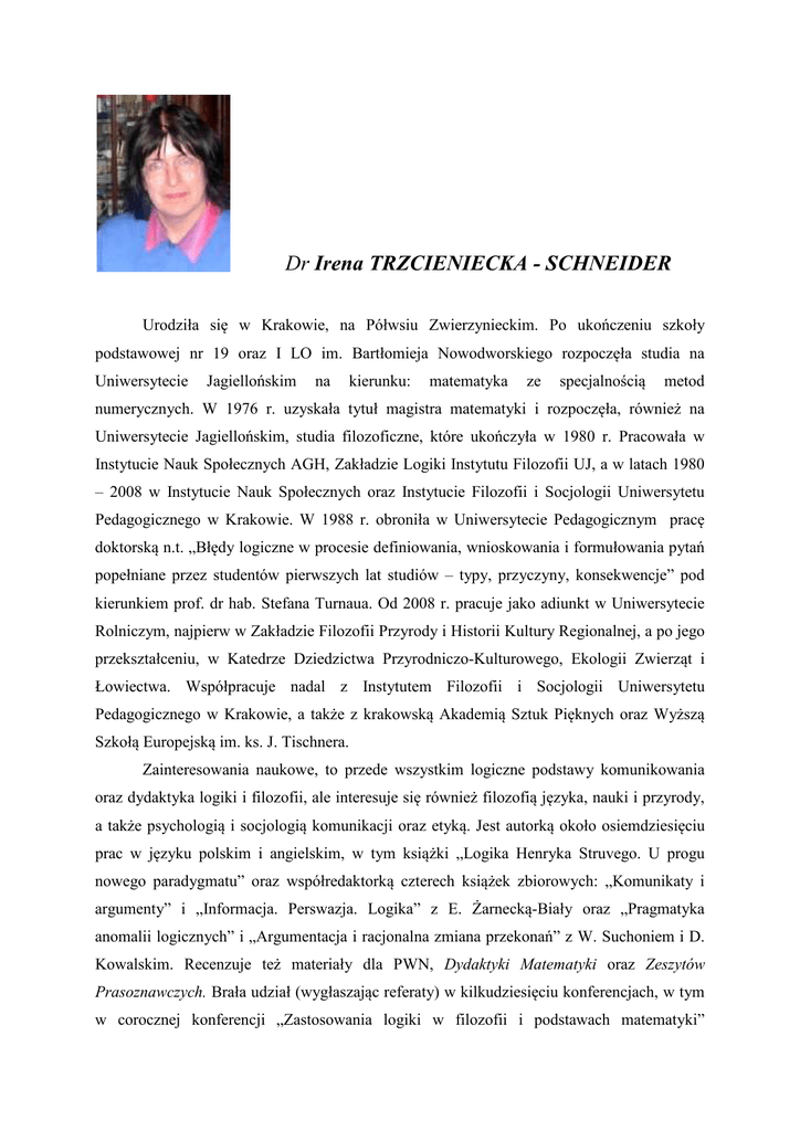 Dr Irena TRZCIENIECKA - SCHNEIDER Urodziła się w Krakowie, na Półwsiu Zwierzynieckim. Po ukończeniu szkoły podstawowej nr 19 oraz I LO im. Bartłomieja Nowodworskiego rozpoczęła studia na Uniwersytecie Jagiellońskim na kierunku: matematyka ze specjalnością metod numerycznych. W 1976 r. uzyskała tytuł magistra matematyki i rozpoczęła, również na Uniwersytecie Jagiellońskim, studia filozoficzne, które ukończyła w 1980 r. Pracowała w Instytucie Nauk Społecznych AGH, Zakładzie Logiki Instytutu Filozofii UJ, a w latach 1980 – 2008 w Instytucie Nauk Społecznych oraz Instytucie Filozofii i Socjologii Uniwersytetu Pedagogicznego w Krakowie. W 1988 r. obroniła w Uniwersytecie Pedagogicznym pracę doktorską n.t. „Błędy logiczne w procesie definiowania, wnioskowania i formułowania pytań popełniane przez studentów pierwszych lat studiów – typy, przyczyny, konsekwencje” pod kierunkiem prof. dr hab. Stefana Turnaua. Od 2008 r. pracuje jako adiunkt w Uniwersytecie Rolniczym, najpierw w Zakładzie Filozofii Przyrody i Historii Kultury Regionalnej, a po jego przekształceniu, w Katedrze Dziedzictwa Przyrodniczo-Kulturowego, Ekologii Zwierząt i Łowiectwa. Współpracuje nadal z Instytutem Filozofii i Socjologii Uniwersytetu Pedagogicznego w Krakowie, a także z krakowską Akademią Sztuk Pięknych oraz Wyższą Szkołą Europejską im. ks. J. Tischnera. Zainteresowania naukowe, to przede wszystkim logiczne podstawy komunikowania oraz dydaktyka logiki i filozofii, ale interesuje się również filozofią języka, nauki i przyrody, a także psychologią i socjologią komunikacji oraz etyką. Jest autorką około osiemdziesięciu prac w języku polskim i angielskim, w tym książki „Logika Henryka Struvego. U progu nowego paradygmatu” oraz współredaktorką czterech książek zbiorowych: „Komunikaty i argumenty” i „Informacja. Perswazja. Logika” z E. Żarnecką-Biały oraz „Pragmatyka anomalii logicznych” i „Argumentacja i racjonalna zmiana przekonań” z W. Suchoniem i D. Kowalskim. Recenzuje też materiały dla PWN, Dydaktyki Matematyki oraz Zeszytów Prasoznawczych. Brała udział (wygłaszając referaty) w kilkudziesięciu konferencjach, w tym w corocznej konferencji „Zastosowania logiki w filozofii i podstawach matematyki” organizowanej przez Uniwersytet Wrocławski i Uniwersytet Opolski, również cyklicznych konferencjach „Etyka w życiu publicznym” organizowanej w UPJPII, Ogólnopolskim Forum Etycznym, Konferencji Historii Logiki, a także w XIth International Congress of Logic, Methodology and Philosophy of Science w 1999 r. oraz w VIII Ogólnopolskim Zjeździe Filozoficznym w 2008 r. Dr Trzcieniecka-Schneider jest członkiem Polskiego Towarzystwa Logiki i Filozofii Nauki, Rady Naukowej serii wydawniczej Dialogikon, a także Komisji do Oceny Podręczników Polskiej Akademii Umiejętności. Od wielu lat bierze udział w pracach „Seminarium Profesor Ewy Żarneckiej-Biały” prowadzonego przez prof. Wojciecha Suchonia w Instytucie Filozofii UJ. Prywatnie interesuje się jeździectwem i psami myśliwskimi, muzyką, grafiką i literaturą, także kryminalną i fantasy. Oprócz jeździectwa uprawiała narciarstwo, szermierkę (floret) i karate. Kibicuje Cracovii.