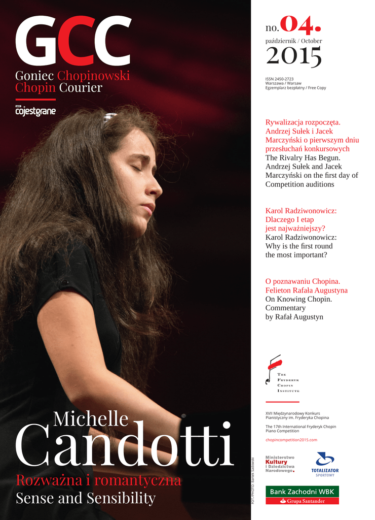 04. no. 2015 październik / October ISSN 2450-2723 Warszawa / Warsaw Egzemplarz bezpłatny / Free Copy Rywalizacja rozpoczęta. Andrzej Sułek i Jacek Marczyński o pierwszym dniu przesłuchań konkursowych The Rivalry Has Begun. Andrzej Sułek and Jacek Marczyński on the first day of Competition auditions Karol Radziwonowicz: Dlaczego I etap jest najważniejszy? Karol Radziwonowicz: Why is the first round the most important? O poznawaniu Chopina. Felieton Rafała Augustyna On Knowing Chopin. Commentary by Rafał Augustyn Michelle Rozważna i romantyczna Sense and Sensibility The 17th International Fryderyk Chopin Piano Competition chopincompetition2015.com FOT./PHOTO: Bartek Sadowski Candotti XVII Międzynarodowy Konkurs Pianistyczny im. Fryderyka Chopina Wydawca/Publisher: Narodowy Instytut Fryderyka Chopina Redaktor Naczelna/Editor -in-Chief: Agata Kwiecińska Redaktor Prowadząca /Commissioning Editor: Dorota Kozińska Redakcja/Editorial Staff: Magdalena Romańska, Krzysztof Komarnicki Projekt graficzny/Layout: Joanna Cymkiewicz (INFOR IT) Tłumacze/Translators: Cara Thornton, Michał Szostało Skład/DTP: Agora S.A. Korekta/Proofreading: Agora S.A. Druk/Print: Perfekt S.A. F jak Fazioli Fazioli jest bardzo młodą firmą w porównaniu z innymi producentami fortepianów – w przyszłym roku będziemy obchodzić 35-lecie istnienia. Założyciel wytwórni, Paolo Fazioli, nadal stoi na jej czele. Wiele nas wyróżnia na tle konkurentów. Przede wszystkim skala działalności – jesteśmy niewielkim przedsiębiorstwem. Dla porównania: Steinway produkuje 25 razy więcej instrumentów. Do dziś powstało niespełna 2500 instrumentów Fazioli. Steinway wytwarza tyle fortepianów w ciągu roku. / Morning session 10.00 Aljoša Jurinić Chorwacja/Croatia 10.25 Joo-Yeon Ka Korea Płd./South Korea Gdybym miał porównać fortepiany Fazioli do jednego z żywiołów, wybrałbym powietrze. Mówiliśmy o czystości dźwięku naszych fortepianów. Czystość, przejrzystość są bardzo ważne – i te cechy ma właśnie powietrze. 13.00 Dinara Klinton F for Fazioli GCC Goniec Chopinowski / Chopin Courier Sesja poranna Nasze instrumenty są jedyne w swoim rodzaju: Fazioli założył firmę dlatego, że był niezadowolony z fortepianów dostępnych w latach 80. Zależało mu na instrumencie o bardzo czystym dźwięku, w którego widmie nie ma przypadkowych alikwotów. Chciał zadbać o mechanikę umożliwiającą maksymalną płynność gry. Fortepiany Fazioli nie są więc imitacją żadnego z istniejących wcześniej instrumentów, to bardzo ważne. 130 lat temu Steinway ustanowił standard w budowie fortepianów i wielu producentów poszło jego śladem. Fazioli nigdy tego nie chciał, przeciwnie, postanowił znaleźć własną, wyjątkową ścieżkę. Rezultaty można ocenić także w Warszawie. Ponieważ jesteśmy małą firmą, wielu pianistów styka się z naszym instrumentem po raz pierwszy i dlatego rzadko decyduje się na wybór faziolego. Na to jesteśmy przygotowani. W poprzednim Konkursie Chopinowskim jedynie czworo uczestników grało na faziolim. Ci, którzy decydują się grać na naszych instrumentach, są zwykle ludźmi nietuzinkowymi. Alec Weil, dyrektor naczelny Fazioli Pianoforti Co Ltd Wysłuchał Krzysztof Komarnicki 2 Harmonogram dnia / Schedule of the day In comparison with other companies, Fazioli is a very young company: next year it will be 35 years old. The founder, Paolo Fazioli, is still President of the company. There are many things about it that are unique. First, it is very small in comparison with the other pianos on the stage. For instance, the number of units Fazioli produces: the next biggest company is Steinway and Steinway produces 25 times as many pianos. Fazioli has produced less than 2,500 pianos up to now. Steinway produces about that many in a single year nowadays. 10.50 Honggi Kim Korea Płd./South Korea 11.15 Su Yeon Kim Korea Płd./South Korea 12.10 Yedam Kim Korea Płd./South Korea 12.35 Yurika Kimura Japonia/Japan Ukraina/Ukraine 13.25 Aimi Kobayashi Japonia/Japan Sesja popołudniowa / Afternoon session 17.00 Qi Kong Chiny/China 17.25 Marek Kozák Czechy/Czech Republic 17.50 Łukasz Krupiński Polska/Poland The piano itself is very unique, because basically Paolo Fazioli conceived the Fazioli piano out of dissatisfaction with current instruments available on the market. He wanted the piano to have a very clear tone, where the overtones are very controlled, with very fluid action. Fazioli is not an imitation of any other instrument – that is very important. To be very honest, Steinway set a very high standard about 130 years ago and many piano manufacturers have tried to go in this direction. The Fazioli piano is not intended to do that; it is intended to do something very individual, very special. And you see that, for instance, here. Because it is a very small company, many pianists are not familiar with this piano. So as a result, the number of people that select Fazioli pianos during competitions is always very few. We know this. During the last competition, there were only four participants. But those who select it are usually very special people. If Fazioli were an element it would be air. Because if we talk about the Fazioli tone, it is a very clear one. Clarity of tone is so important – the air has this clarity. Alec Weil, Managing Director, Fazioli Pianoforti Co. Ltd. Recorded by Krzysztof Komarnicki 18.15 Krzysztof Książek Polska/Poland 19.10 Rachel Naomi Kudo Stany Zjednoczone/USA 19.35 Kate Liu Stany Zjednoczone/USA 20.00 Eric Lu Stany Zjednoczone/USA 20.25 Tian Lu Chiny/China Recenzje / Reviews Innych problemów nastręczają pianistom Chopinowskie wielkie formy. Tu musi dojść do głosu umiejętność budowania wielowątkowej, wymykającej się schematom narracji. Z Polaków najlepiej z tym sobie poradził Byrdy. Michelle Candotti pokazała naturalną muzykalność i kulturę gry. Zaproponowana przez nią Ballada F-dur zyskałab
