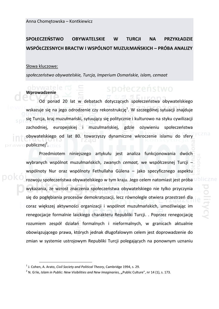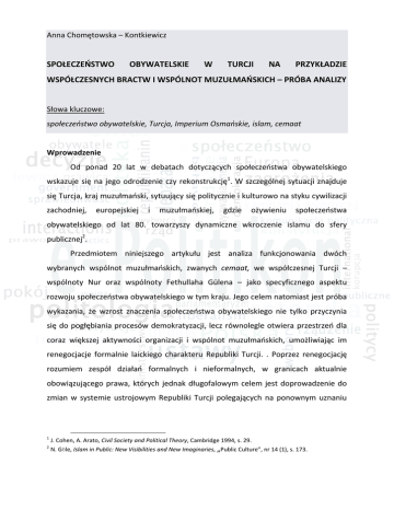Anna Chomętowska – Kontkiewicz SPOŁECZEOSTWO OBYWATELSKIE W TURCJI NA PRZYKŁADZIE WSPÓŁCZESNYCH BRACTW I WSPÓLNOT MUZUŁMAOSKICH – PRÓBA ANALIZY Słowa kluczowe: społeczeostwo obywatelskie, Turcja, Imperium Osmaoskie, islam, cemaat Wprowadzenie Od ponad 20 lat w debatach dotyczących społeczeostwa obywatelskiego wskazuje się na jego odrodzenie czy rekonstrukcję1. W szczególnej sytuacji znajduje się Turcja, kraj muzułmaoski, sytuujący się politycznie i kulturowo na styku cywilizacji zachodniej, europejskiej i muzułmaoskiej, gdzie ożywieniu społeczeostwa obywatelskiego od lat 80. towarzyszy dynamiczne wkroczenie islamu do sfery publicznej2. Przedmiotem niniejszego artykułu jest analiza funkcjonowania dwóch wybranych wspólnot muzułmaoskich, zwanych cemaat, we współczesnej Turcji – wspólnoty Nur oraz wspólnoty Fethullaha Gülena – jako specyficznego aspektu rozwoju społeczeostwa obywatelskiego w tym kraju. Jego celem natomiast jest próba wykazania, że wzrost znaczenia społeczeostwa obywatelskiego nie tylko przyczynia się do pogłębiania procesów demokratyzacji, lecz równolegle otwiera przestrzeo dla coraz większej aktywności organizacji i wspólnot muzułmaoskich, umożliwiając im renegocjacje formalnie laickiego charakteru Republiki Turcji. . Poprzez renegocjację rozumiem zespół działao formalnych i nieformalnych, w granicach aktualnie obowiązującego prawa, których jednak długofalowym celem jest doprowadzenie do zmian w systemie ustrojowym Republiki Turcji polegających na ponownym uznaniu 1 J. Cohen, A. Arato, Civil Society and Political Theory, Cambridge 1994, s. 29. 2 N. Gӧle, Islam in Public: New Visibilities and New Imaginaries, „Public Culture”, nr 14 (1), s. 173. nadrzędnej roli islamu jako zasadniczego elementu kształtowania stosunków politycznych i społecznych. Ayşe Kadıoĝlu w swoim artykule o tureckich organizacjach pozarządowych wskazała, w jaki sposób świeckie stowarzyszenia wykorzystują liberalną retorykę praw człowieka do walki o uznanie religijnych praw muzułmaoskiej większości3. W niniejszym artykule przedstawiona zostanie natomiast historia i aktualna działalnośd wspólnot muzułmaoskich, obu wywodzących się z pnia bractwa muzułmaoskiego nakszbandijja, których działalnośd pokazuje, w jaki sposób inspirowane religijnie oddolne inicjatywy społeczne stają się narzędziem mobilizacji społeczeostwa przeciwko antyreligijnej polityce paostwa. Idea społeczeostwa obywatelskiego w Europie i jego recepcja w społeczeostwach muzułmaoskich Pojęcie społeczeostwa obywatelskiego jest niejednoznaczne i trudne do zdefiniowania. Jerzy Szacki pisze, że jest ono w widoczny sposób „niedoteoretycznione” i „socjologicznie niedorozwinięte”4. Analizując problem społeczeostwa obywatelskiego w Turcji, ze względu na deklarowane przez większośd obywateli przywiązanie do islamu jako naczelnej wartości5, należy zwrócid uwagę na kwestionowaną przez wielu badaczy możliwośd przeniesienie idei społeczeostwa obywatelskiego na grunt społeczeostw muzułmaoskich. Ernest Gellner w swoim eseju o społeczeostwie obywatelskim twierdził, że w społeczeostwach muzułmaoskich nie mogą zaistnied procesy sekularyzacyjne6. A to właśnie proces stopniowego wyzwalania się paostwa spod wpływów religii, związany z postępem technologicznym i racjonalizacją, jest nieodzownym warunkiem istnienia wolności jednostek, bez której 3 A. Kadıoĝlu, Civil Society, Islam and Democracy in Turkey: A Study of Three Islamic Non-Governmental Organizations, „The Muslim World”, t. 95, nr 1. J. Szacki, Wstęp. Powrót idei społeczeostwa obywatelskiego [w:] J. Szacki (red.), Ani książę, ani kupiec: obywatel, Kraków-Warszawa 1997, s. 6. 5 B. Toprak, A. Carkoĝlu, Religion, Society and Politics in a Changing Turkey, Stambuł 2006. 6 E. Gellner, Conditions of Liberty: Civil Society and its Rivals, Londyn 1994, cyt. za: A. Kadıoĝlu, Civil Society, Islam and Democracy in Turkey: A Study of Three Islamic Non-Governmental Organizations, “The Muslim World”, t. 95, nr 1, s. 25. 211 4 nie może funkcjonowad społeczeostwo obywatelskie. W przekonaniu E. Gellnera, islam to właśnie rywal społeczeostwa obywatelskiego. Jerzy Szacki twierdzi, że rozważania nad problemem społeczeostwa obywatelskiego powinny zmierzad z jednej strony do uwolnienia idei społeczeostwa obywatelskiego od nadmiaru kontekstów ideologicznych, a z drugiej do sprecyzowania jej merytorycznej zawartości teoretycznej7. W konsekwencji, jedną z dróg, jaką powinny pójśd badania nad problemem społeczeostwa obywatelskiego, są studia monograficzne, w których mniej liczą się subtelne dociekania pojęciowe, ważniejszy jest natomiast drobiazgowy opis faktów, do jakich owa idea się odnosi. Innymi słowy, Jerzy Szacki sugeruje, aby od teorii przejśd do empirii, gdyż dopiero analiza funkcjonowania instytucji społeczeostwa obywatelskiego jest w stanie zoperacjonalizowad to pojęcie. W tym kontekście społeczeostwo obywatelskie tożsame jest z tzw. trzecim sektorem, reprezentującym prywatne podmioty działające na rzecz publicznych celów. Komplementarne wobec nich są kolejno pierwszy sektor, czyli rynek, gdzie zarówno podmioty, jak i cele działania są prywatne, oraz drugi sektor reprezentujący rząd. W tym ujęciu społeczeostwo obywatelskie przeciwstawione jest nie temu, co religijne lub wojskowe, ale przede wszystkim temu, co rządowe8. Szerokie ujęcie tego terminu sprawia, że do opisu instytucji będących tureckimi odpowiednikami europejskich organizacji pozarządowych9 można włączyd również instytucje związane z organizowaniem i wspieraniem życia religijnego. Wśród instytucji zasługujących na szczególną uwagę znajdują się wspólnoty muzułmaoskie, których korzenie wywodzą się z bardzo rozpowszechnionych w Imperium Osmaoskim bractw muzułmaoskich. Ich niezależnośd od paostwa, a nawet sprzeciw moralny wo