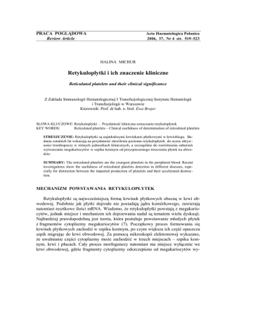 PRACA POGLĄDOWA Review Article Acta Haematologica Polonica 2006, 37, Nr 4 str. 519–523 HALINA MICHUR Retykulopłytki i ich znaczenie kliniczne Reticulated platelets and their clinical significance Z Zakładu Immunologii Hematologicznej I Transfuzjologicznej Instytutu Hematologii i Transfuzjologii w Warszawie Kierownik: Prof. dr hab. n. biol. Ewa Brojer SŁOWA KLUCZOWE: Retykulopłytki – Przydatność kliniczna oznaczania retykulopłytek KEY WORDS: Reticulated platelets – Clinical usefulness of determination of reticulated platelets STRESZCZENIE: Retykulopłytki są najmłodszymi krwinkami płytkowymi w krwiobiegu. Badania ostatnich lat wskazują na przydatność określenia poziomu retykulopłytek do oceny aktywności trombopoezy w różnych jednostkach klinicznych, a szczególnie do rozróżnienia zaburzeń wytwarzania megakariocytów w szpiku kostnym od przyspieszonego niszczenia płytek na obwodzie. SUMMARY: The reticulated platelets are the youngest platelets in the peripheral blood. Recent investigations show the usefulness of reticulated platelets detection in different diseases, especially for distinction between the impaired production of platelets and their accelerated destruction. MECHANIZM POWSTAWANIA RETYKULOPŁYTEK Retykulopłytki są najwcześniejszą formą krwinek płytkowych obecną w krwi obwodowej. Podobnie jak płytki dojrzałe nie posiadają jądra komórkowego, zawierają natomiast resztkowe ilości mRNA. Wiadomo, że retykulopłytki powstają z megakariocytów, jednak miejsce i mechanizm ich dojrzewania nadal są tematem wielu dyskusji. Najbardziej prawdopodobną jest teoria, która postuluje powstawanie młodych płytek z fragmentów cytoplazmy megakariocytów (7). Początkowy proces formowania się krwinek płytkowych zachodzi w szpiku kostnym, po czym większa ich część opuszcza szpik migrując do krwi obwodowej. Za pomocą mikroskopii elektronowej wykazano, że uwalnianie części cytoplazmy może zachodzić w trzech miejscach – szpiku kostnym, krwi i płucach. Cały proces morfogenezy natomiast ma miejsce wyłącznie we krwi obwodowej, gdzie fragmenty cytoplazmy odszczepione od megakariocytów wy- H. MICHUR 8 dłużają się, tworzą zgięcia, przyjmując ostatecznie kształt dysku, charakterystyczny dla płytek. Oznaczanie retykulopłytek Po raz pierwszy retykulopłytki zostały opisane w 1969 roku przez Ingrama i Coopersmitha, którzy zaobserwowali pojawienie się młodych płytek w krwiobiegu po dużych upustach krwi u psów (1). Wyizolowane płytki, podobnie do retykulocytów, barwiono błękitem metylenowym, co sugerowało obecność RNA w komórkach. 20 lat później do oznaczania retykulopłytek po raz pierwszy zastosowano oranż tiazolu, barwnika wiążącego kwasy nukleinowe, a w szczególności RNA (2, 3). Wysoka przenikalność oranżu tiazolu przez błonę komórkową żywych komórek oraz kilkutysięczny wzrost intensywności fluorescencji (3000) podczas wiązania się z RNA, umożliwiły dokładną identyfikację retykulopłytek metodą cytometrii przepływowej. Ze względu na różne metody oznaczania, zakres fizjologicznego poziomu retykulopłytek jest trudny do ustalenia (5, 13). Według Watanabe i wsp. stanowią one 0,98 ± 0,41% ogólnej liczby płytek u zdrowych osób (6). Różne wartości norm są podawane przez innych badaczy. Kienast i Schmitz określili poziom retykulopłytek, który wynosił 8,6 ± 2,8%, w badaniach Wanga i wsp. natomiast, był on w granicach 10,2 ± 3,4% (3, 16). Zastosowanie kliniczne badania poziomu retykulopłytek Podczas gdy nie ma zgodności pomiędzy różnymi autorami co do zakresu poziomu retykulopłytek w krwi obwodowej, obserwacje wskazują, że oznaczenie młodych płytek może być przydatne. Zastosowanie badania retykulopłytek w różnych jednostkach klinicznych zostało przedstawione w tabeli 1. Tabela 1. Wyniki badania poziomu retykulopłytek u pacjentów z różnym rozpoznaniem Lp Rozpoznanie 1 Małopłytkowość z towarzyszącą: - podwyższoną liczbą megakariocytów, - obniżoną liczbą megakariocytów w szpiku kostnym Transplantacja autologicznych komórek krwiotwórczych 2 3 Transplantacja autologicznych komórek krwiotwórczych Poziom retykułopłytek (%) 26,9± 10,9* 4,6 ± 3,7 8,6 ± 2,8 15,6 ± 3,9* 4,2 ± 1,9 11,5 – 3,4 ± 1,3 Nadpłytkowość 14,7 ± 10,1* 5 Hematologiczne choroby rozrostowe: - u pacjentów podczas chemioterapii - podczas odnowy szpiku kostnego 4,3 ± 1,89 23,3 ± 9,43* Zator tętnicy mózgowej Autor Kienast i Schmitz 1990 Romp i wsp. 1994 Richards i wsp. 1995 4 6 Kontrola Rinder i wsp. 1998 Macchi i wsp. 2002 4,62 ± 1,8 5,7 ± 2,4 Nakamura i wsp. 2002 Retykulopłytki i ich znaczenie kliniczne 7 8 Zawał serca 6,36 ± 2,71* Udar mózgu w przebiegu nadciśnieniowej encefalopatii 4,36 ± 2,04 Przewlekła małopłytkowość immunologiczna u dzieci: Liczba krw. płt. ‹ 50 ×109/L 10,35* › 50 ×109/L 2,2 Małopłytkowość immunologiczna 22,3* Zakrzepowa plamica małopłytkowa 17,2* * – dane istotne statystycznie w porównaniu z kontrolą 9 3,85± 1,47 Rajantie i wsp. 2004 1,5 Briggs i wsp. 2004 3,4 Ocena retykulopłytek wydaje się być pomocnym wskaźnikiem odpowiedzi trombopoetycznej u pacjentów z małopłytkowością (5, 8, 12, 18). Wzrost liczby retykulopłytek obserwuje się u pacjentów z małopłytkowością immunologiczną i towarzyszącą jej prawidłową lub podwyższoną liczbą megakariocytów w szpiku kostnym, natomiast spadek liczby retykulopłytek jest charakterystyczny dla pacjentów z małopłytkowością skojarzoną z obniżoną liczbą megakariocytów (3). Podobną zależność odnotowano także w grupie dzieci z małopłytkowością przewlekłą, u których wzrost retykulopłytek obserwowano tylko u pacjentów z liczbą płytek poniżej 50×109/L (19). Powyższe obserwacje potwierdzają koncepcję, według której poziom retykulopłytek we krwi obwodowej odzwierciedla aktywność trombopoetyczną pojawiającej się populacji megakari